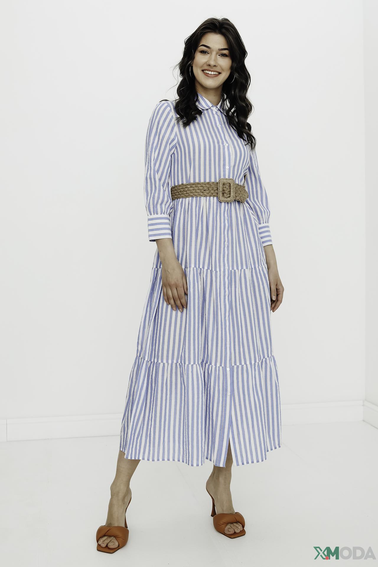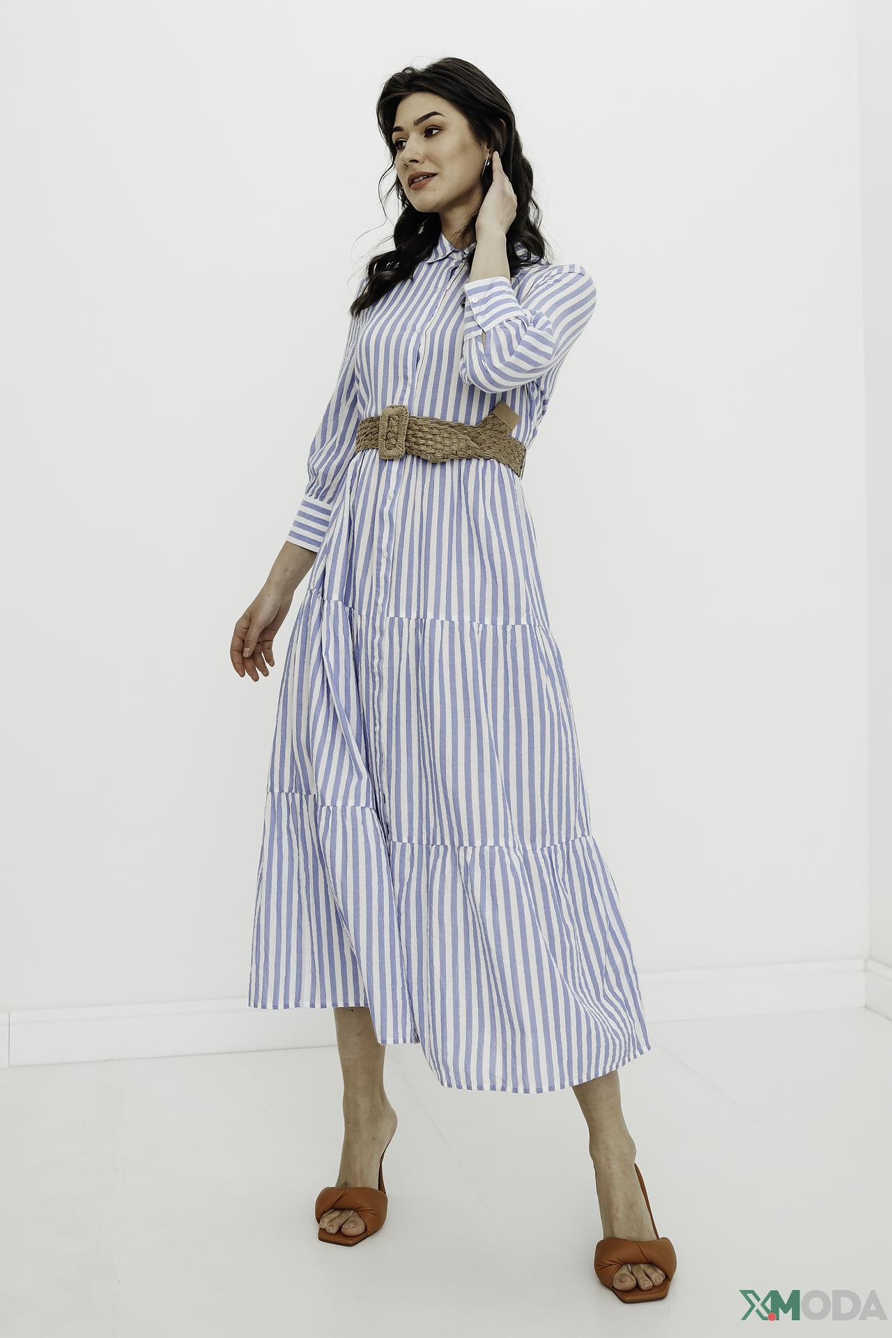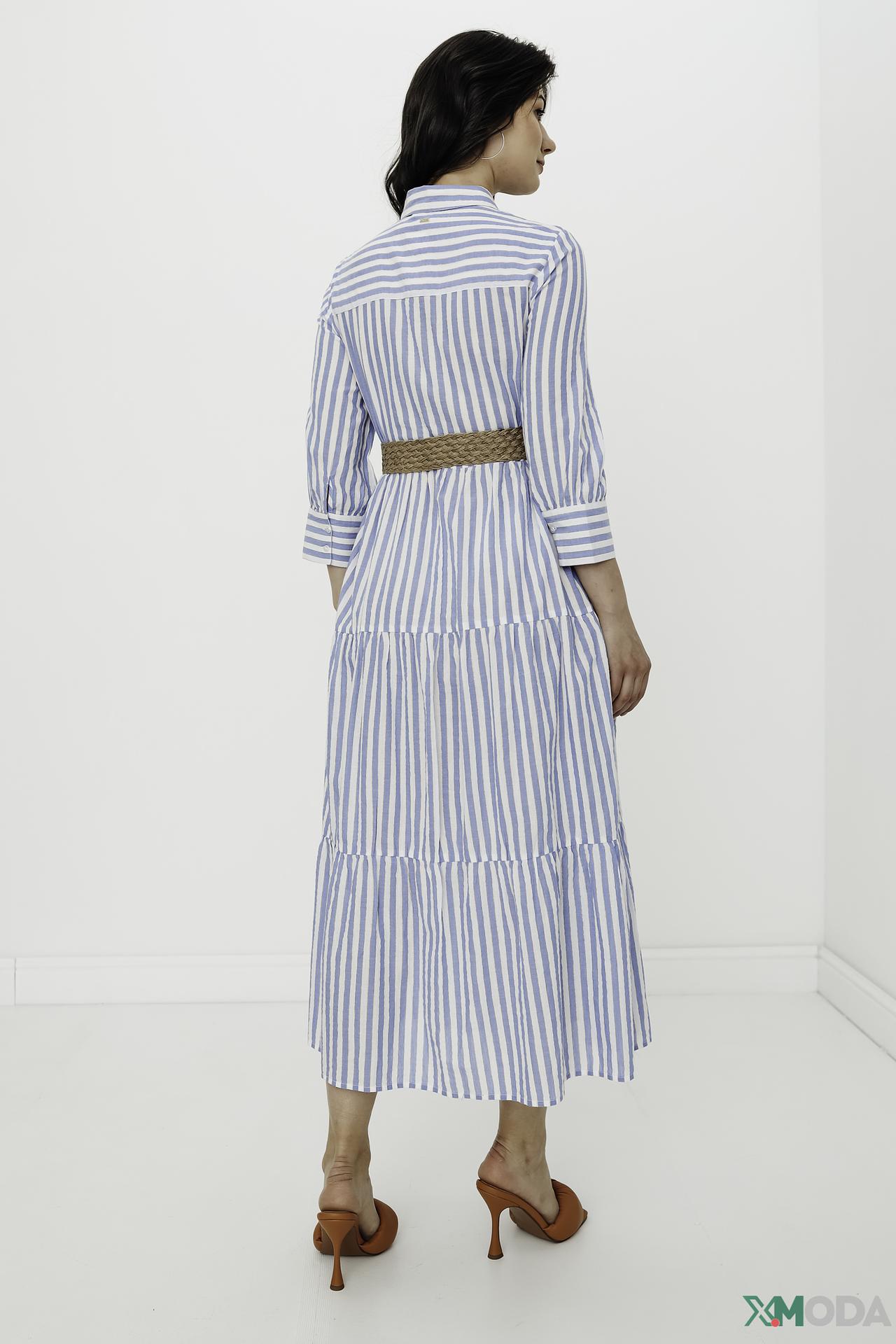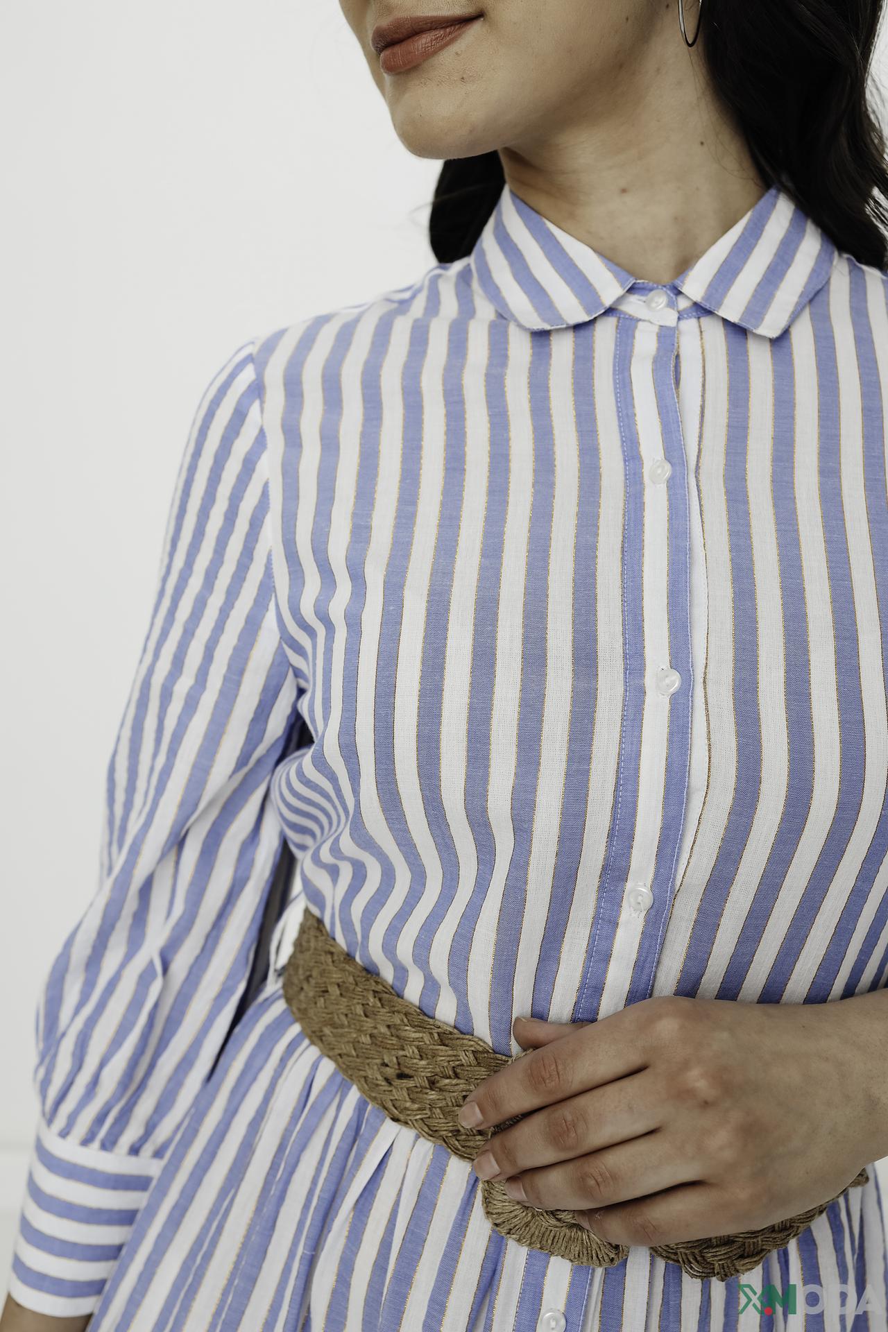 - Стильный дизайн: Элегантное платье-рубашка миди длины с классическим отложным воротником и функциональной пуговичной планкой. Вертикальные бело-голубые полосы визуально вытягивают силуэт, а тонкие золотистые вплетения добавляют изысканности.