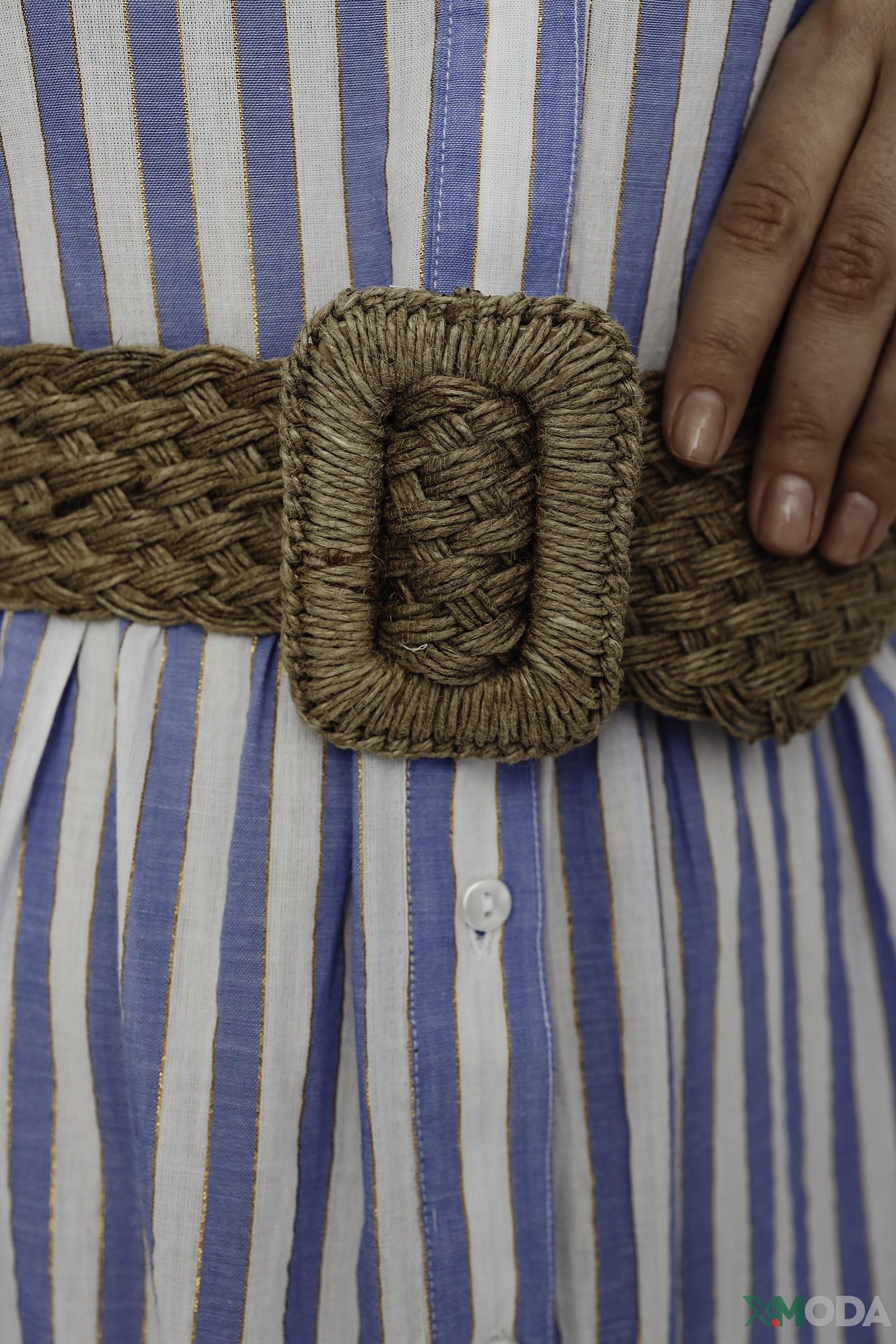 - Акцентный пояс: В комплекте идет плетеный пояс из натурального материала с крупной пряжкой, который выгодно подчеркивает талию. Пояс дополняет образ, придавая ему завершенный вид и возможность регулировать силуэт.