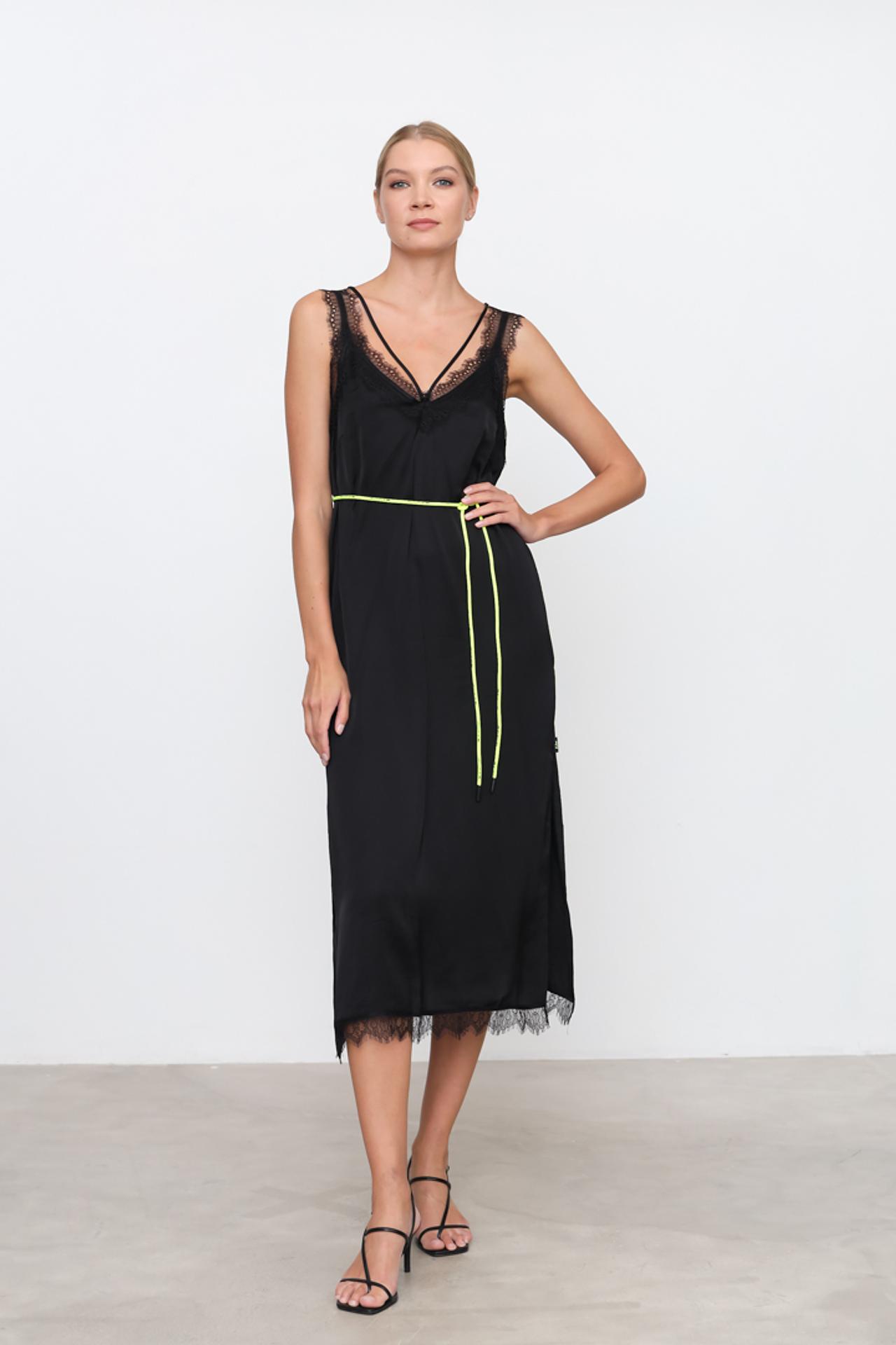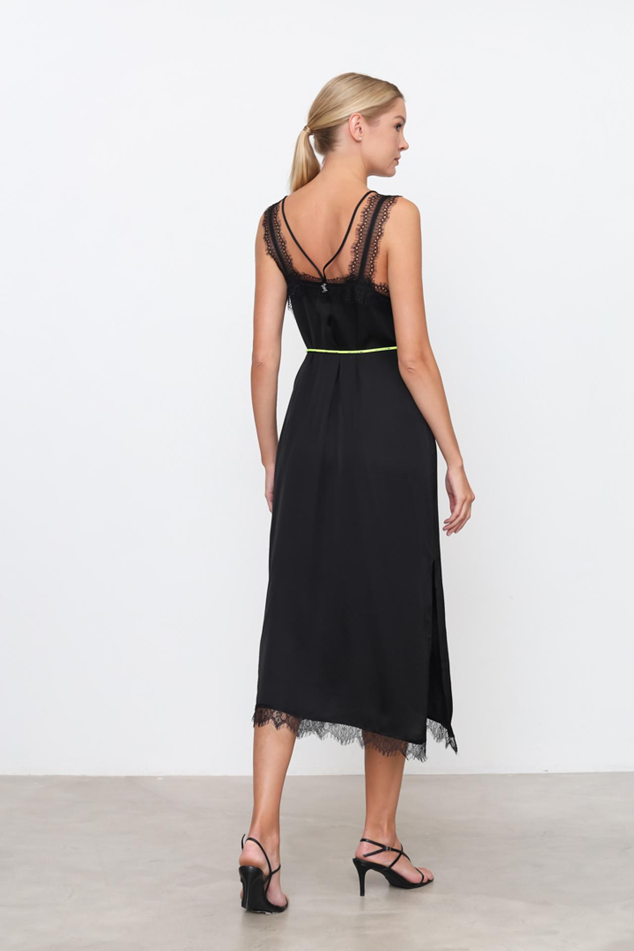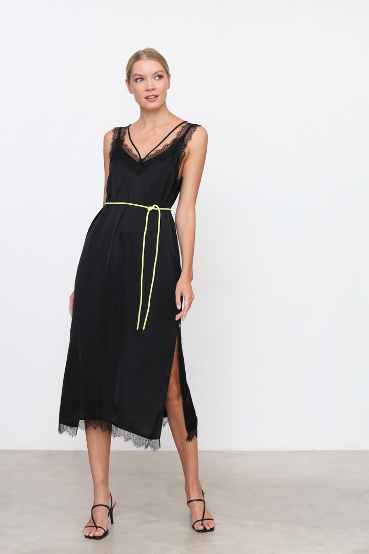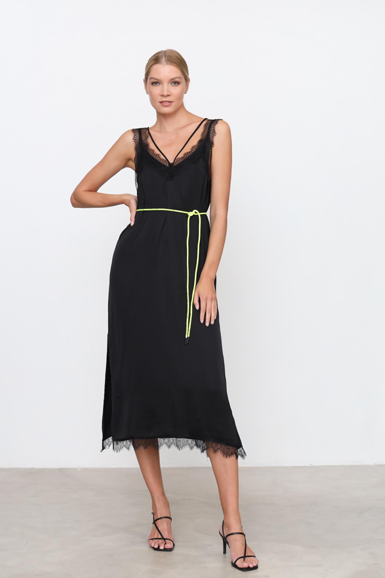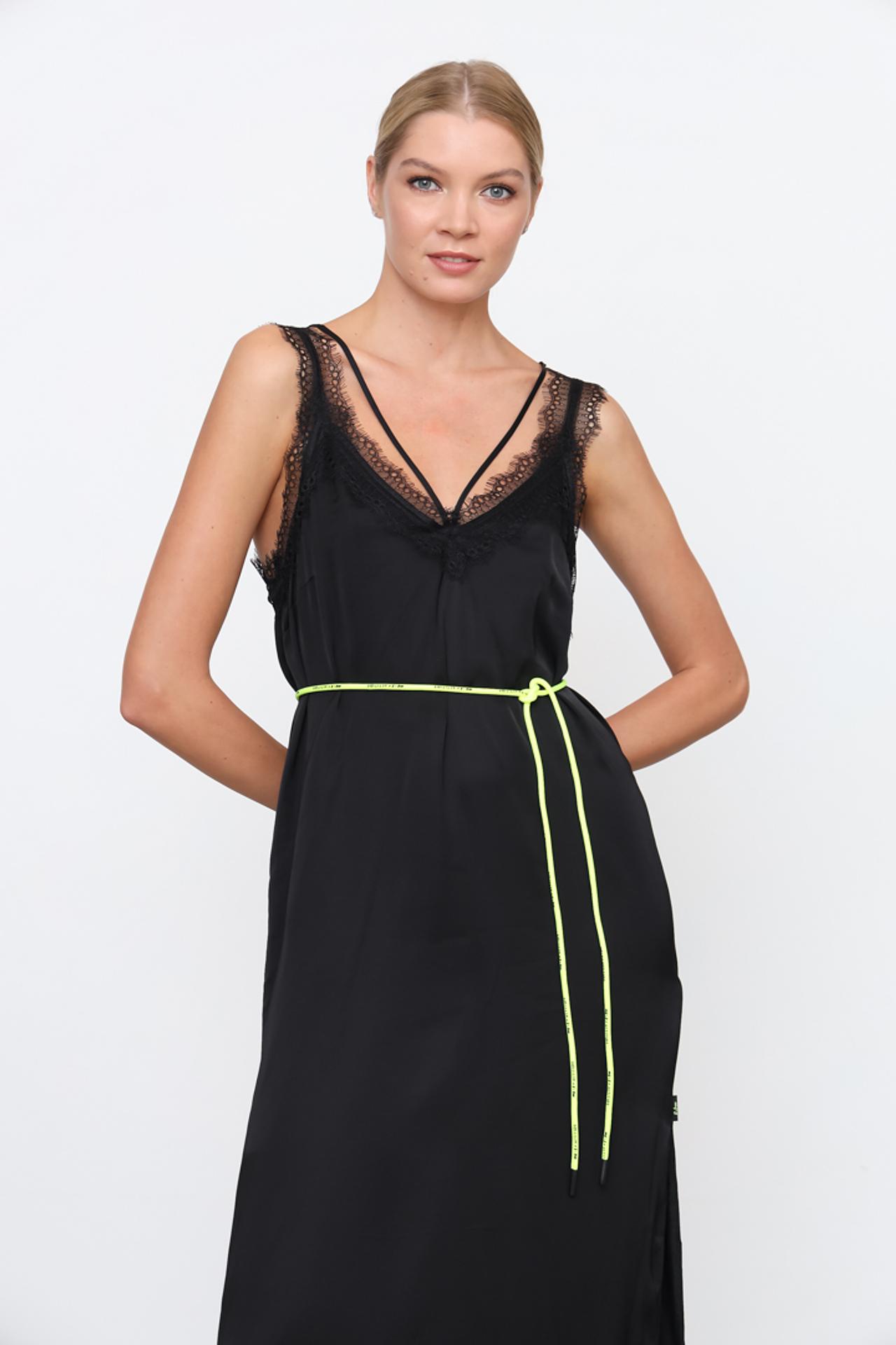 Элегантное платье-комбинация от Twin Set, выполненное из 100% вискозы. Модель длины миди с тонкими бретелями и V-образным вырезом, декорированным деликатным кружевом. Разрезы по бокам и съемный шнурок-пояс неонового цвета придают образу современный акцент.