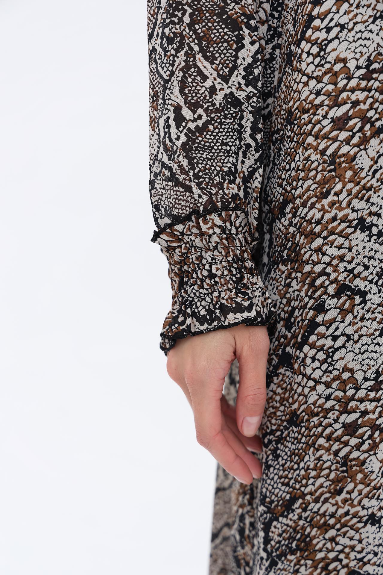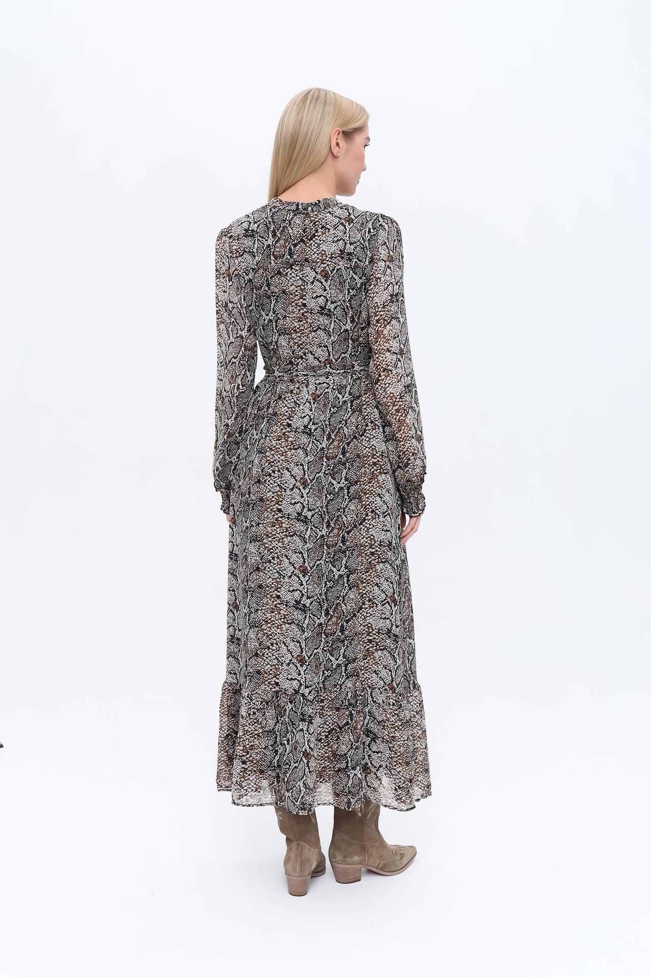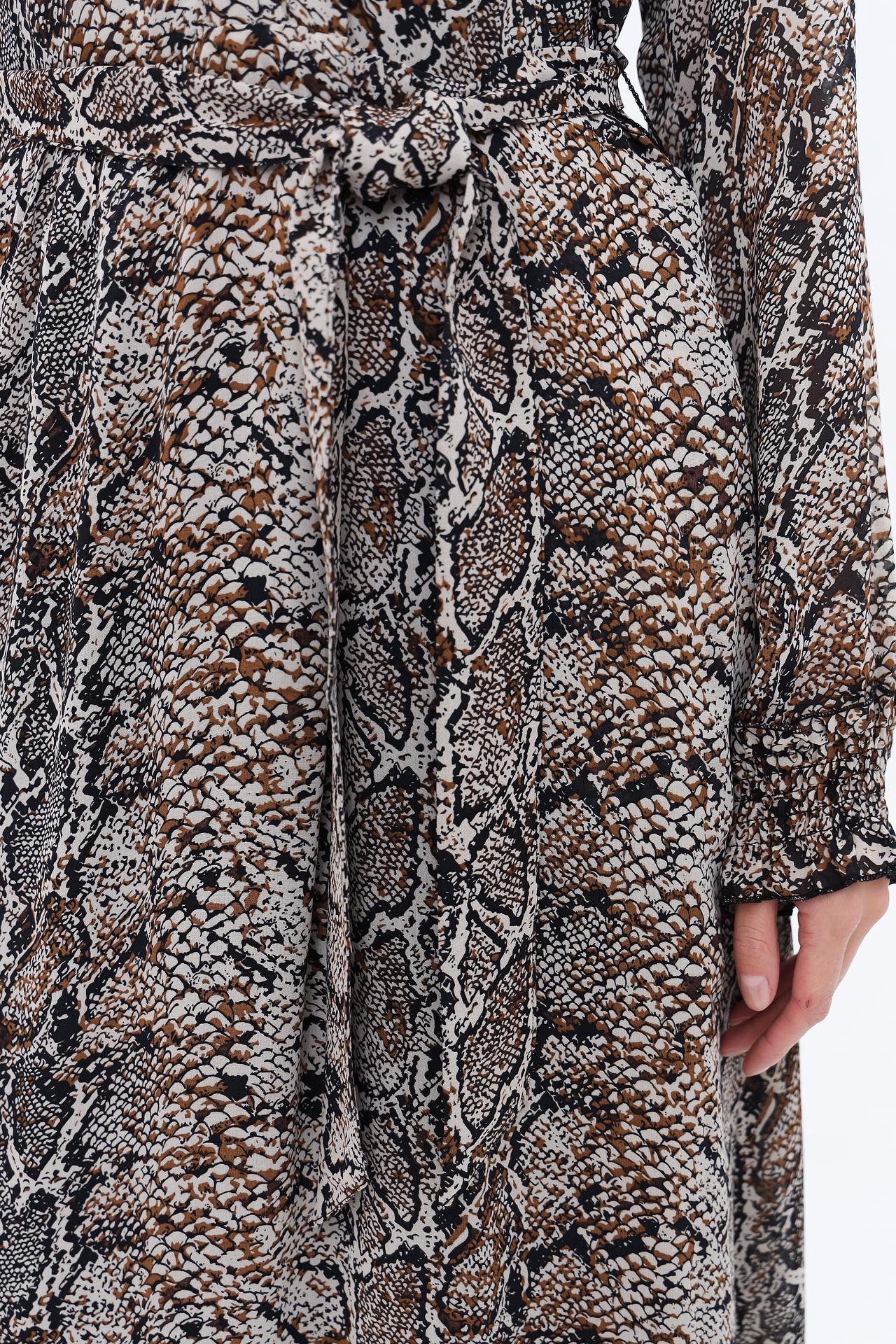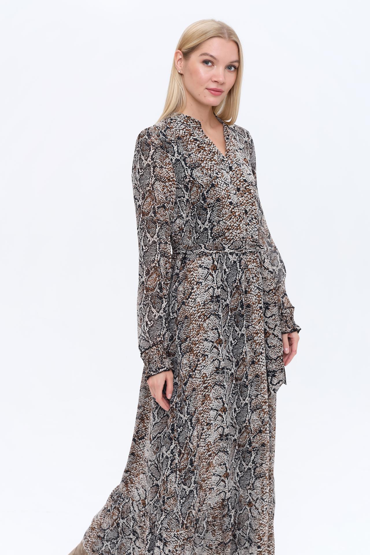 Платье выполнено в актуальном змеином принте, который придает ему выразительность и делает его центральным элементом вашего гардероба. Классический крой платья подчеркнет вашу фигуру и обеспечит свободу движений.