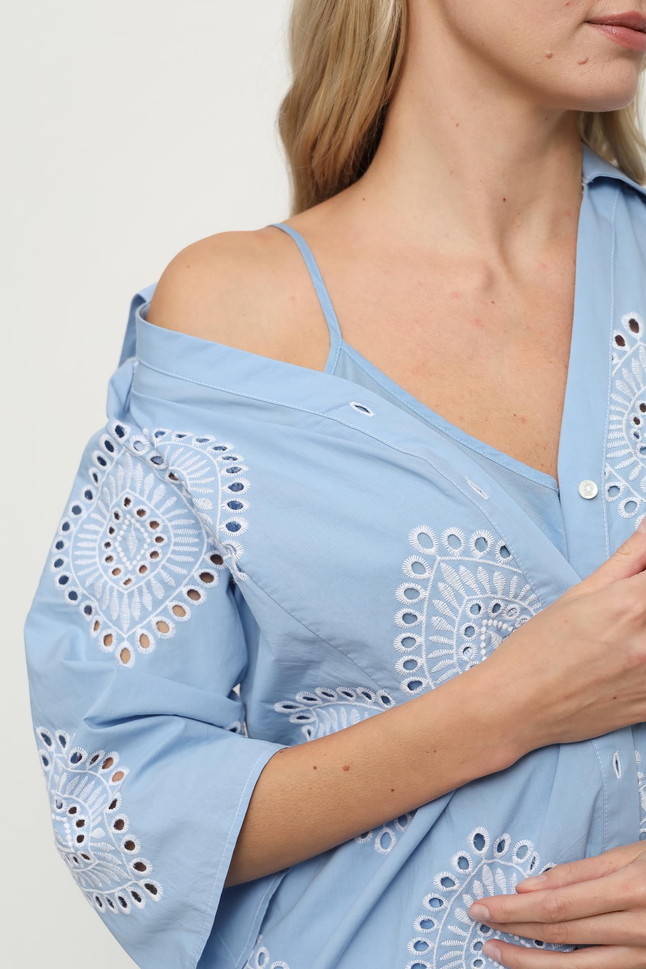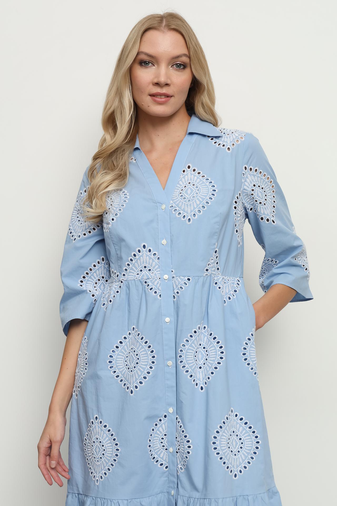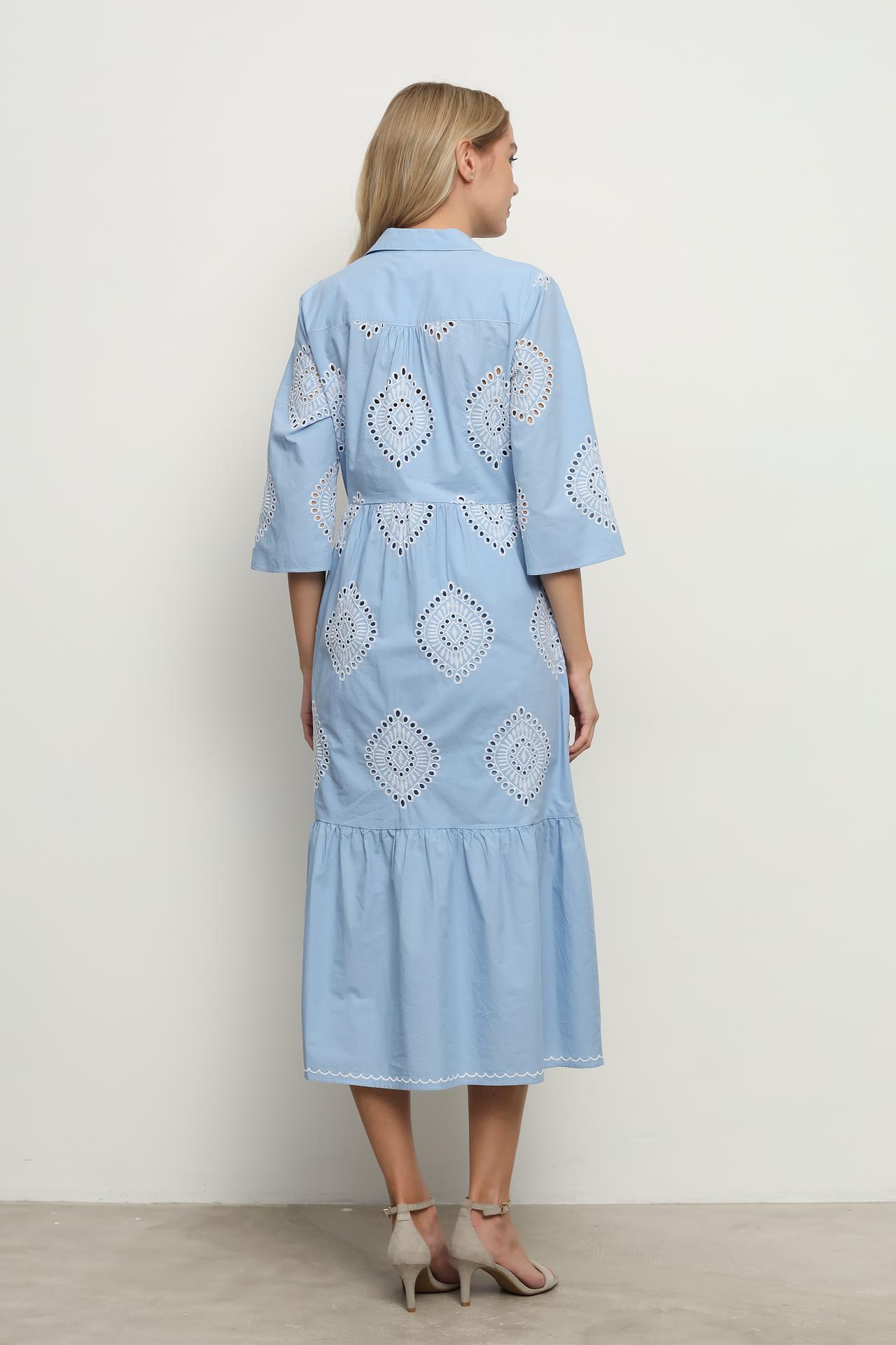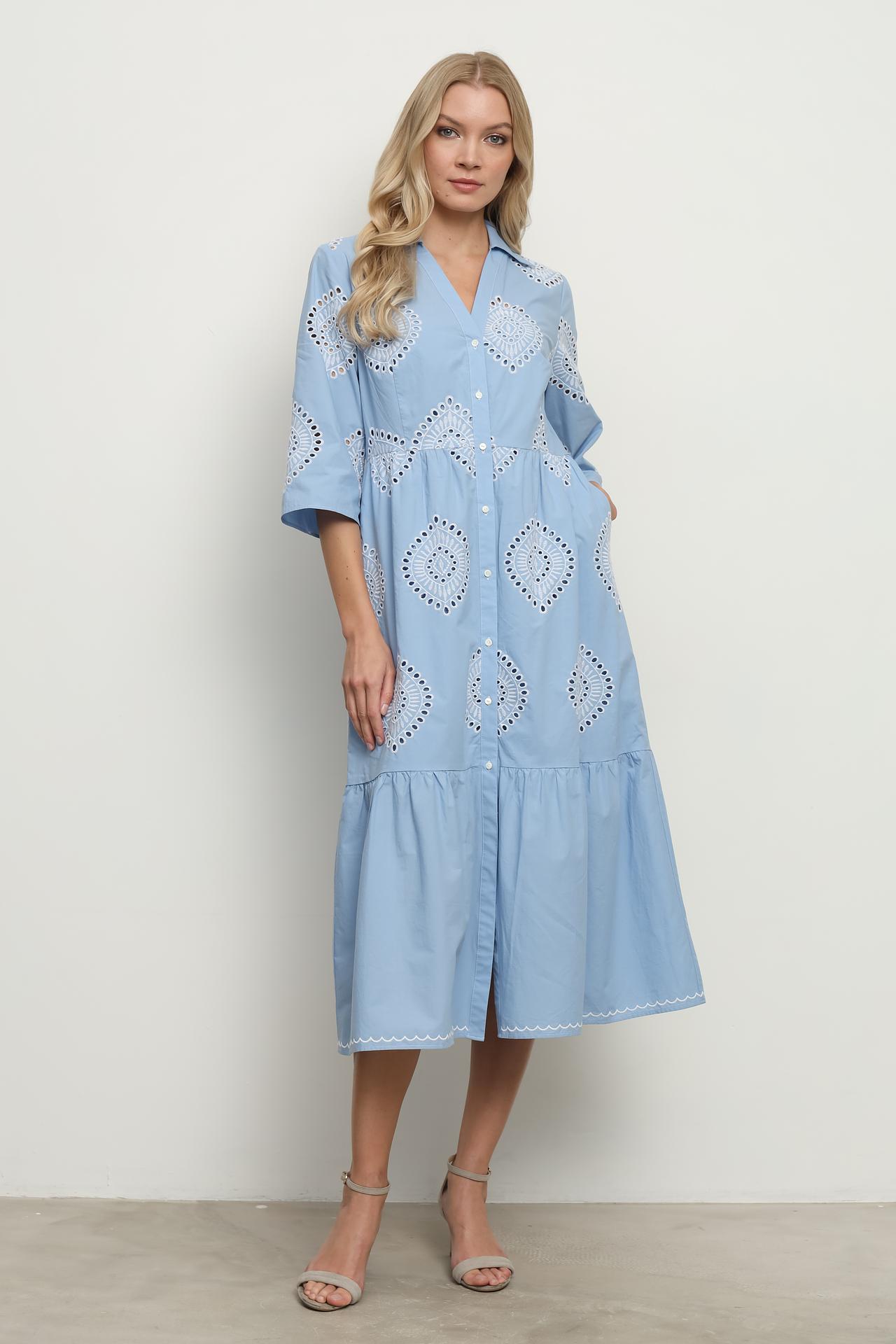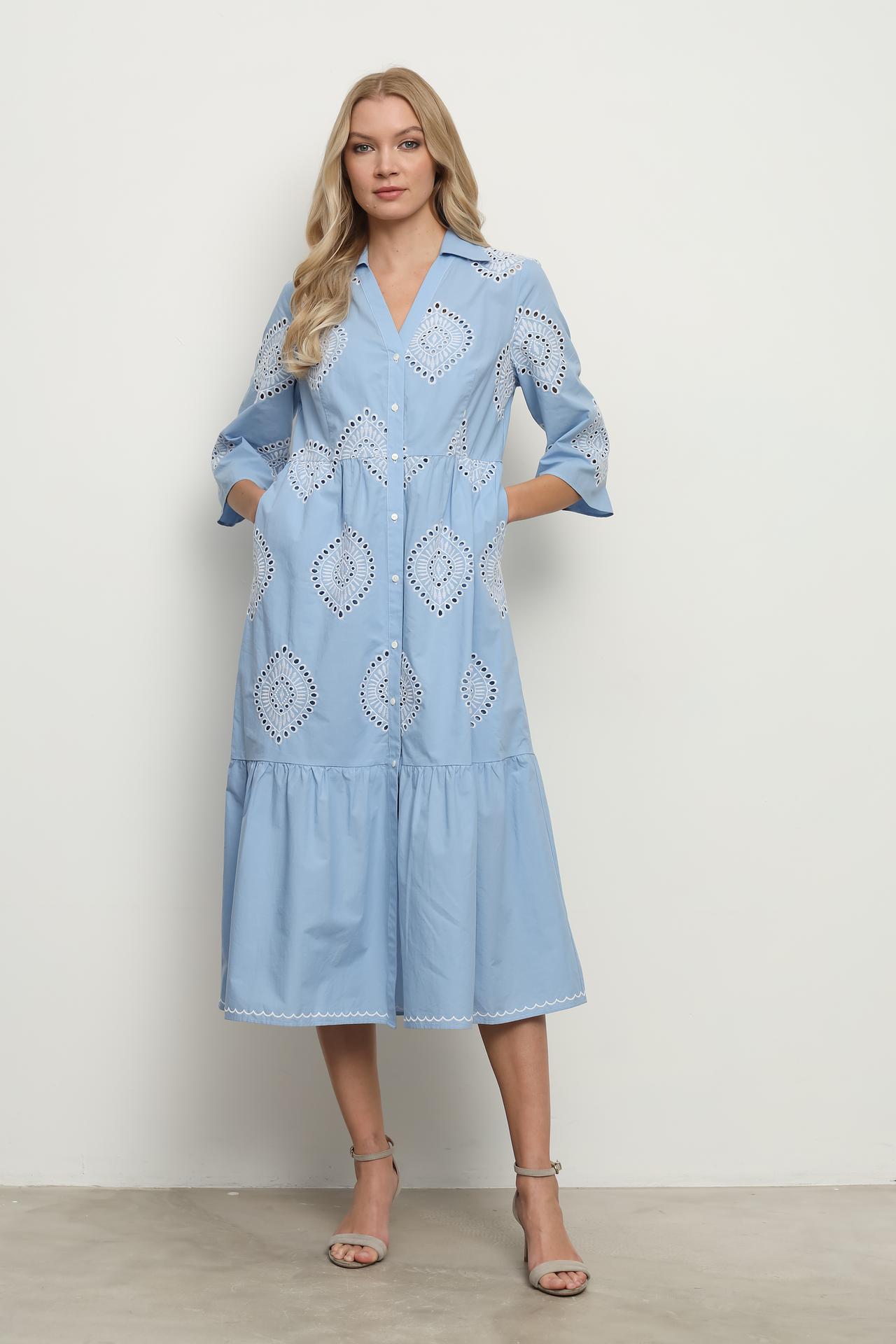 Платье представлено в нежном голубом цвете, который идеально подходит для создания женственного и утонченного образа. Декоративная вышивка по ткани добавляет платью элегантности и изысканности, делая его подходящим как для повседневной носки, так и для особых случаев. Такое платье - отличный выбор для тех, кто ценит стиль и комфорт.