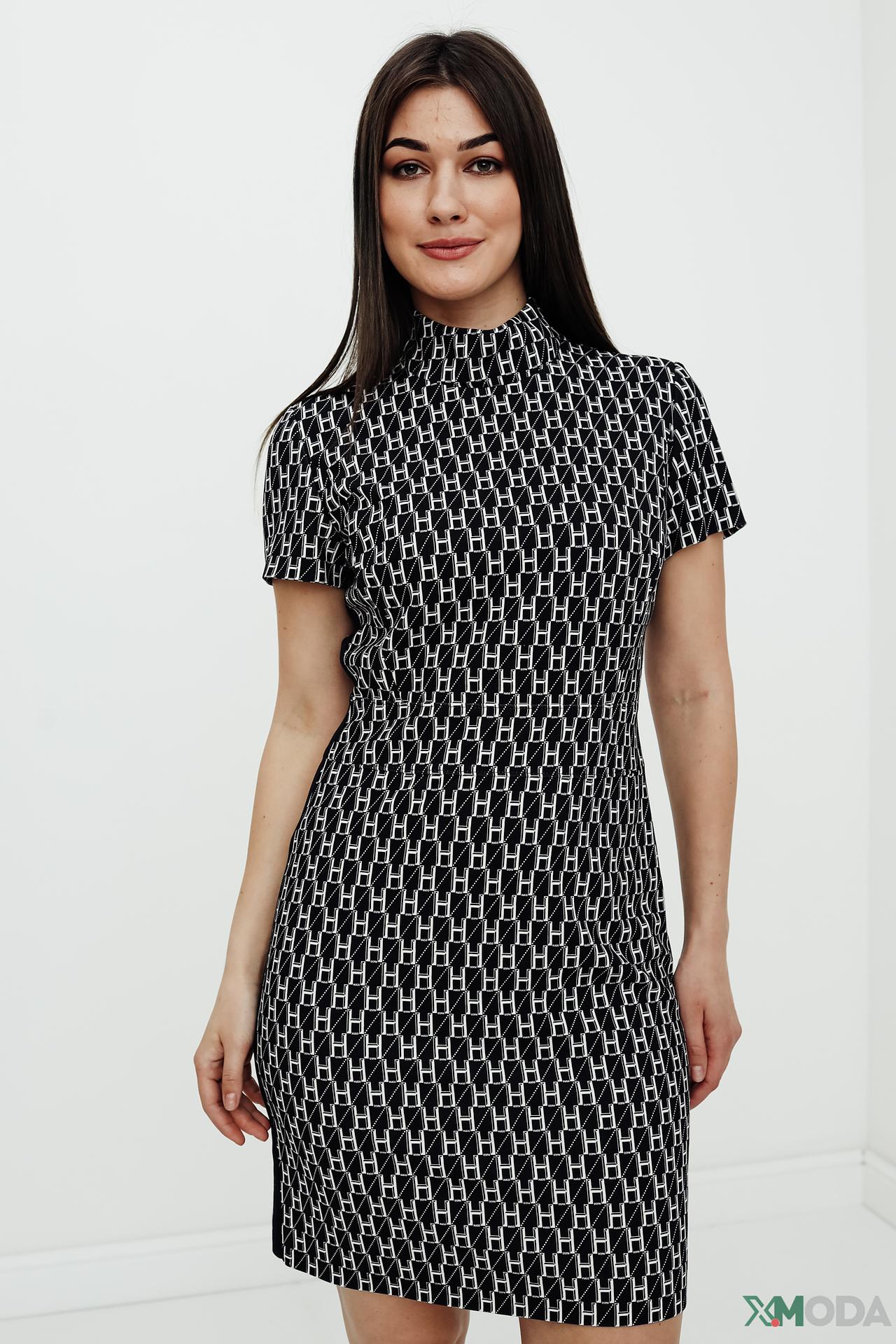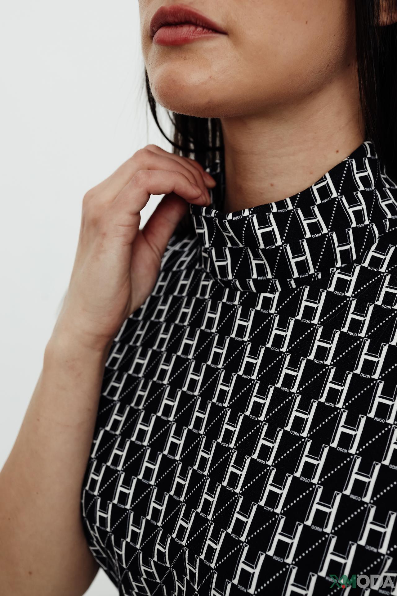 - Дизайн: Платье с коротким рукавом и высоким воротником-стойкой. Привлекательный геометрический принт в виде логотипа бренда покрывает всю поверхность изделия, делая его по-настоящему уникальным.