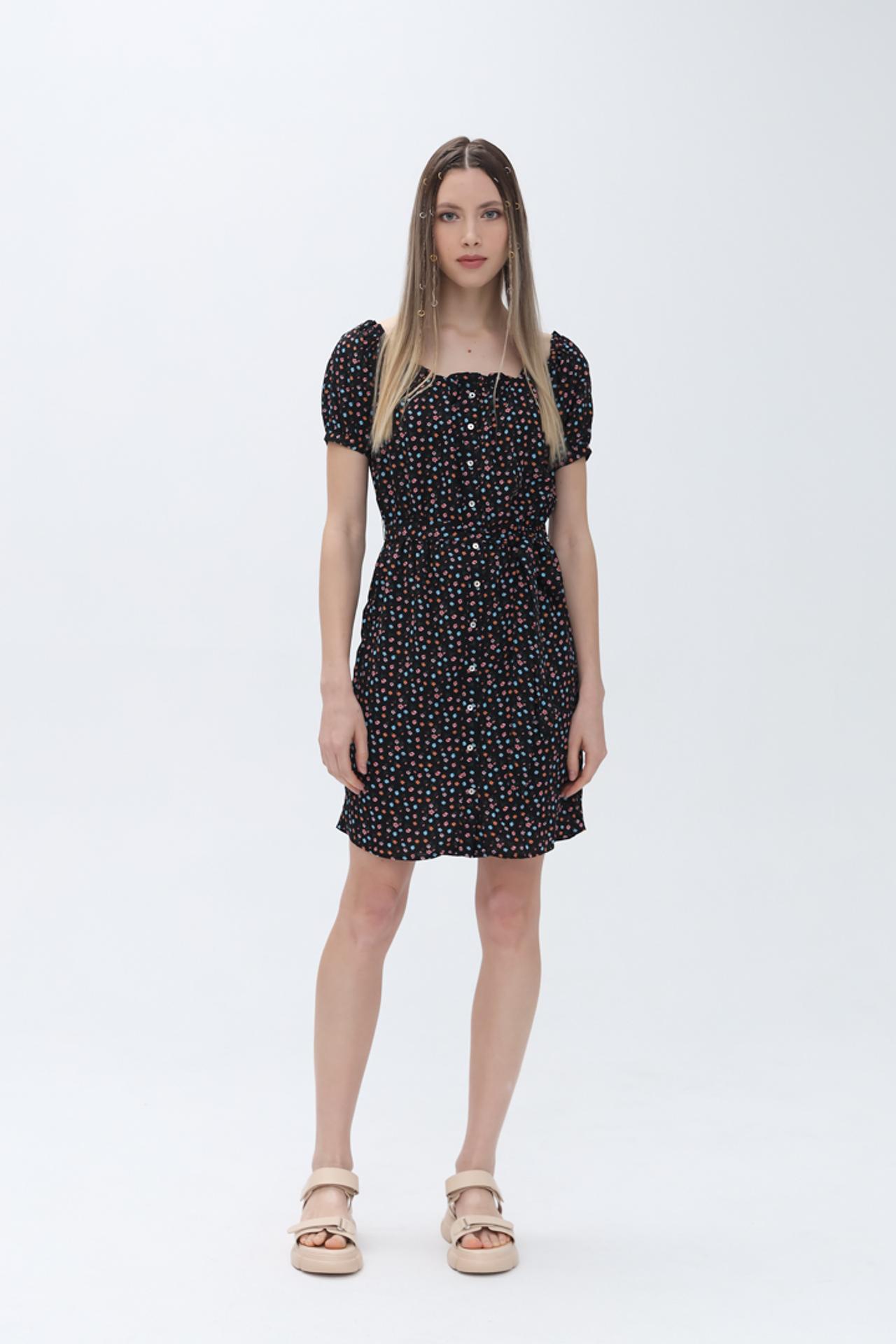 Изящное платье Alcott — идеальный выбор для создания романтичного образа. Черная основа дополнена ярким цветочным принтом, состоящим из мелких цветов розовых, голубых и оранжевых оттенков. Модель с квадратным вырезом и короткими рукавами-фонариками подчеркивает женственность. Пояс на талии акцентирует силуэт, а пуговицы по всей длине платья добавляют элегантности.