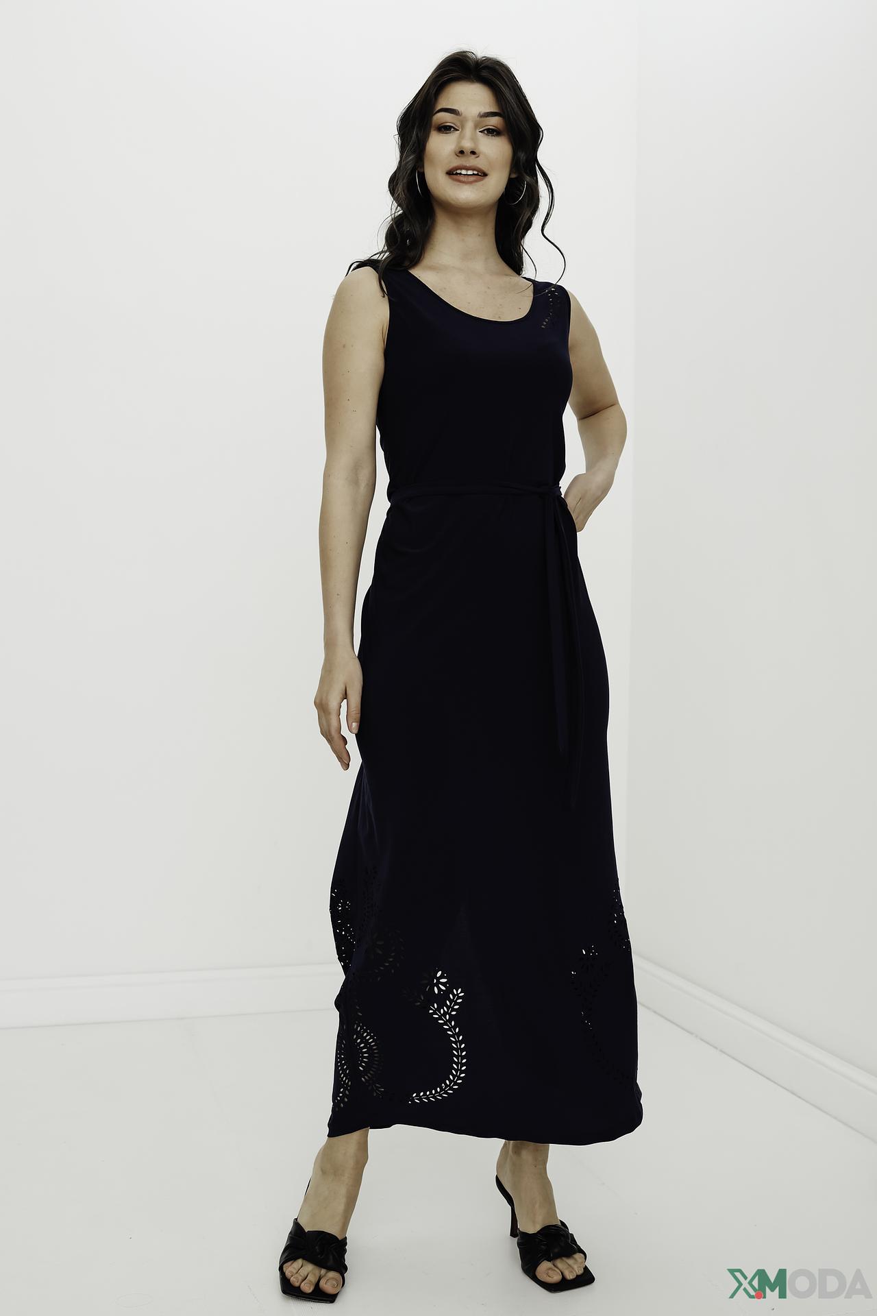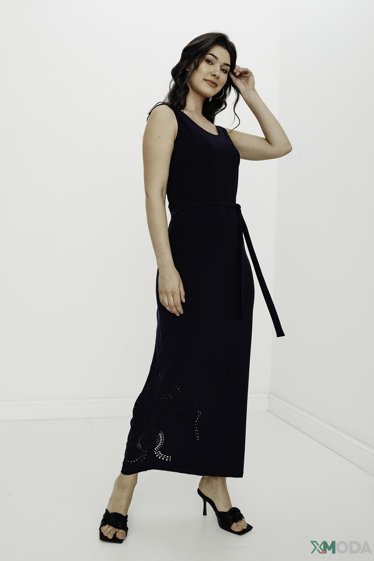 - Изысканный дизайн: Модель отличается круглым вырезом горловины и отсутствием рукавов, подчеркивая изящество плеч. Декоративные элементы в виде фигурной лазерной перфорации по низу изделия и у горловины придают платью особую легкость и уникальность, а драпировка на спине добавляет пикантности.