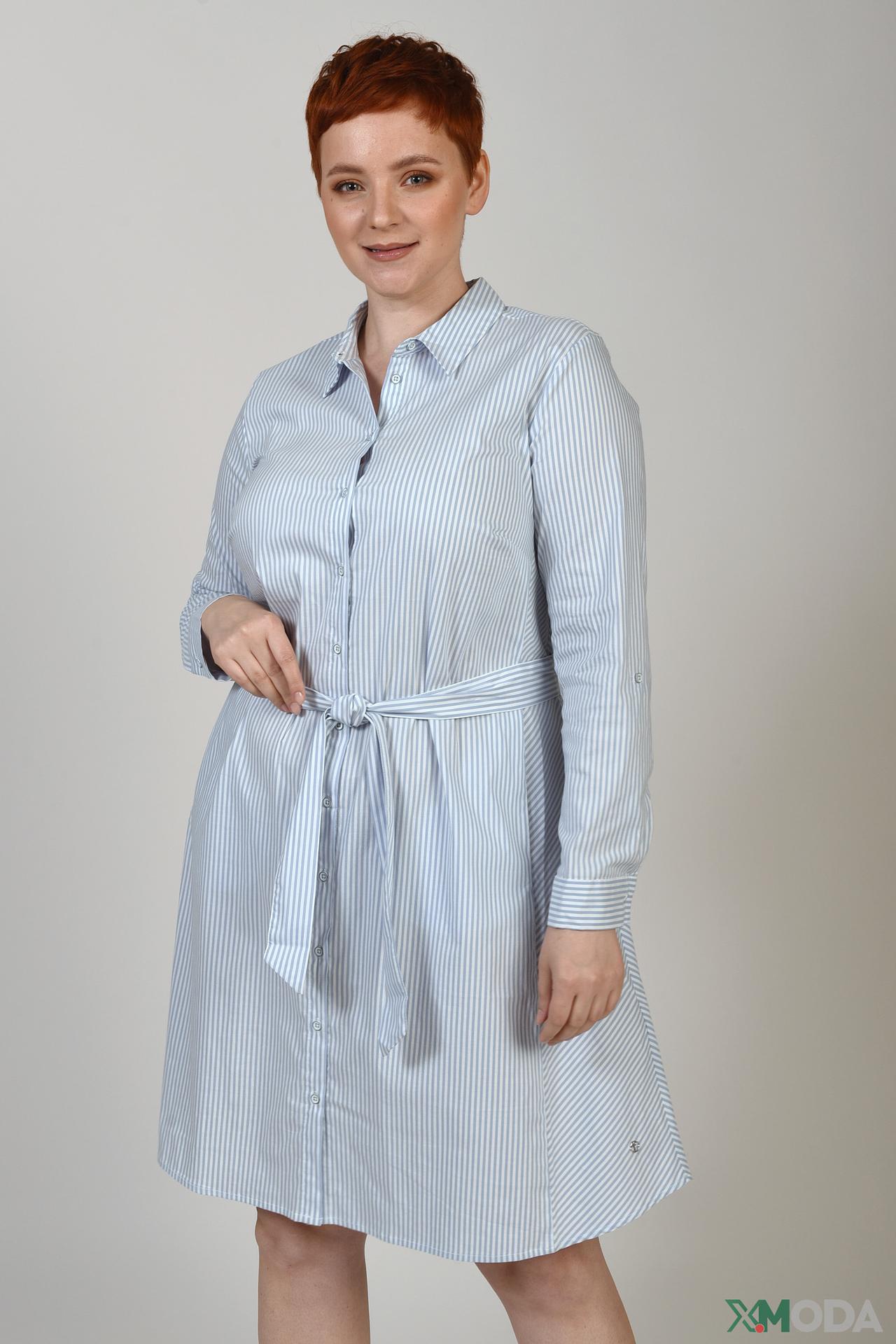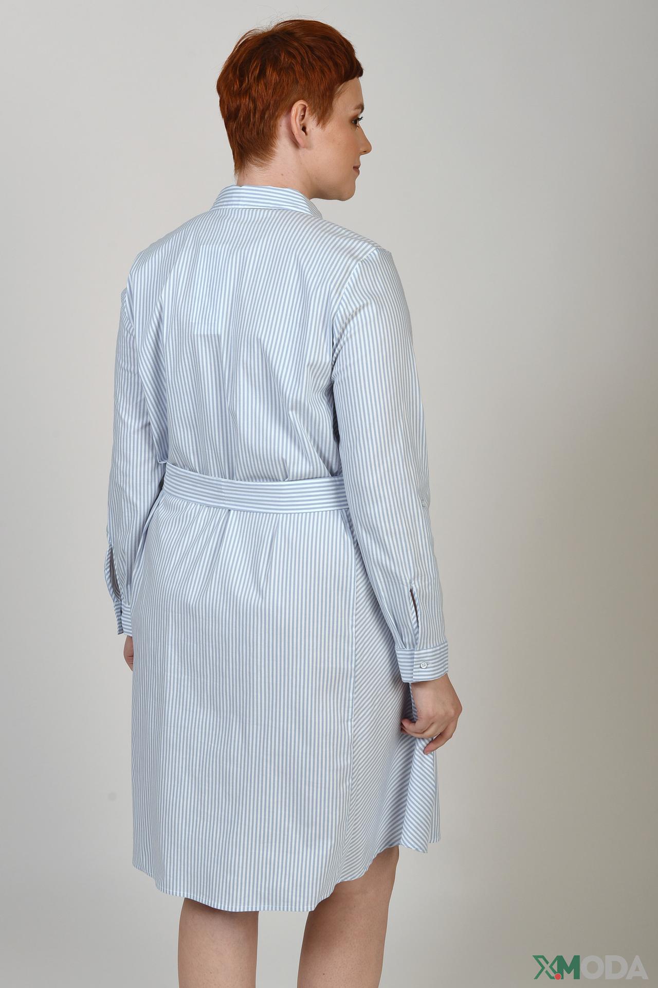 Платье голубого цвета бренда Frapp. Модель выполнена прямым фасоном. Изделие дополнено откладным воротом на стойке, застежка на пуговицы, втачными, длинными рукавами с манжетами на пуговицу, тканевым поясом. Ткань платья имеет полосатый принт. Платье удобно и практично. Такая модель подходит по вашему усмотрению..
