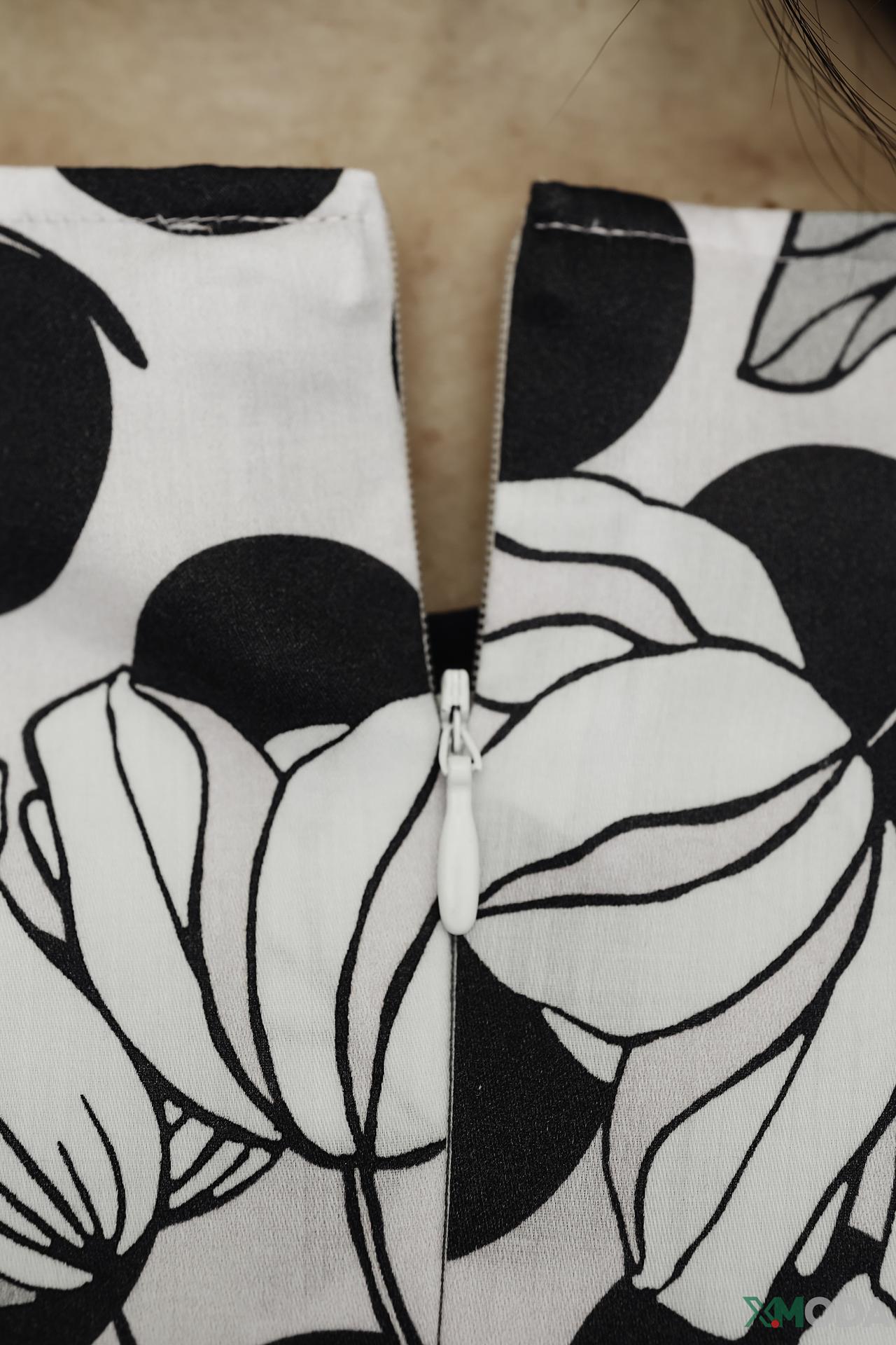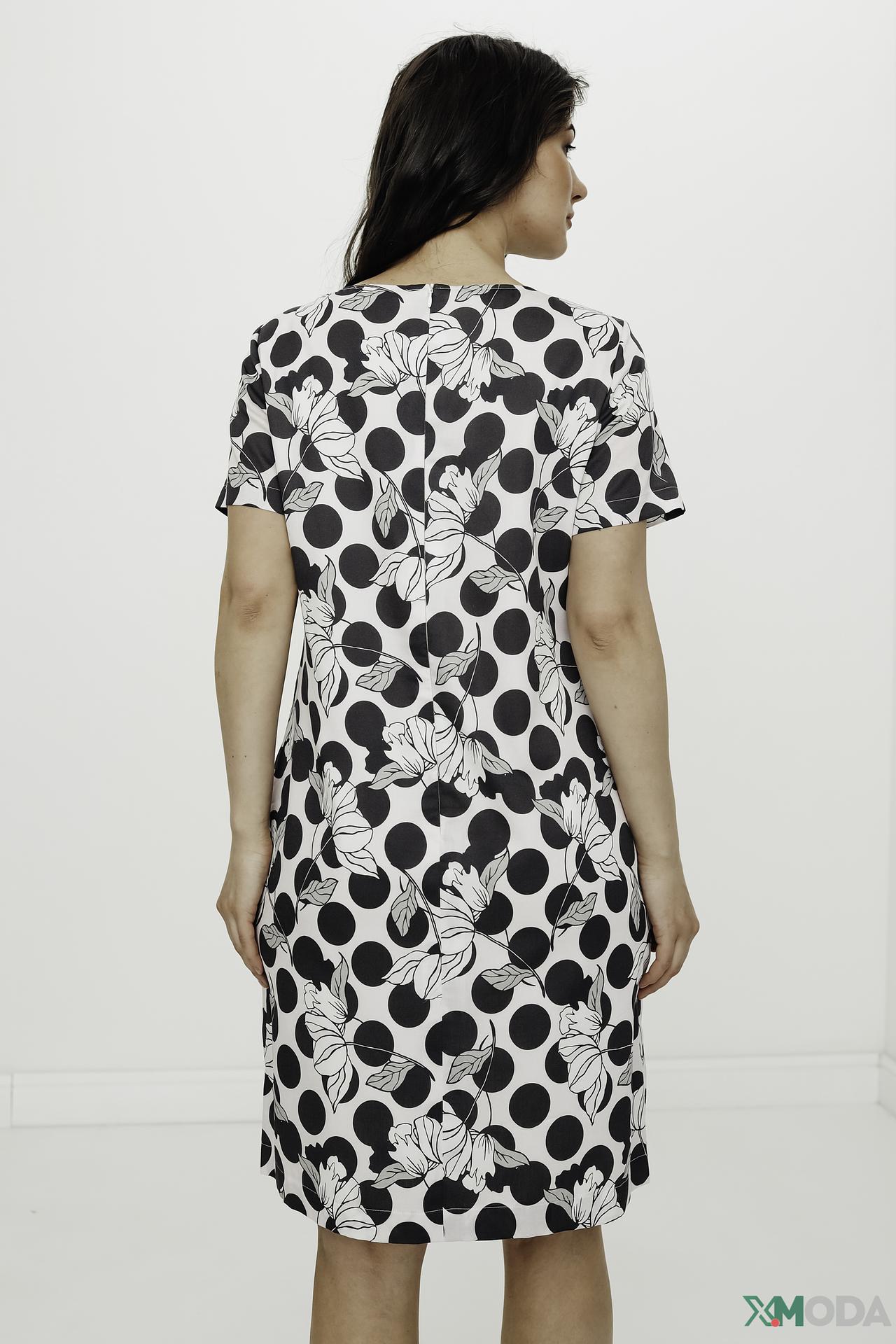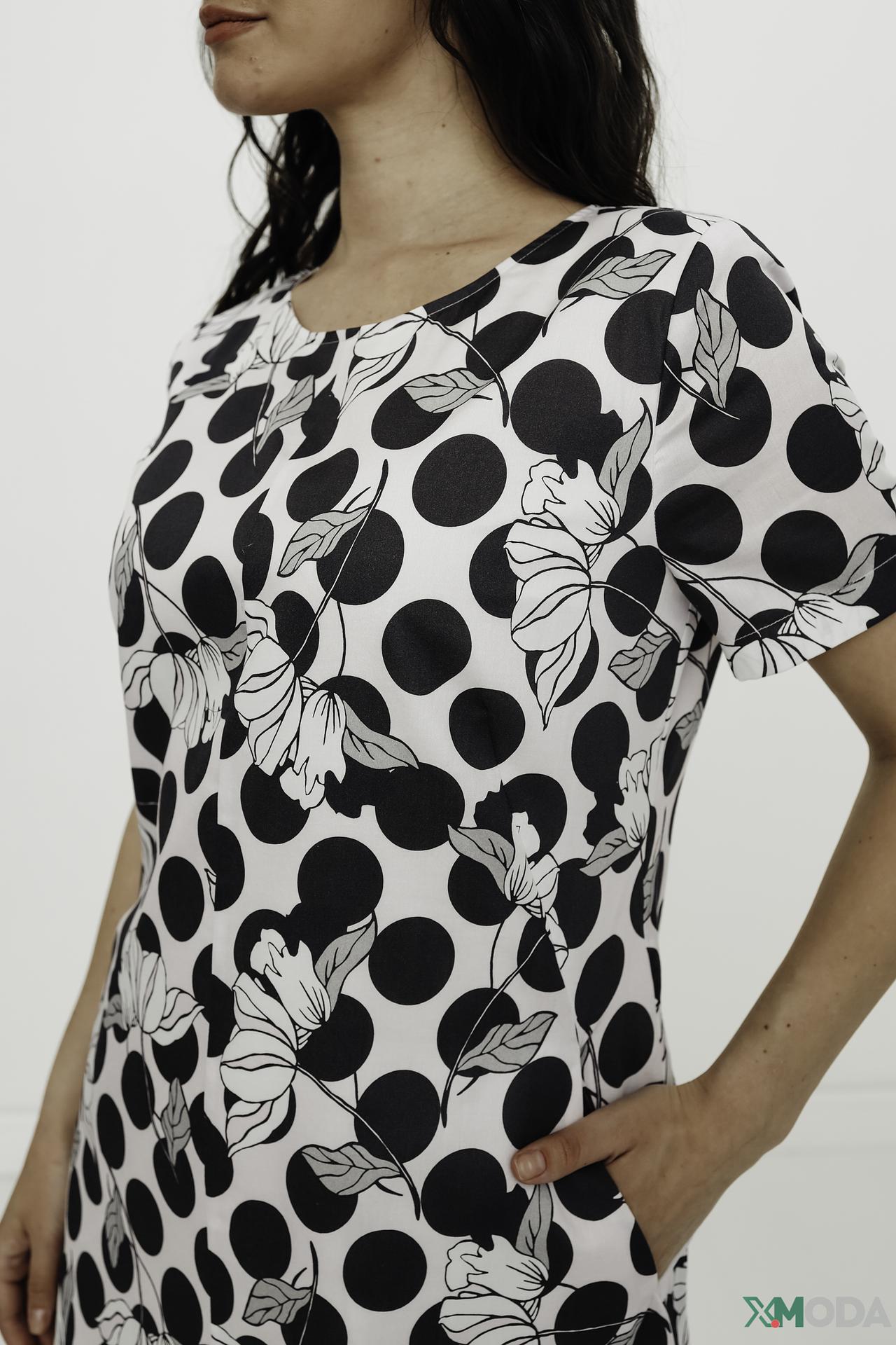 Это платье сочетает в себе классический дизайн и современный стиль. Черно-белый принт в горох с цветочным рисунком придает образу изысканность и неповторимость. Идеально подходит как для повседневной носки, так и для особых случаев.