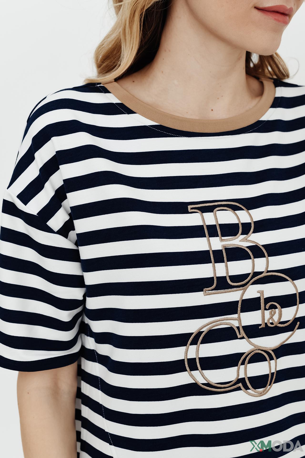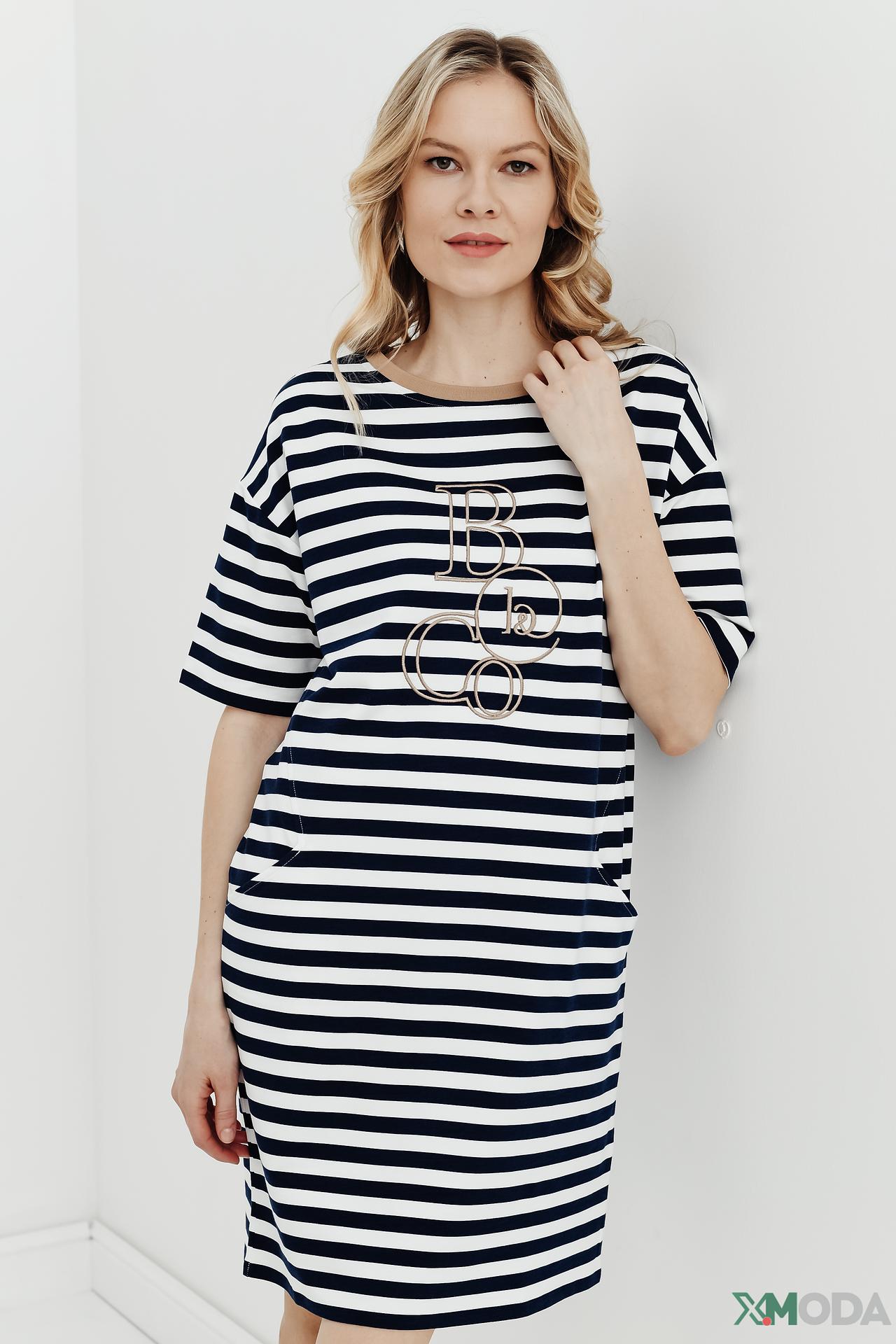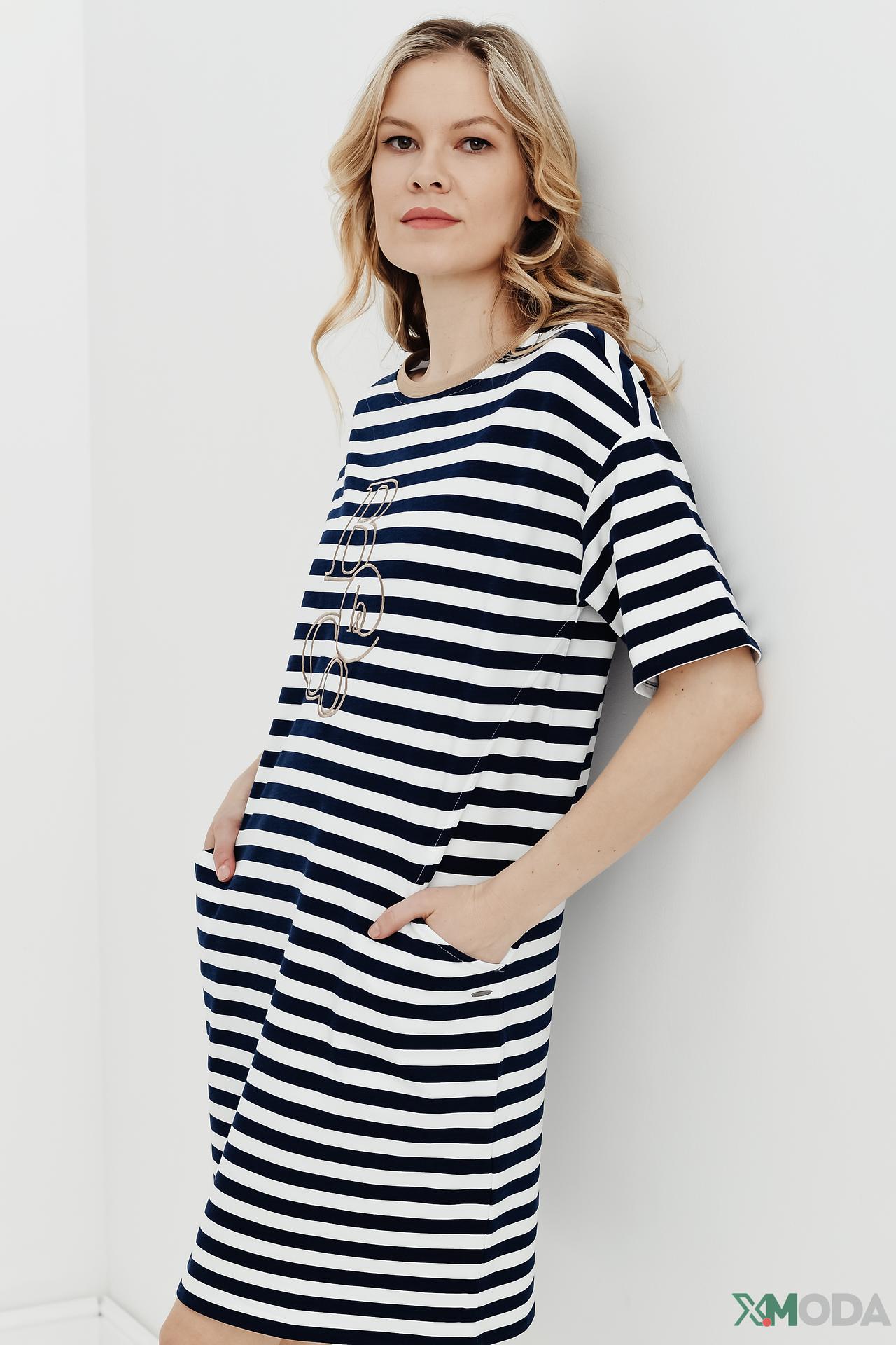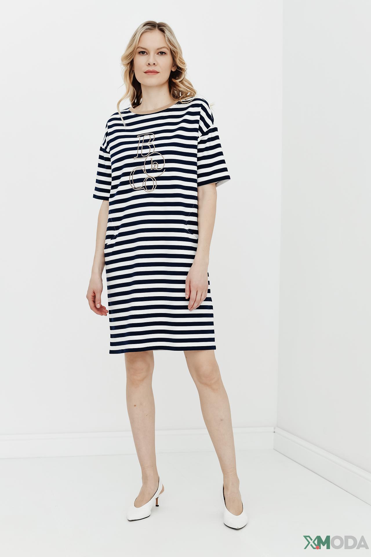 Платье разноцветного цвета от бренда Betty and Co. Модель выполнено прямым фасоном. Изделие дополнено округлым воротом, втачными, короткими рукавами, прорезными карманами. Окружность ворота обшита бейкой бежевого цвета. На передней части расположена аппликация. Ткань платья имеет полосатый принт. Длина платья до колен. Состав: 8% эластан, 46% хлопок, 46% модал. Такая модель подходит для отдыха и прогулок.