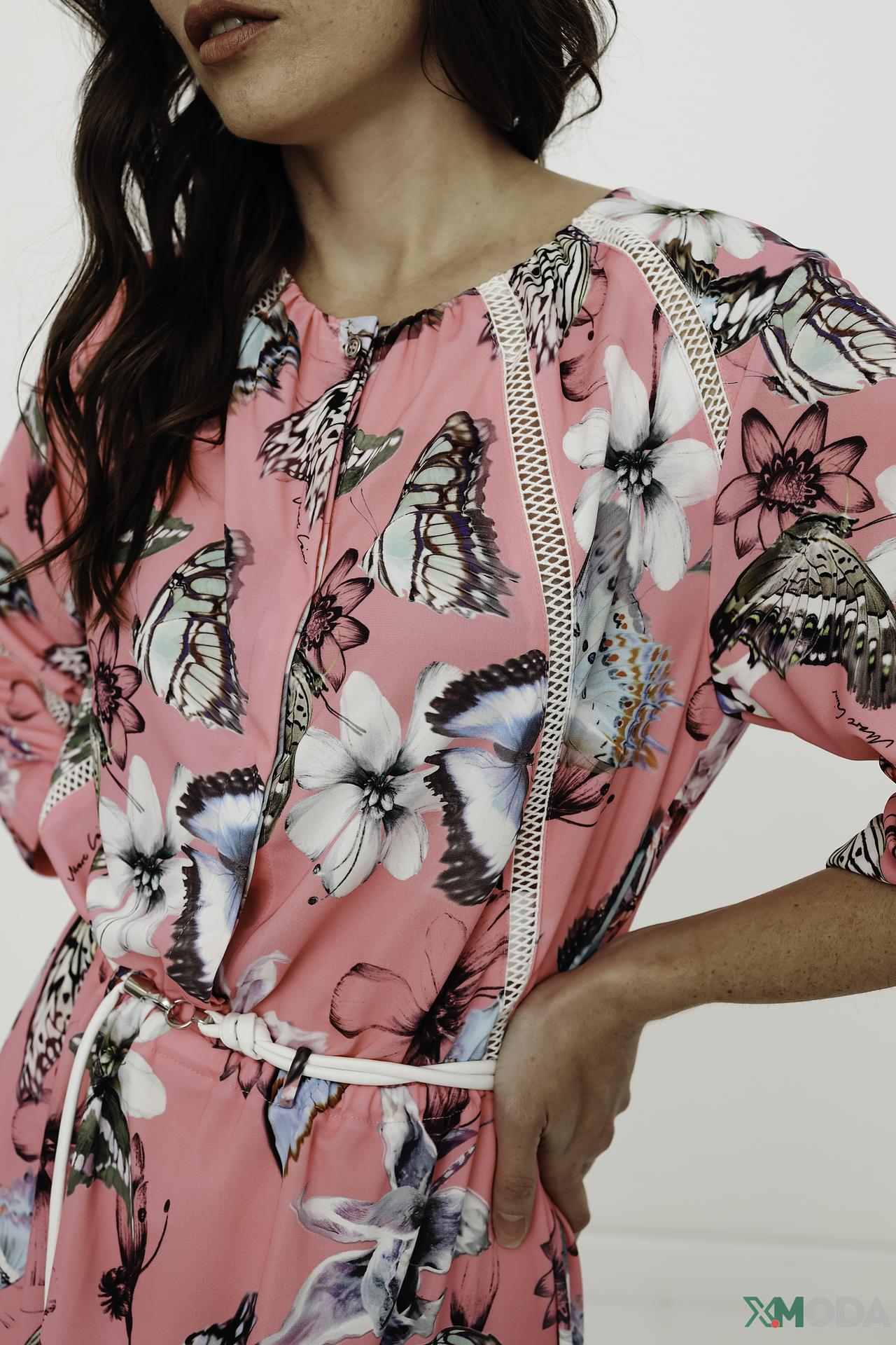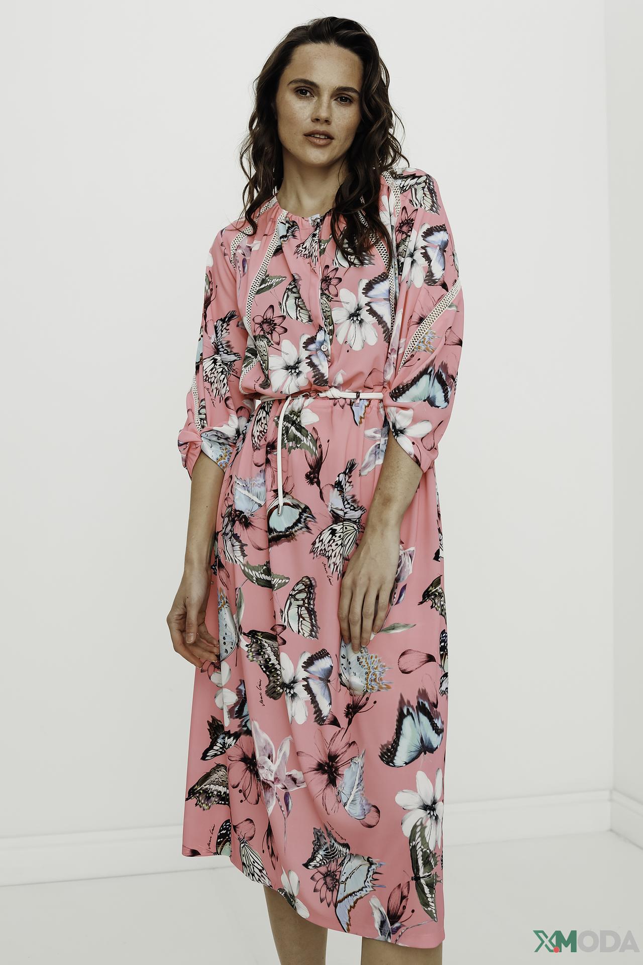 Платье Marc Cain розовое с принтом бабочек и белой отделкой