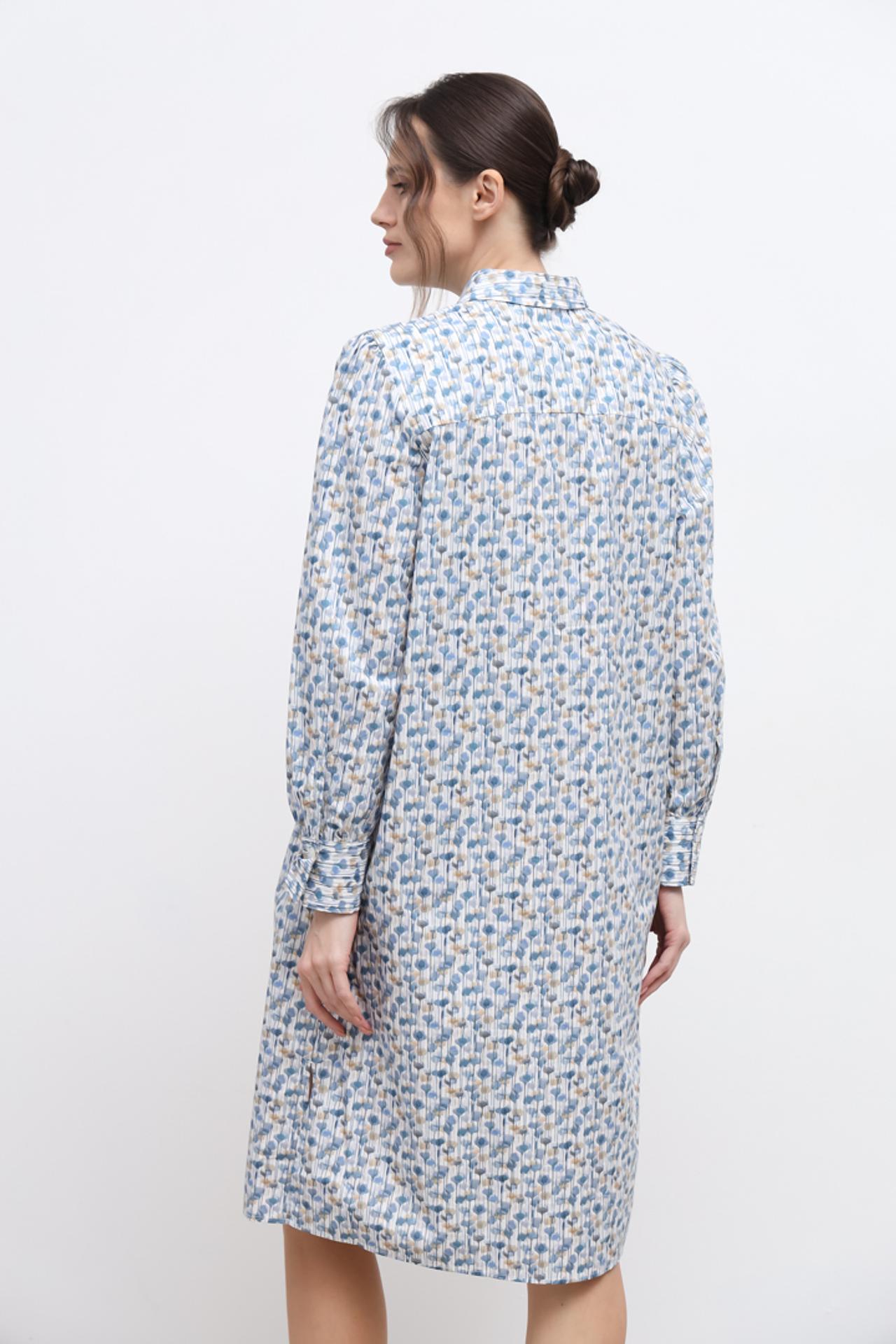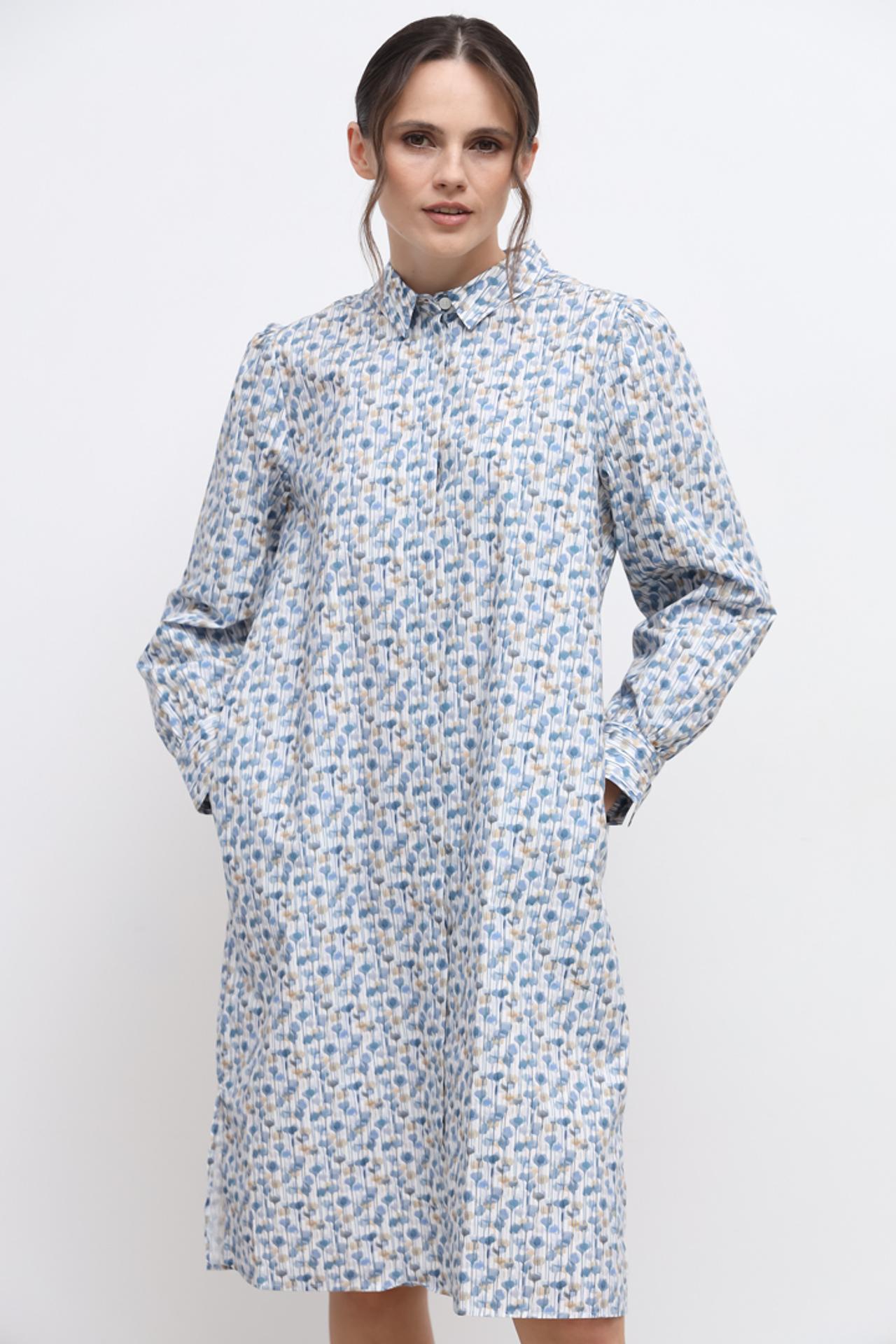 - Дизайн: Нежный цветочный принт в голубых тонах, классический воротник.