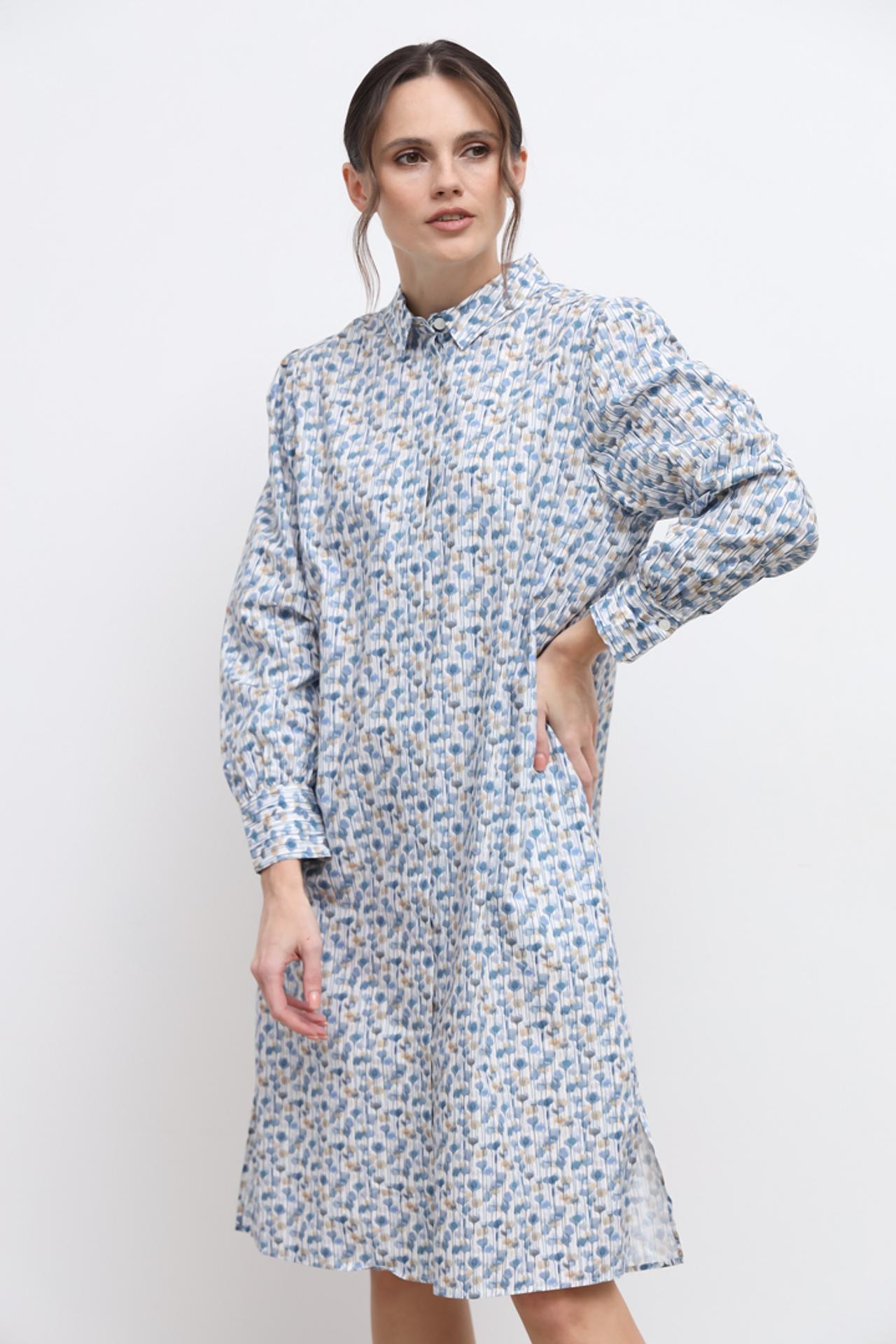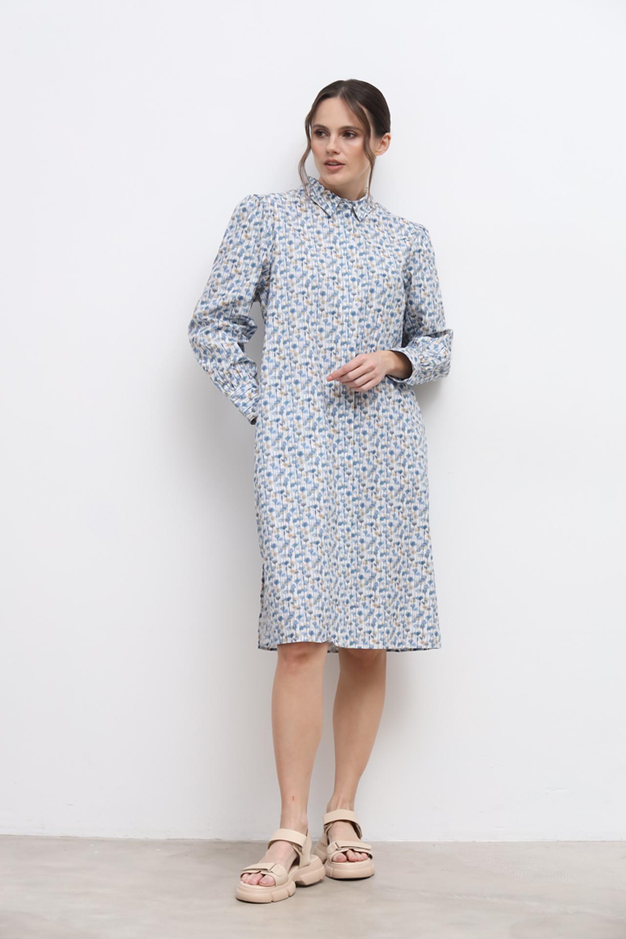 Платье декорировано изящным цветочным принтом в голубых тонах, который добавит свежести и оригинальности вашему стилю. Классический воротник и длинные рукава придают модели женственности и утонченности. Прямой крой платья визуально вытягивает силуэт, подчеркивая достоинства фигуры.