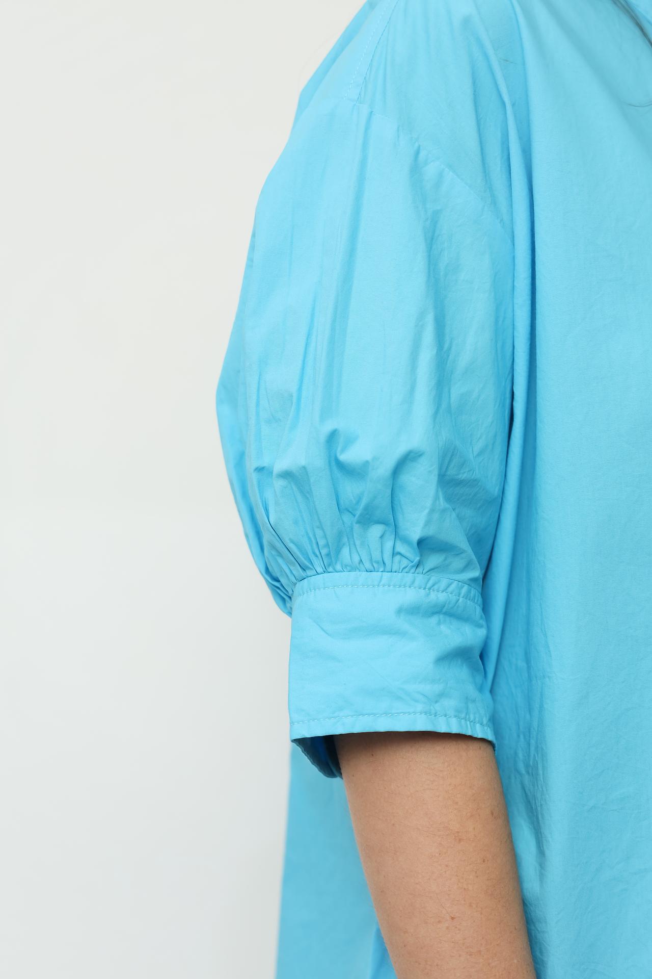 Платье прямого силуэта с короткими рукавами-буфами и классической отложной горловицей. Застежка на пуговицах позволяет легко регулировать посадку. Боковые разрезы добавляют комфорта и свободы движения.