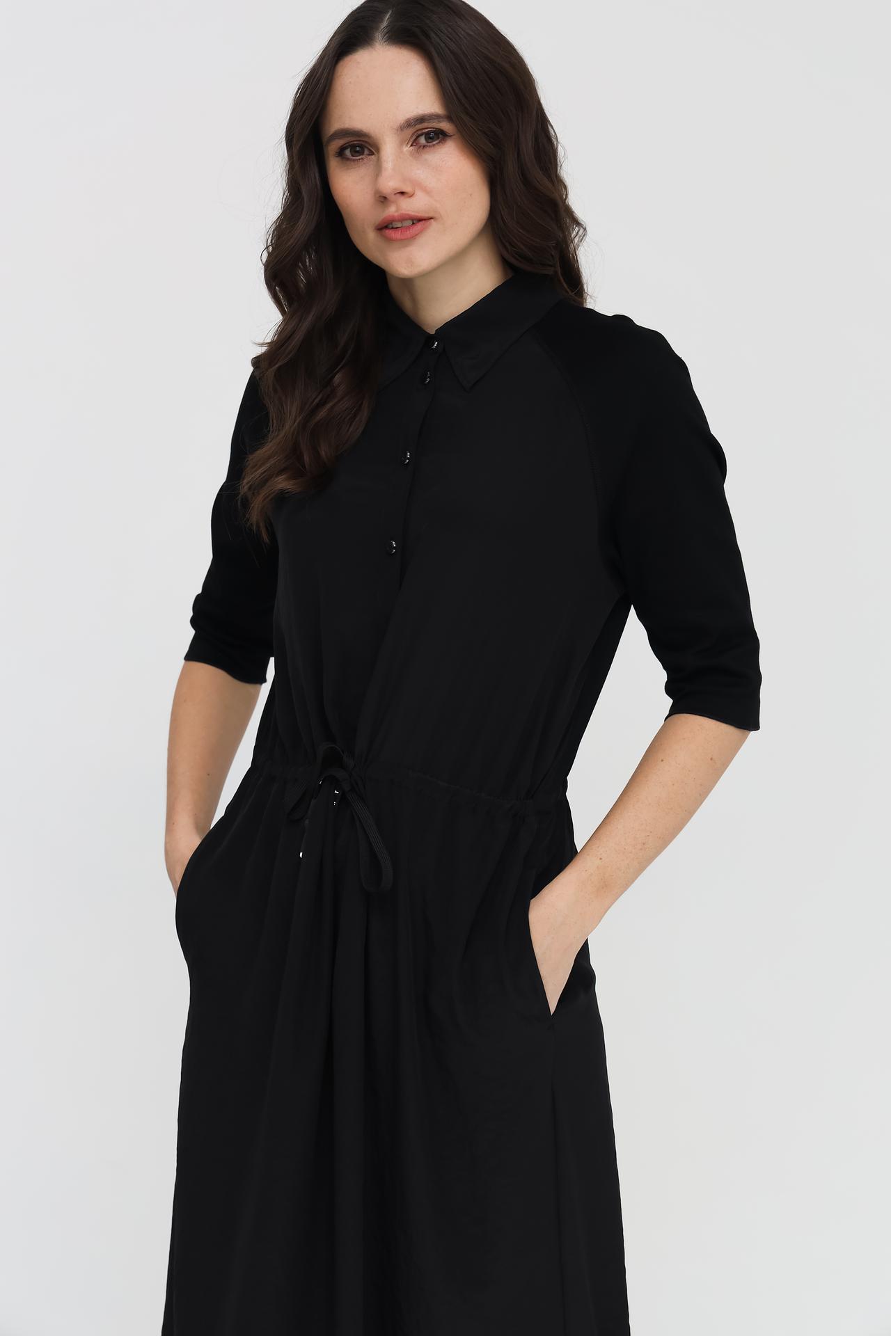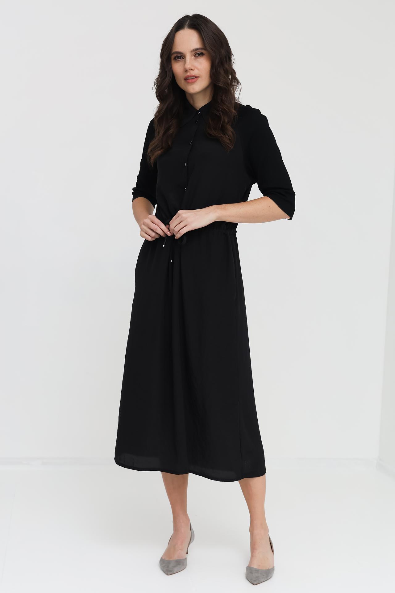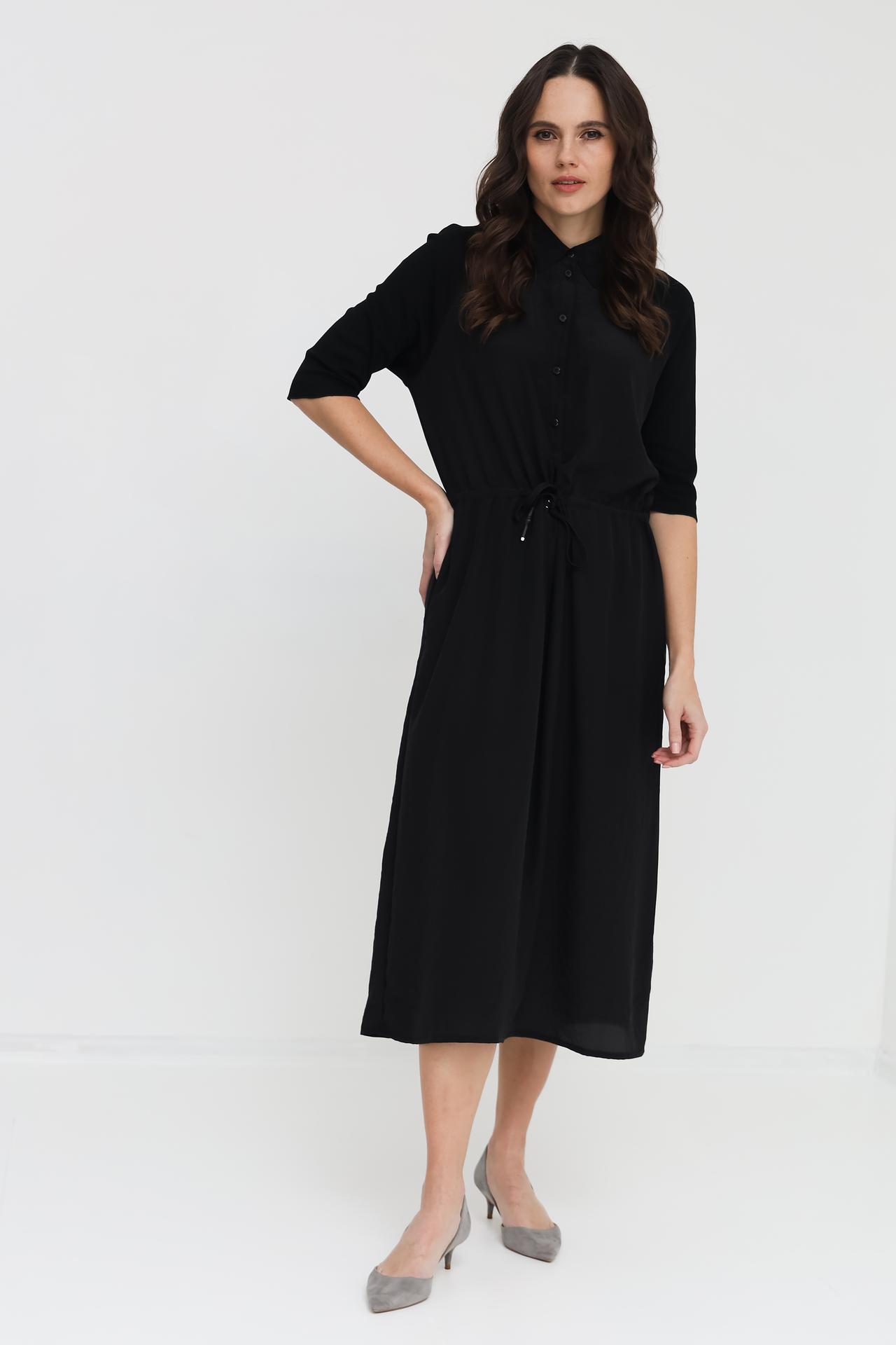 - Дизайн: Платье-рубашка с отложным воротником и застежкой на пуговицы. Акцентная деталь — кулиска на талии, позволяющая регулировать посадку и создавать желаемый силуэт.