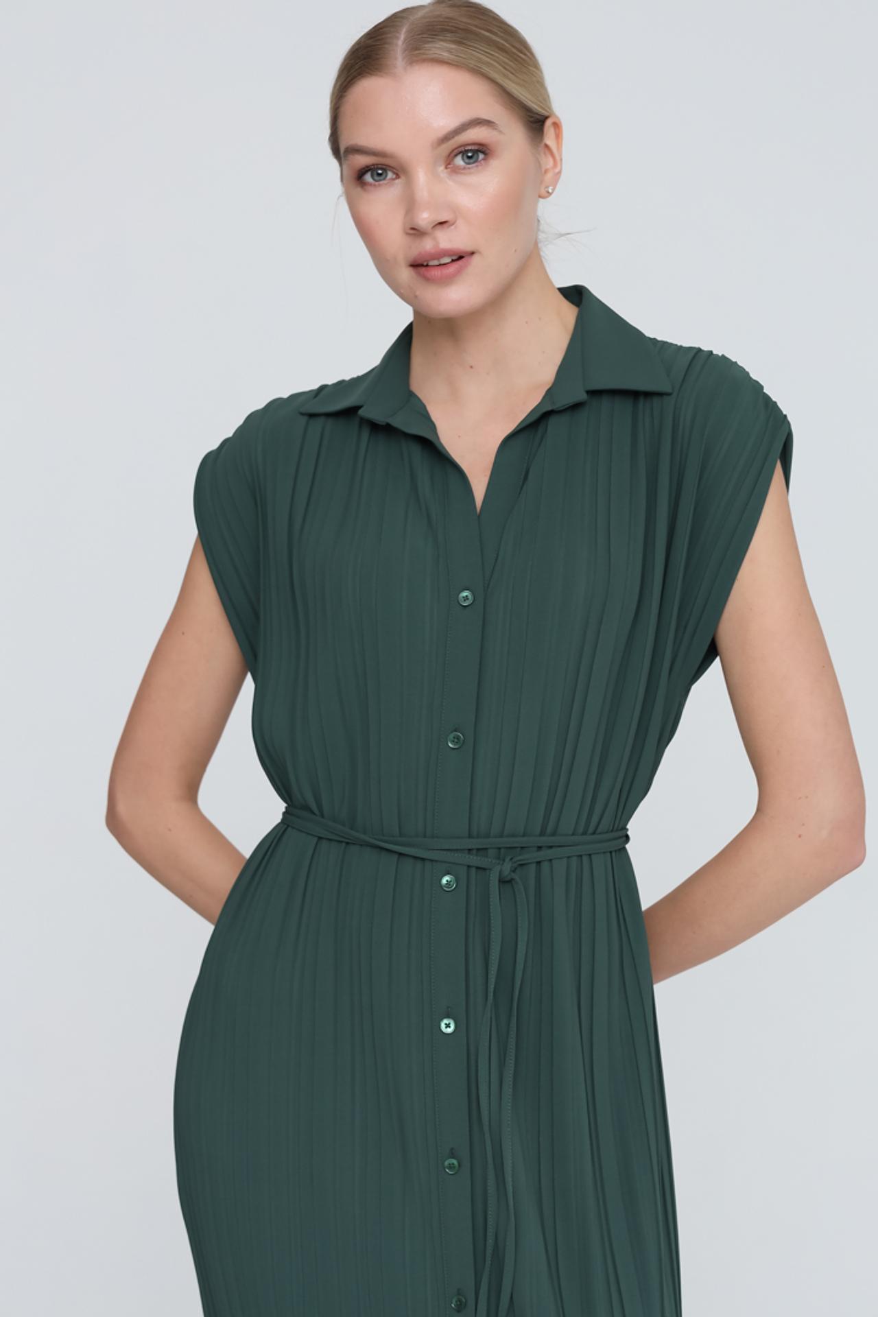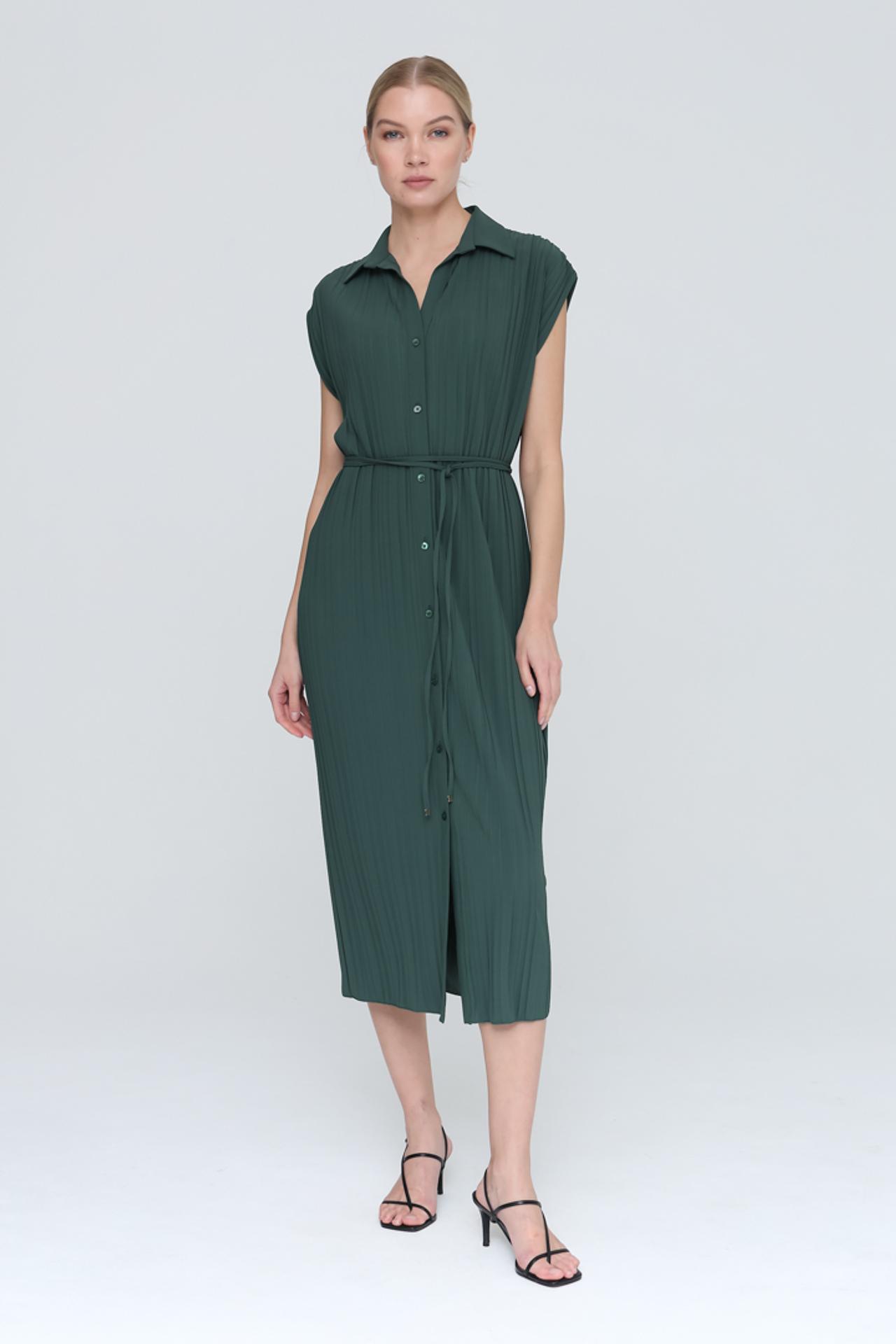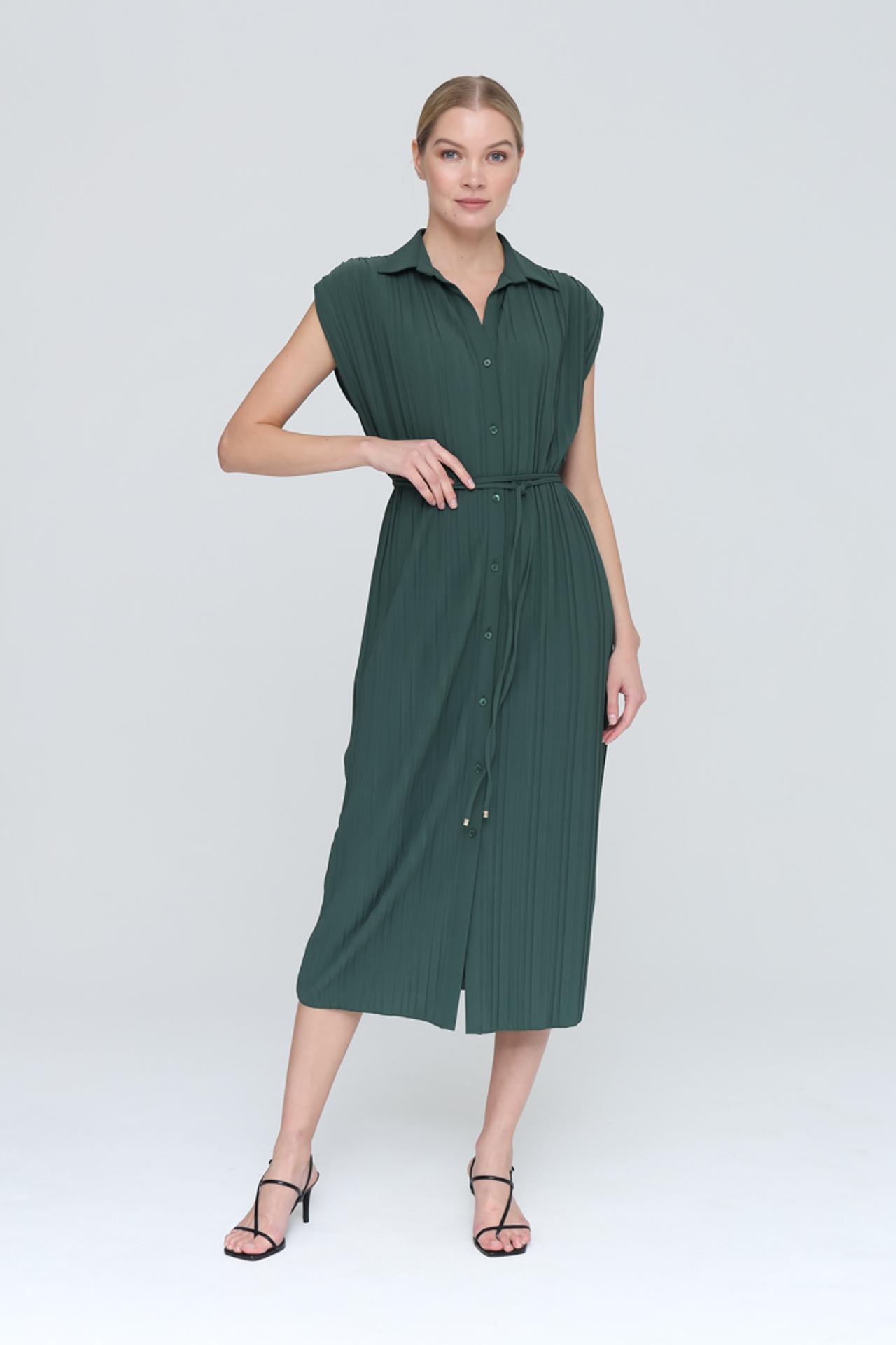Элегантное платье от Penny Black, выполненное в приглушенном темно-зеленом оттенке, станет идеальным выбором для создания утонченных образов. Модель прямого кроя с отложным воротником и застежкой на пуговицы по всей длине подчеркивает достоинства фигуры, а съемный пояс акцентирует талию. Оригинальная фактура ткани, созданная методом плиссе, придает платью особый шик и динамичность. Это платье – превосходное сочетание классического стиля и современных тенденций, подходящее как для деловых встреч, так и для вечерних мероприятий.