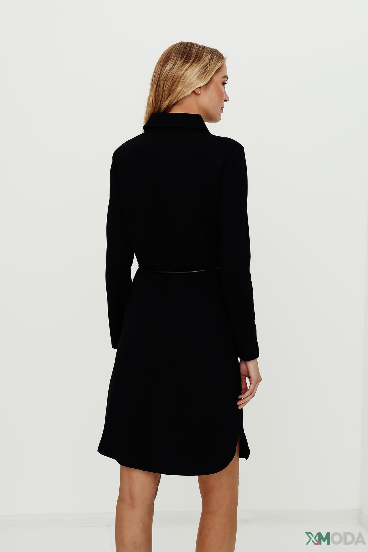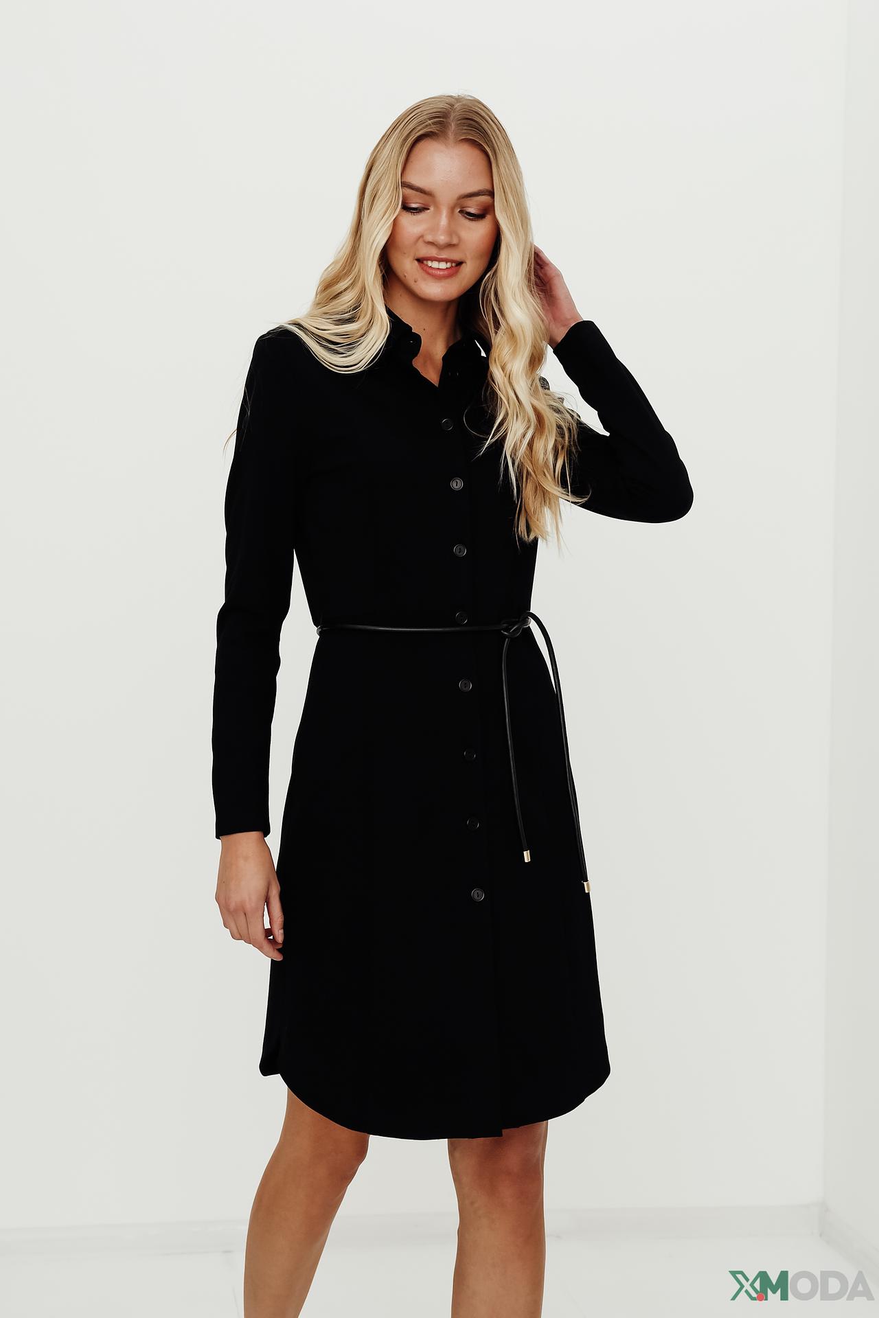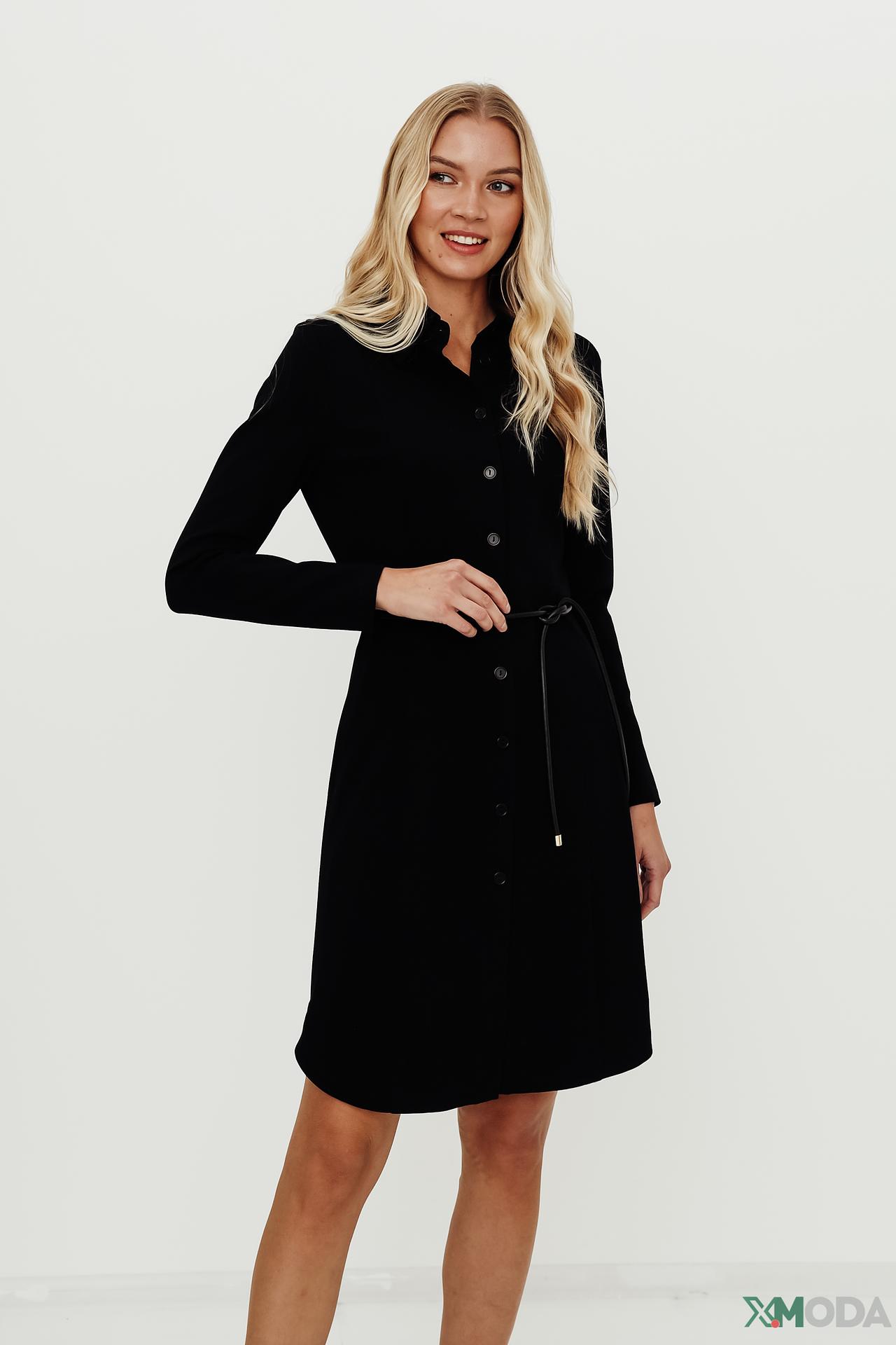 - Дизайн. Платье с длинными рукавами и воротником рубашечного типа, застегивается на пуговицы по всей длине.