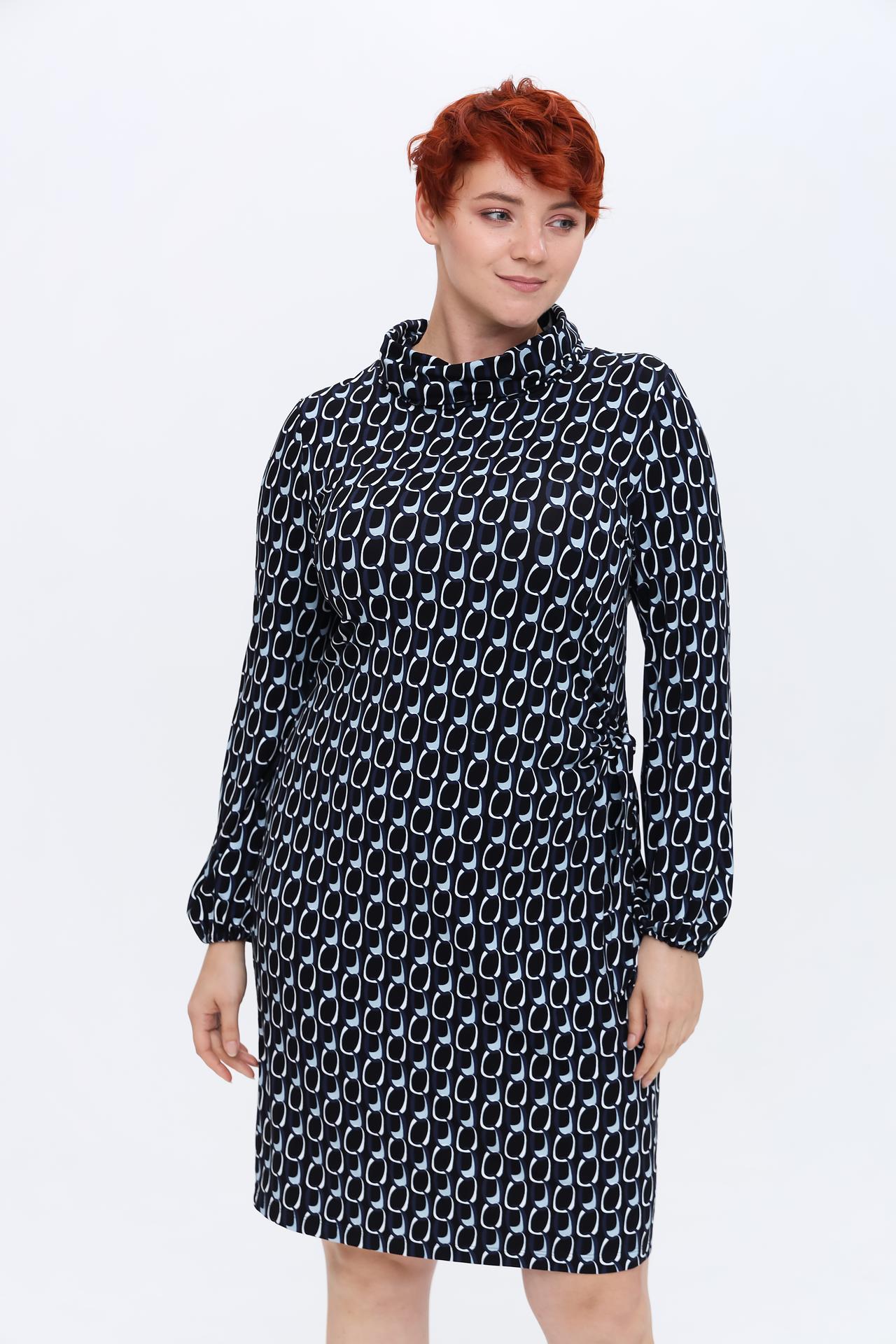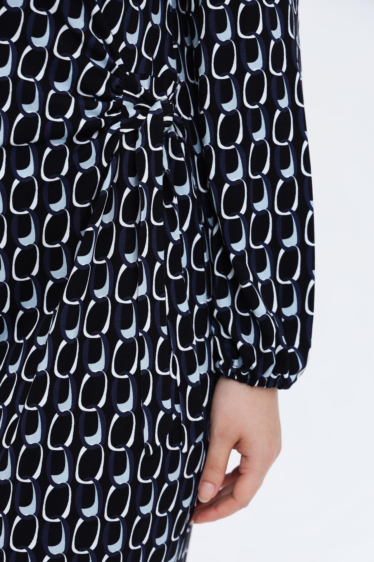 Модель выполнена в элегантном тёмно-синем цвете с оригинальным геометрическим принтом. Платье отлично подходит для повседневной носки, работы и торжественных мероприятий.