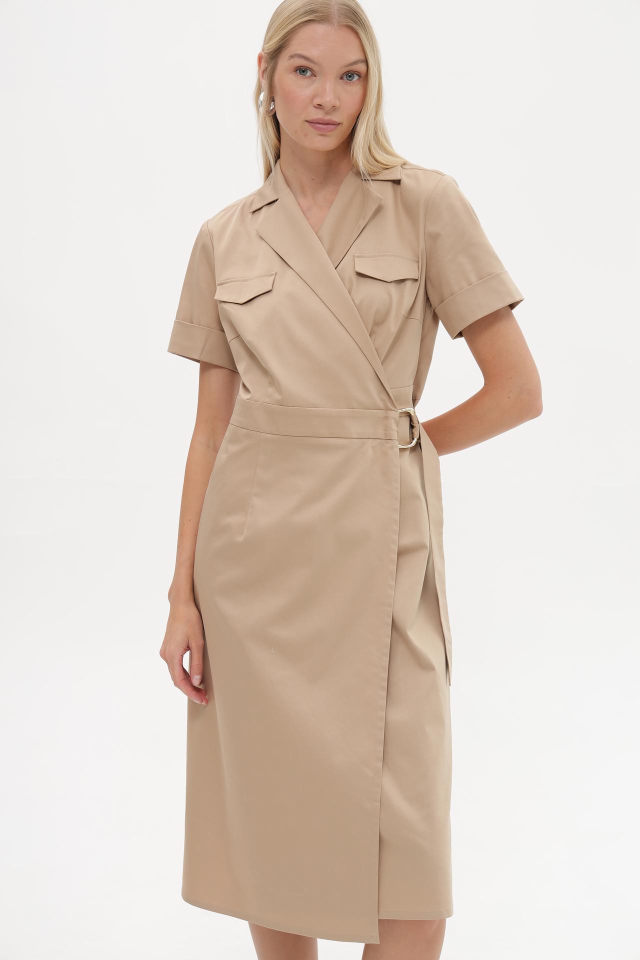 Классическое бежевое платье Betty and Co – идеальный выбор для создания элегантного образа. Модель на запах с короткими рукавами и отложным воротником подчеркивает женственность и дарит комфорт в течение всего дня. Это универсальное женское платье миди подходит как для офиса, так и для повседневных встреч.