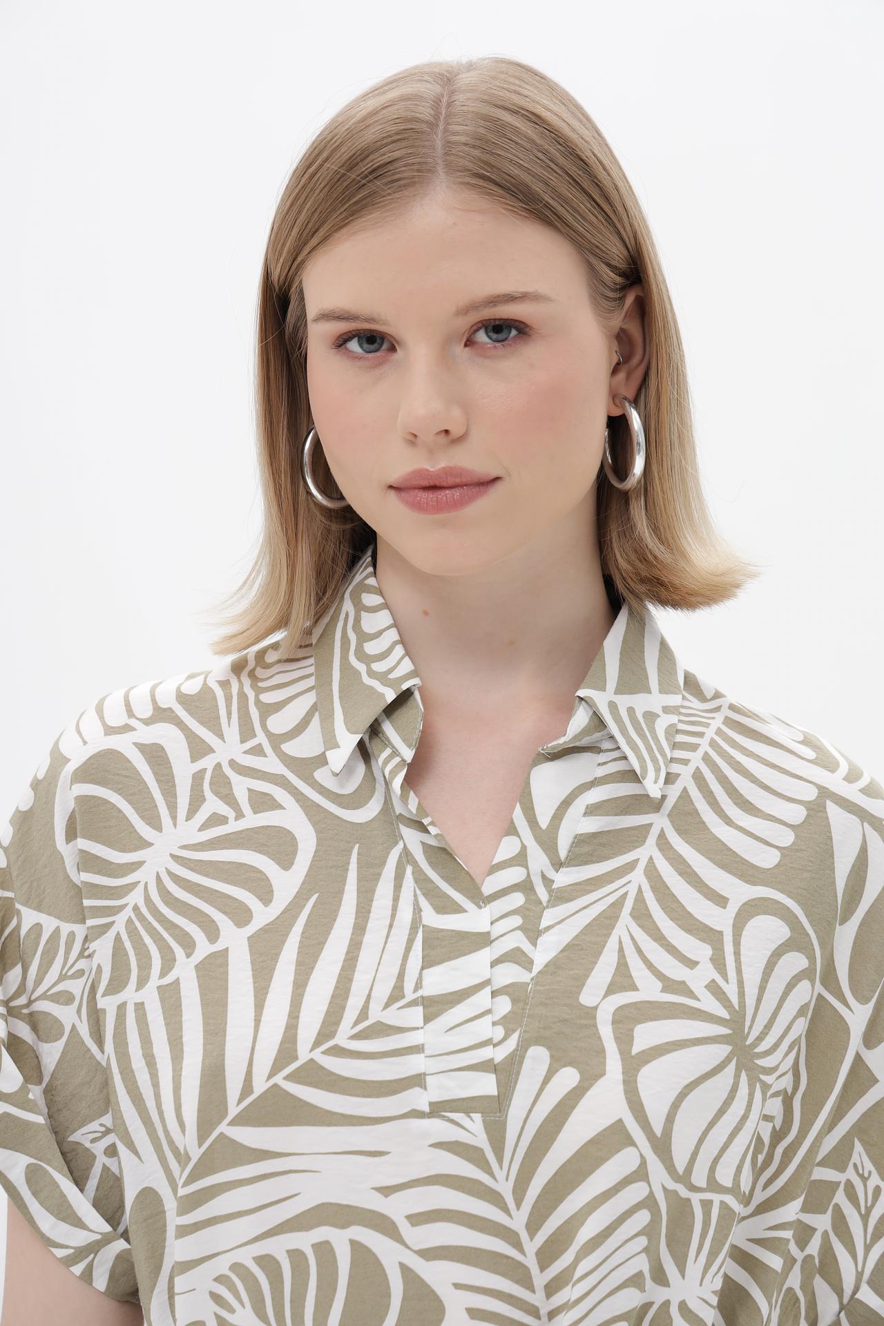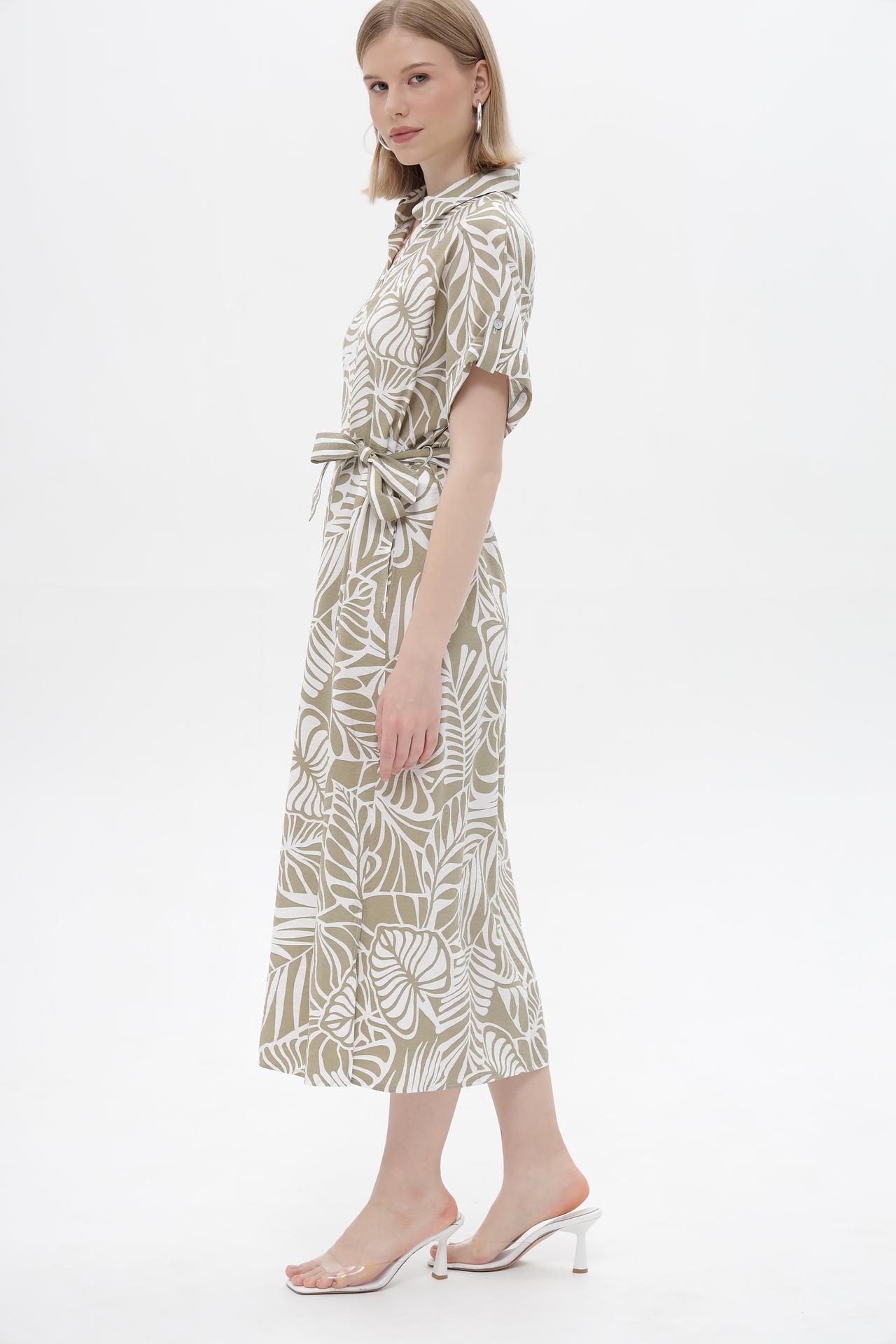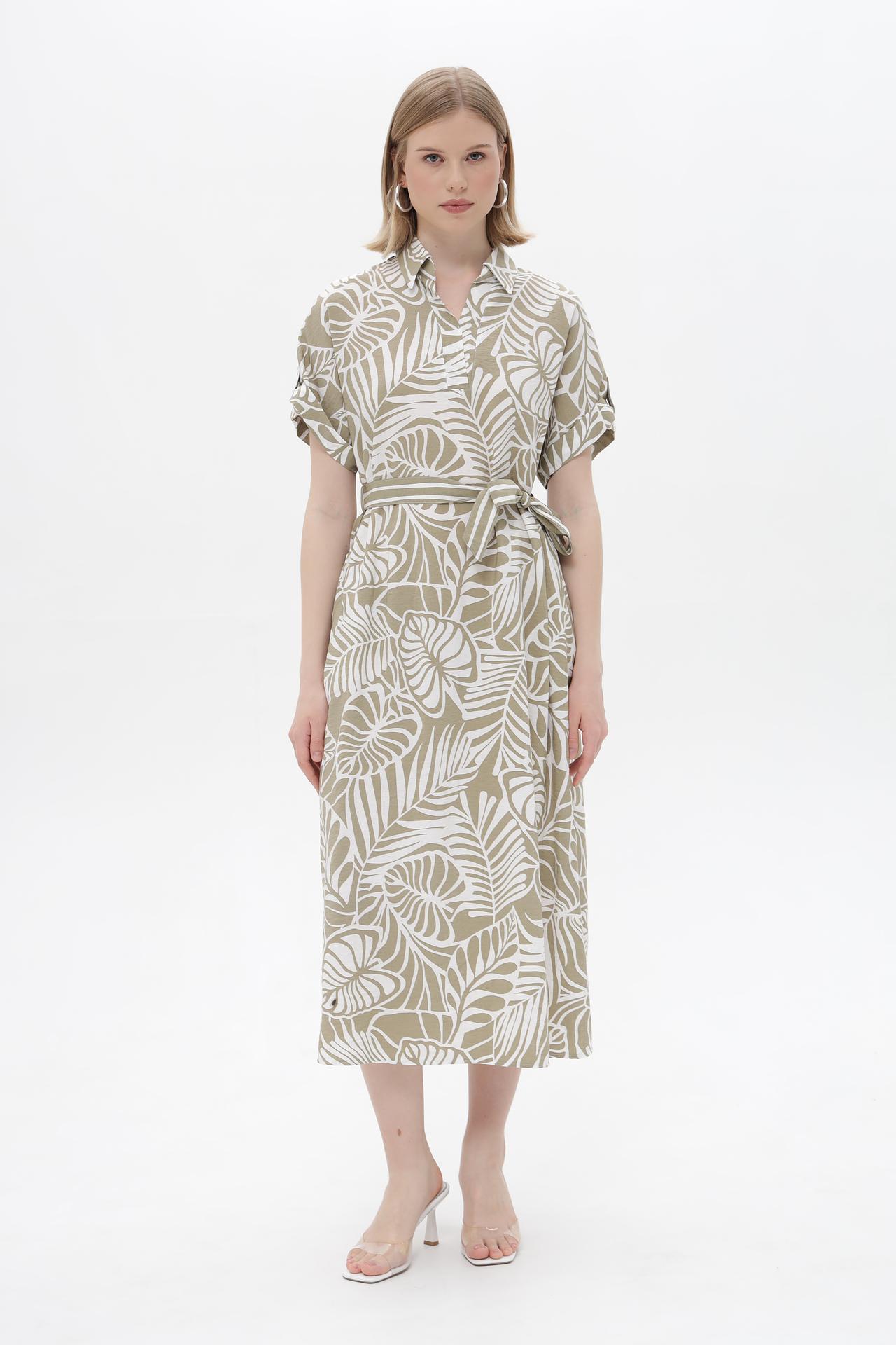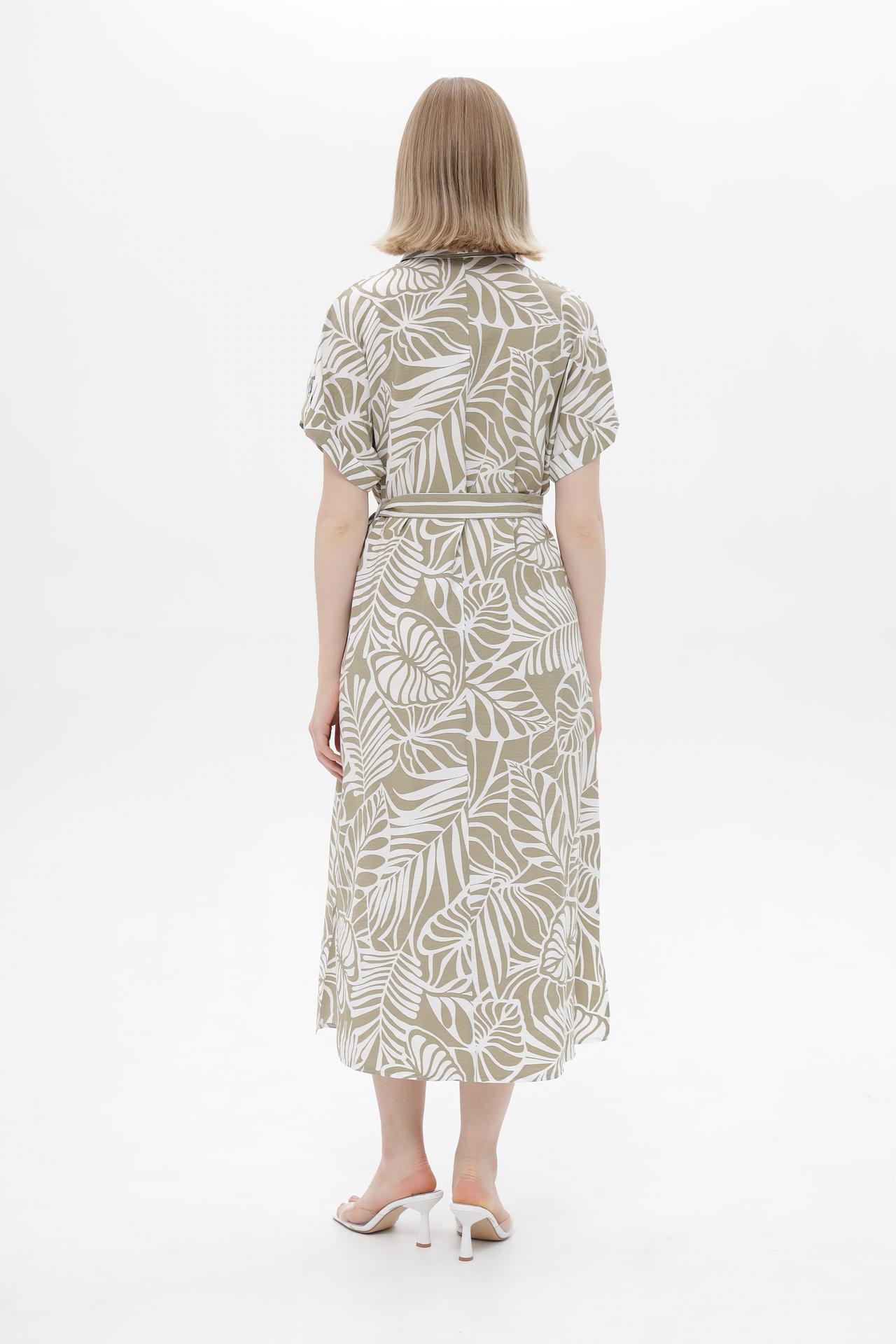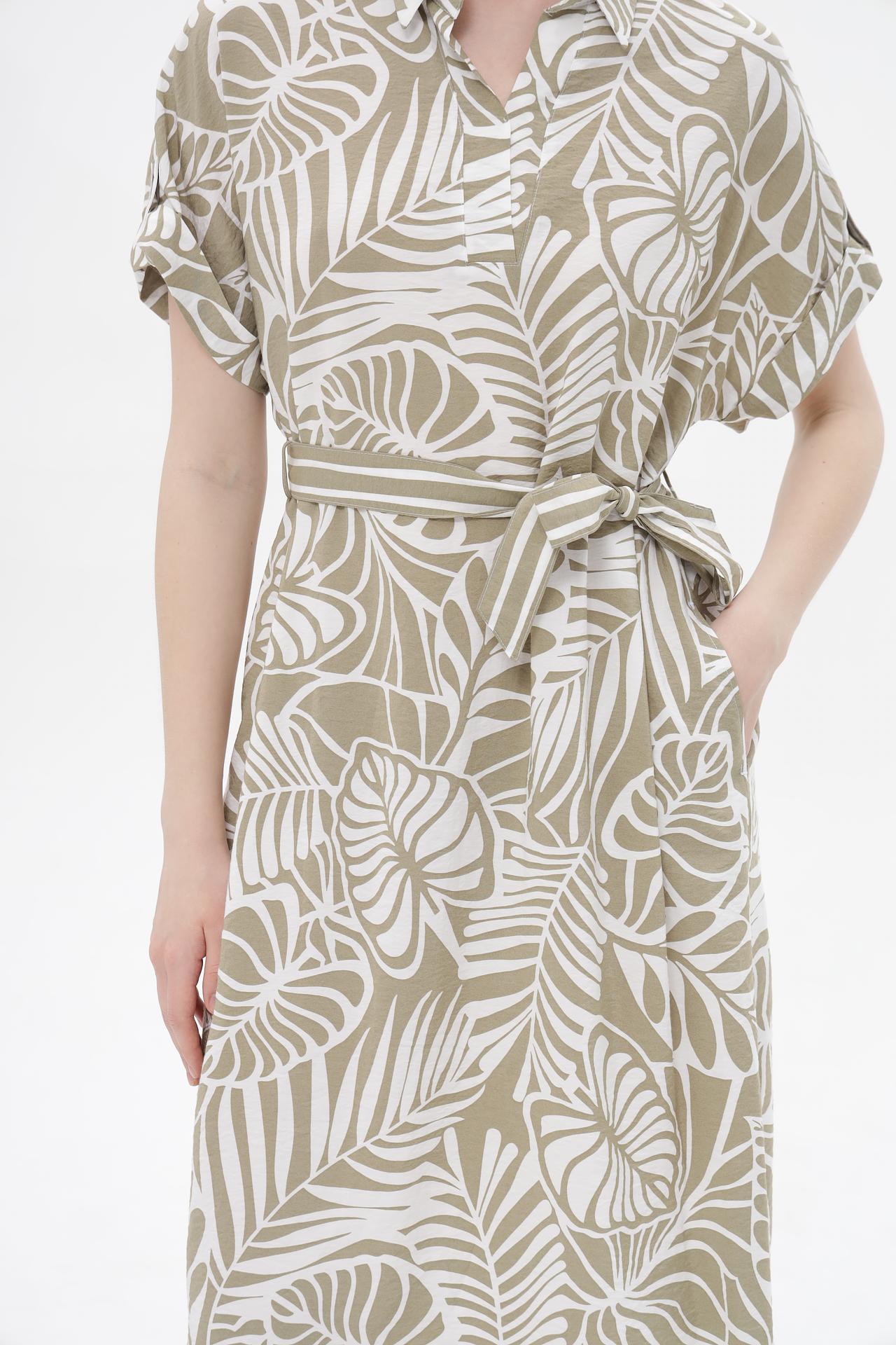 Модель дополнена отложным воротником, короткими рукавами с отворотами и функциональным поясом, который позволяет подчеркнуть талию. Оливковый оттенок в сочетании с белым тропическим принтом делает образ свежим и актуальным. Это стильное женское платье подходит для создания расслабленных повседневных или элегантных вечерних ансамблей.