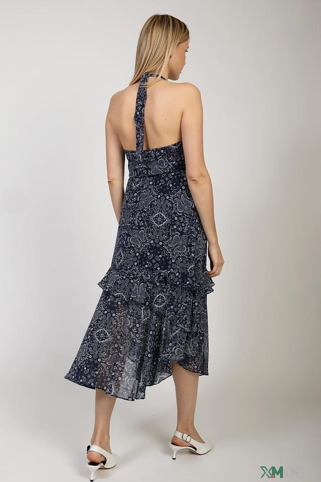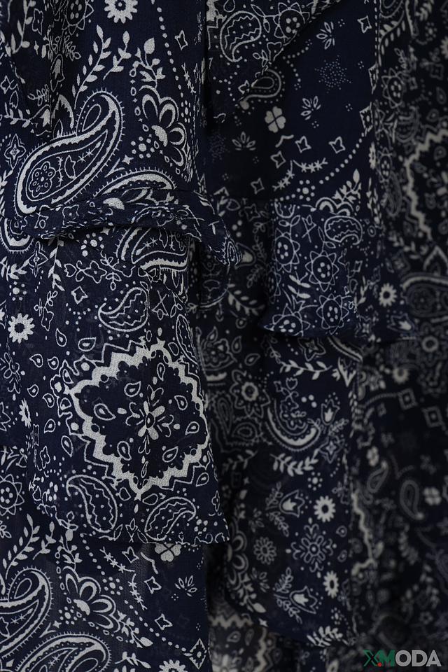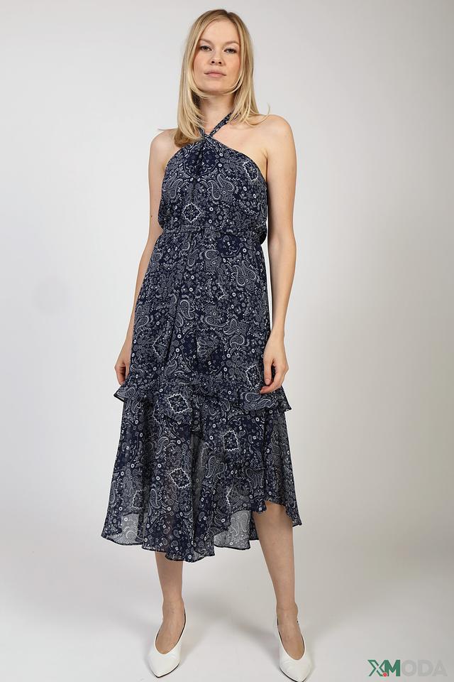 - Дизайн: Модель с американской проймой и открытой спиной, украшенная воланами по подолу. Принт в стиле пейсли придает платью уникальный и запоминающийся вид.
