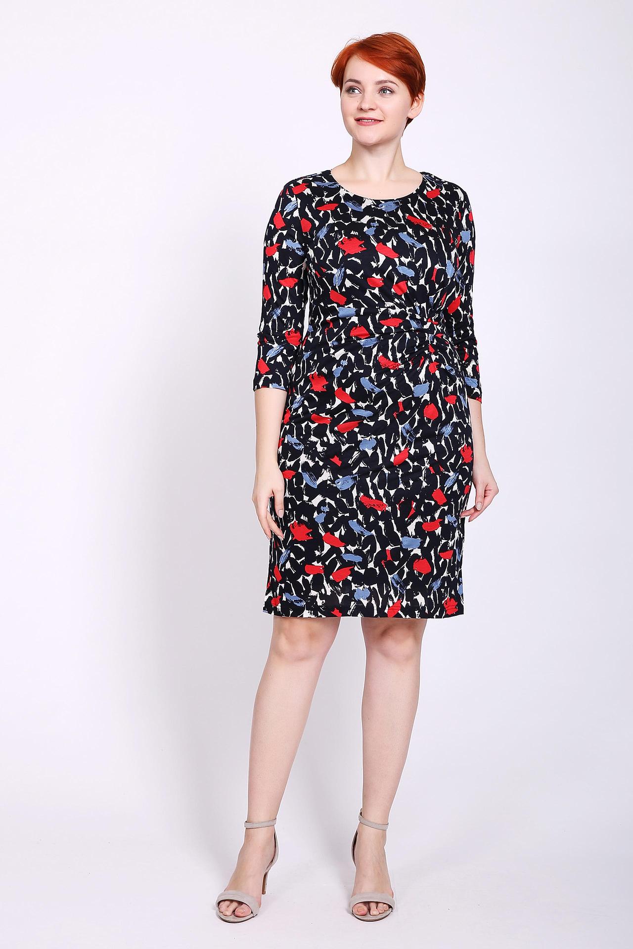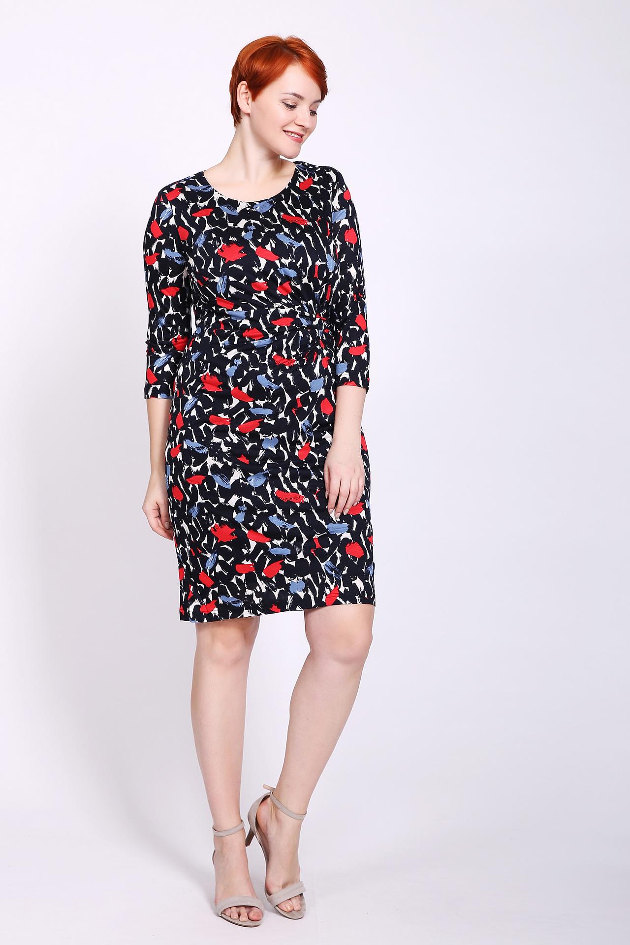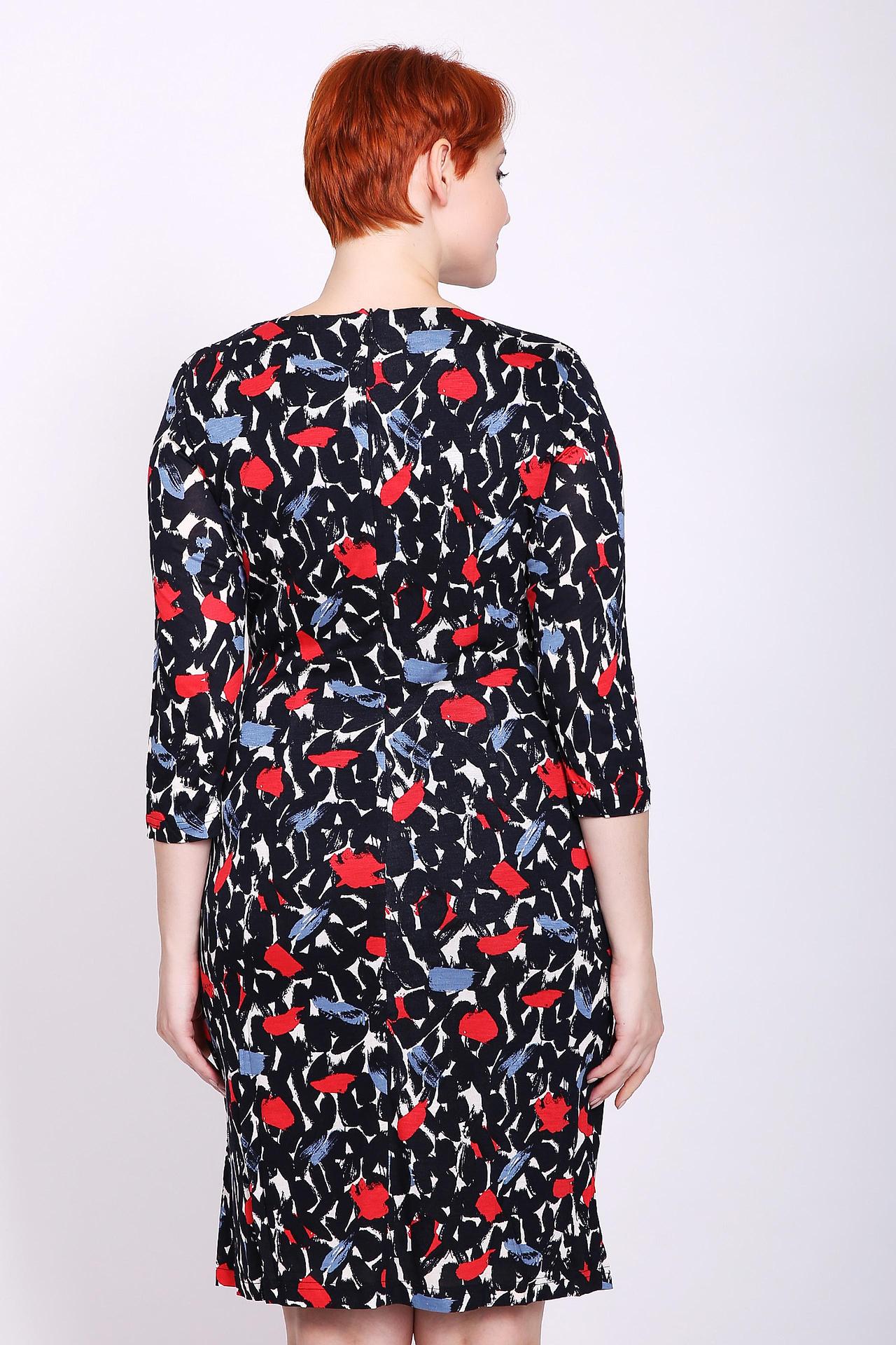 - Стильный дизайн: Контрастный абстрактный узор в красных, голубых и белых оттенках на тёмной основе придает платью выразительность. Такой дизайн легко интегрируется в гардероб, добавляя акцент.