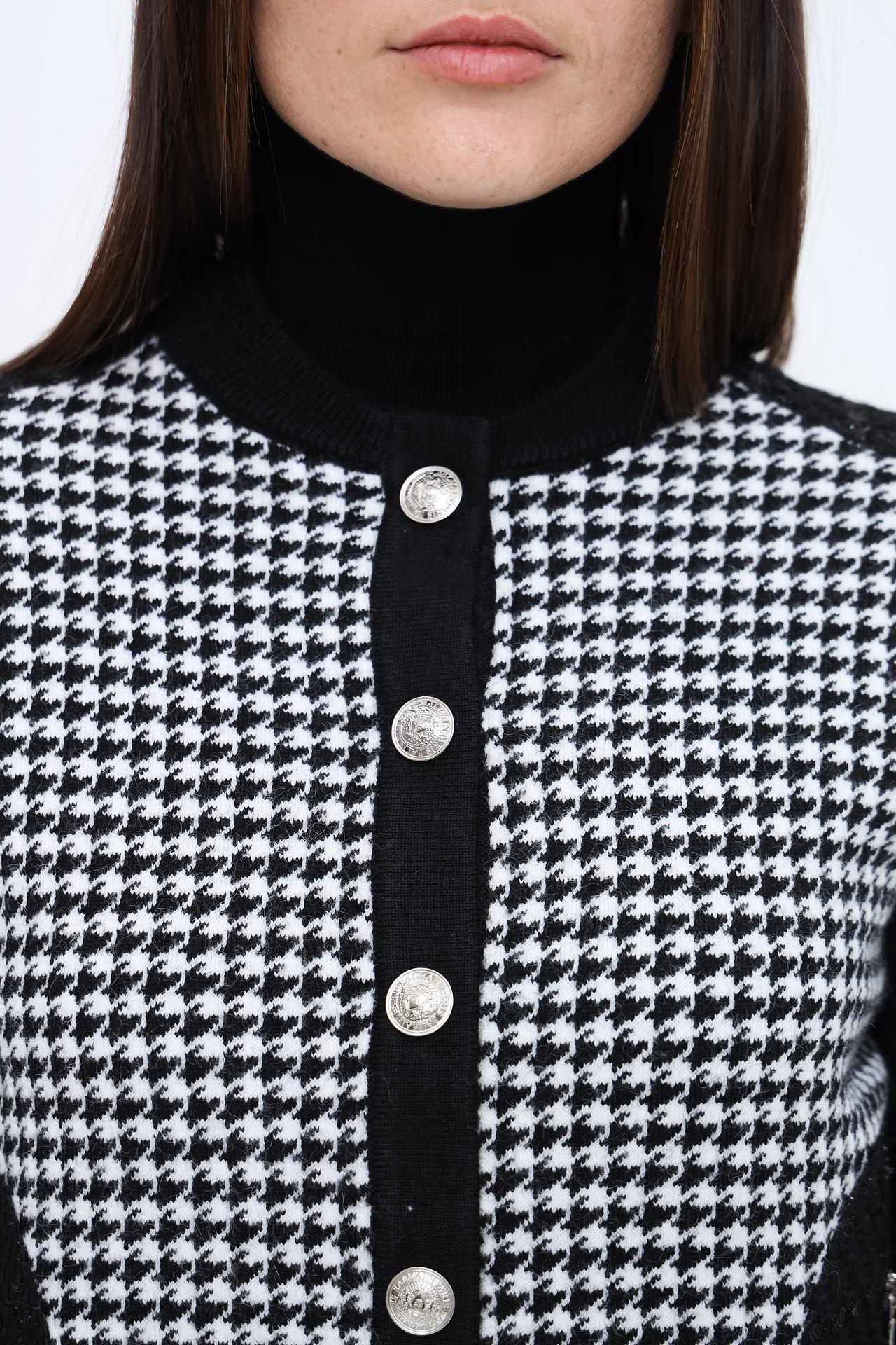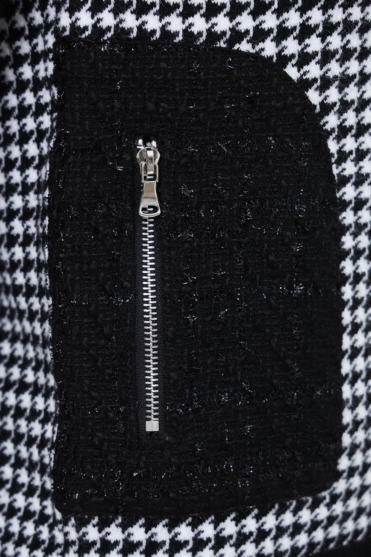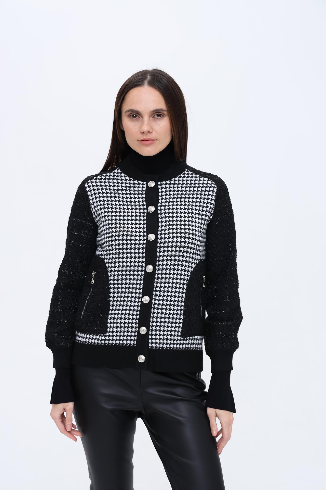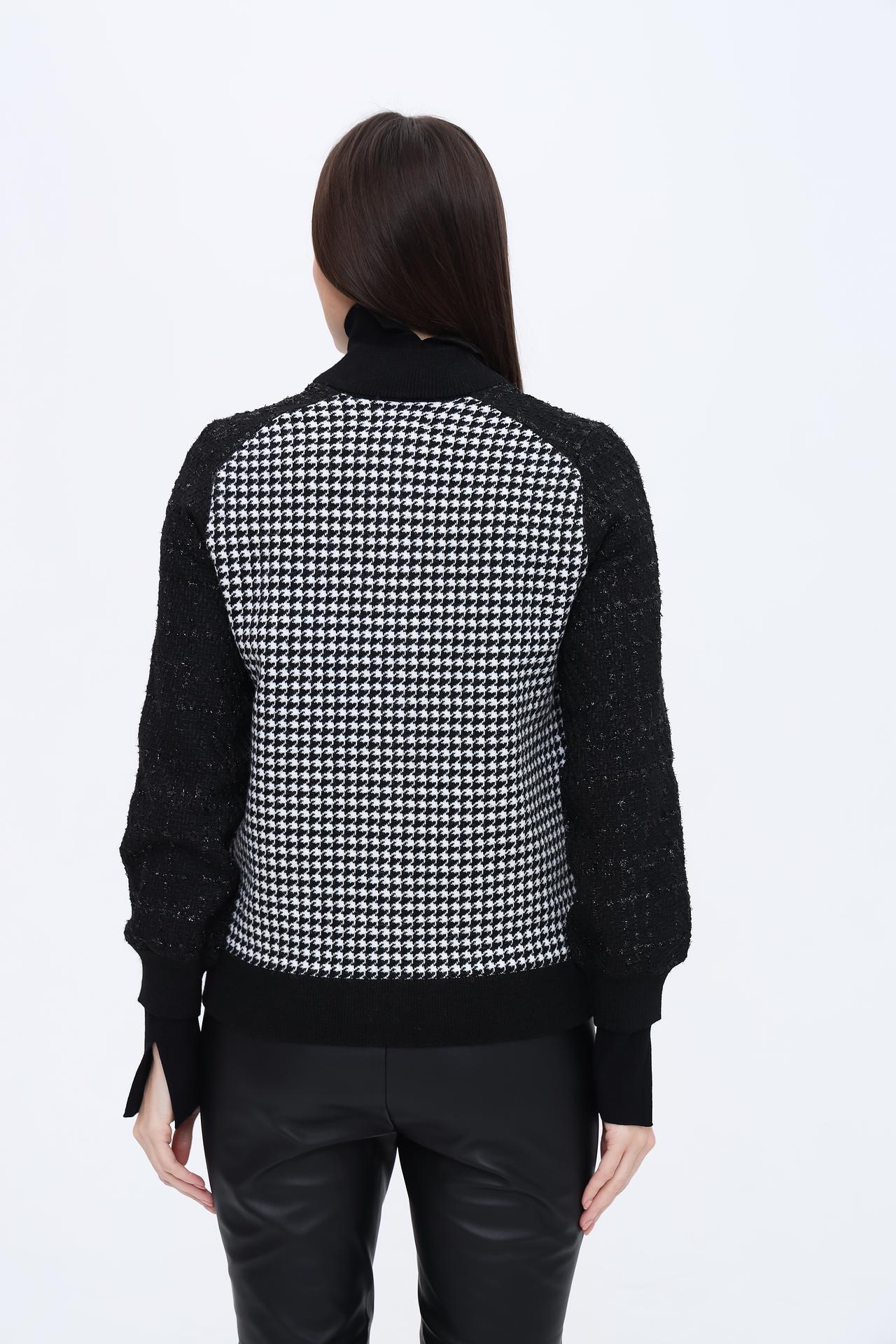 - Дизайн: Классический узор "гусиная лапка" в черно-белом исполнении придает джемперу изысканный вид. Декоративные элементы, такие как перламутровые пуговицы и карманы на молнии, добавляют оригинальности.