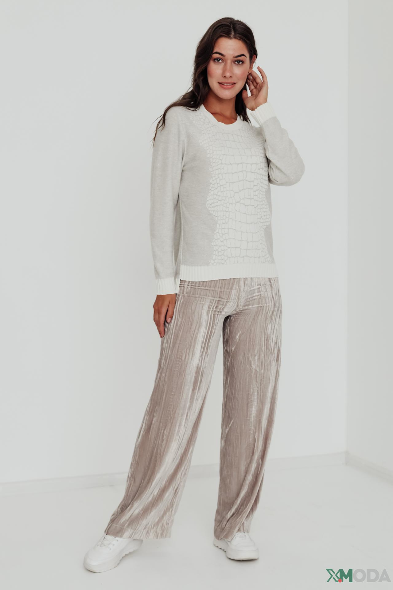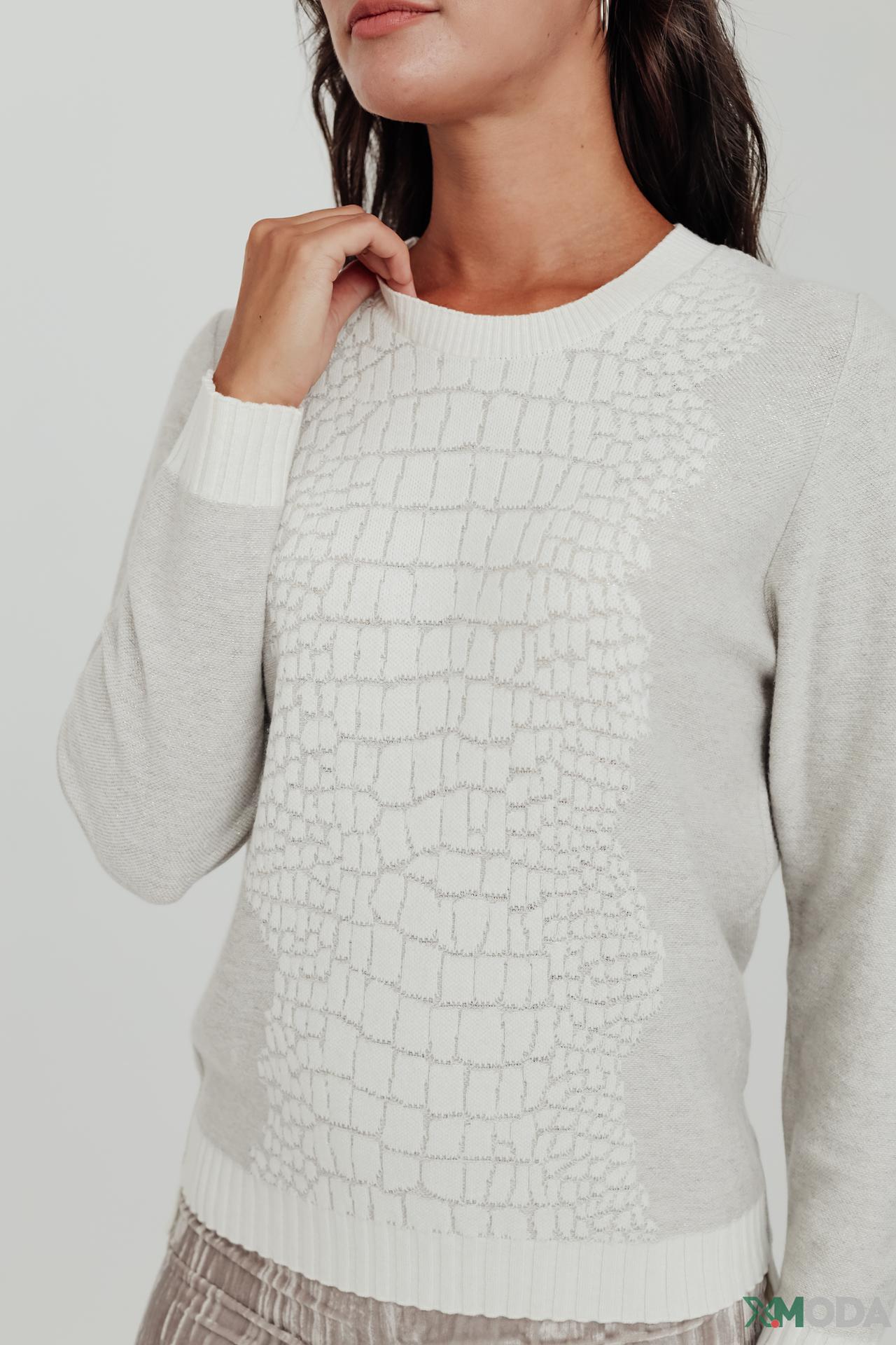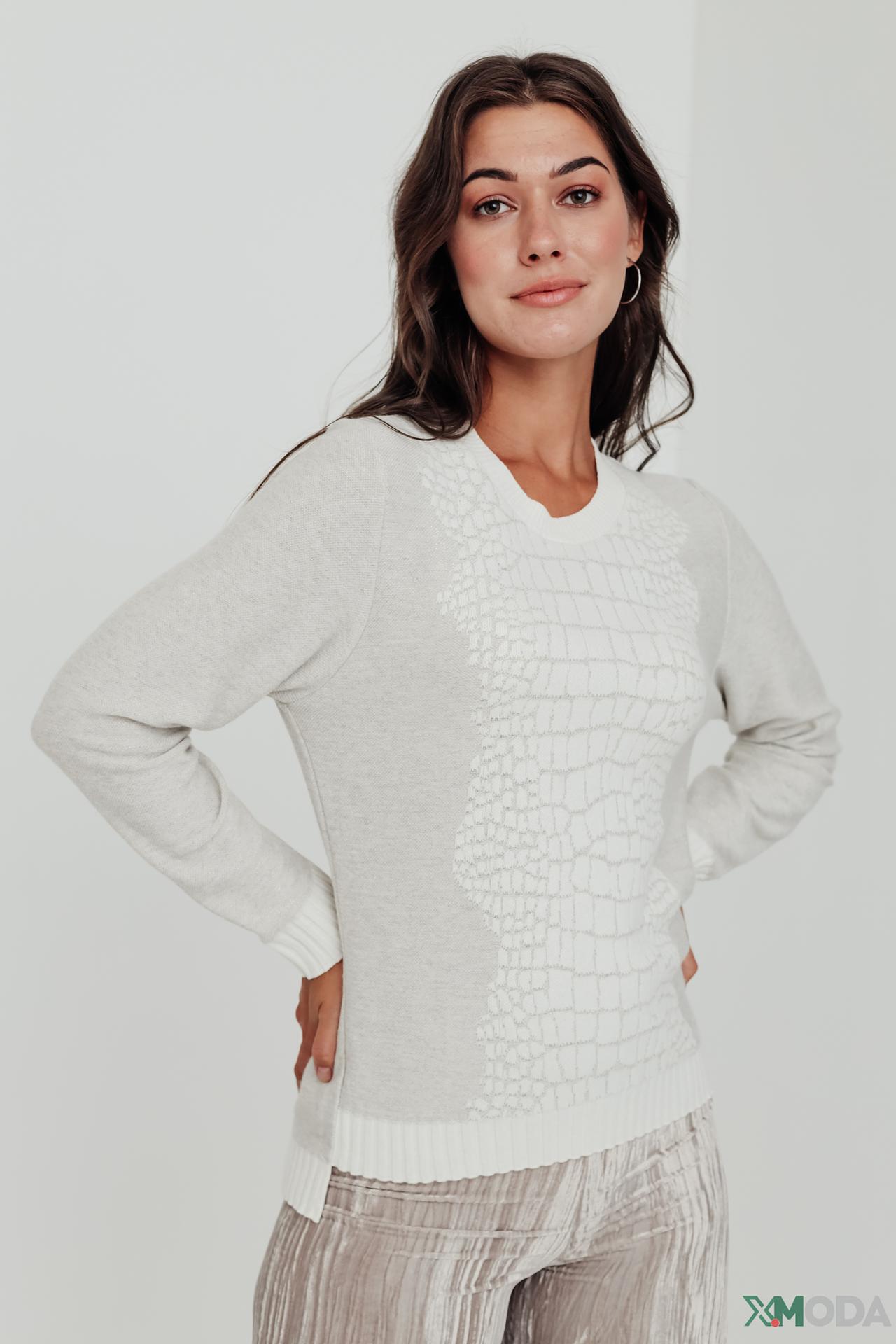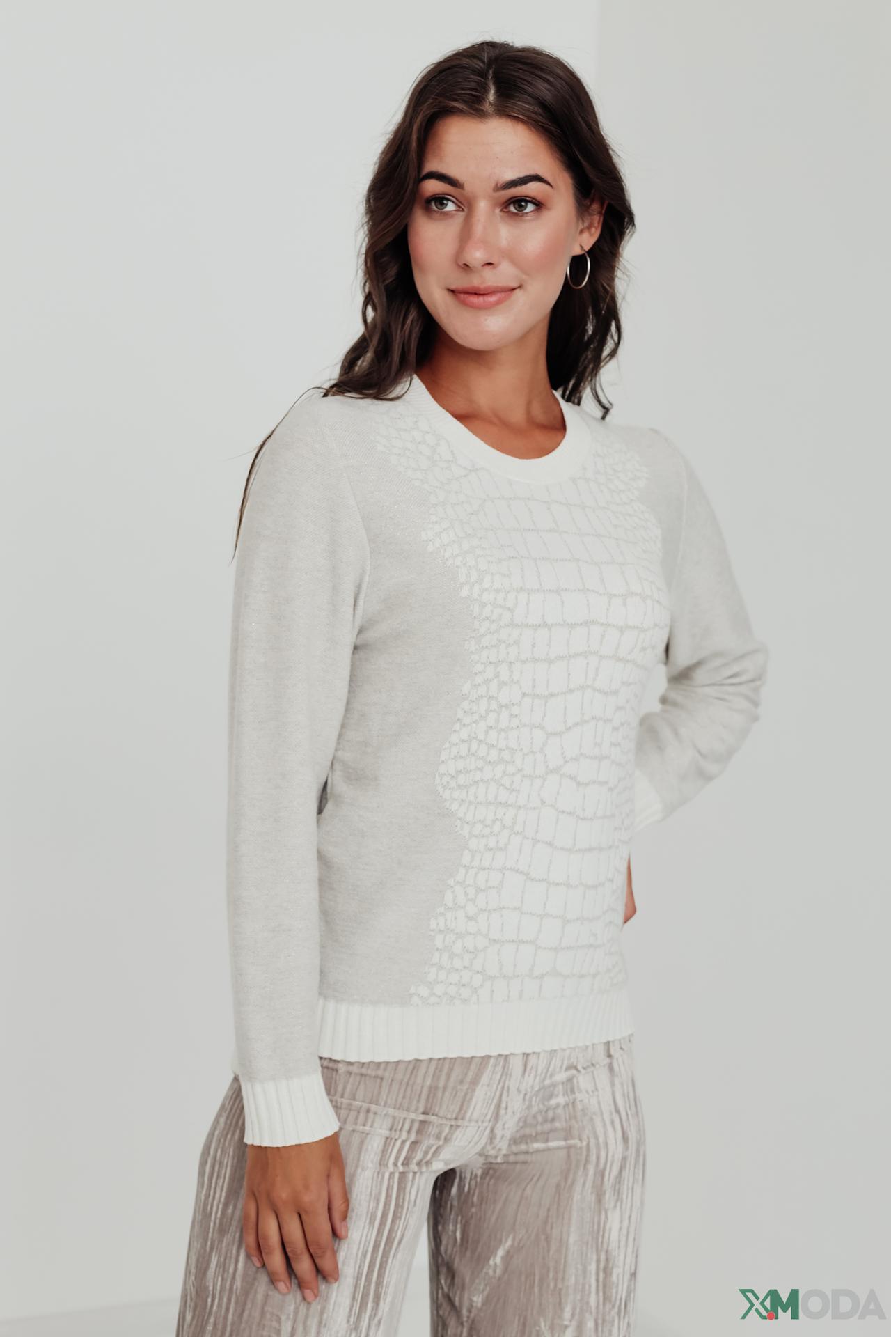 Особенностью модели является уникальный фактурный узор под кожу крокодила, расположенный на передней части изделия, создающий динамичный и современный акцент. Сочетание основного бежевого оттенка с белым контрастным узором и белыми манжетами и нижним краем делает этот трикотажный свитер универсальным для различных сочетаний.