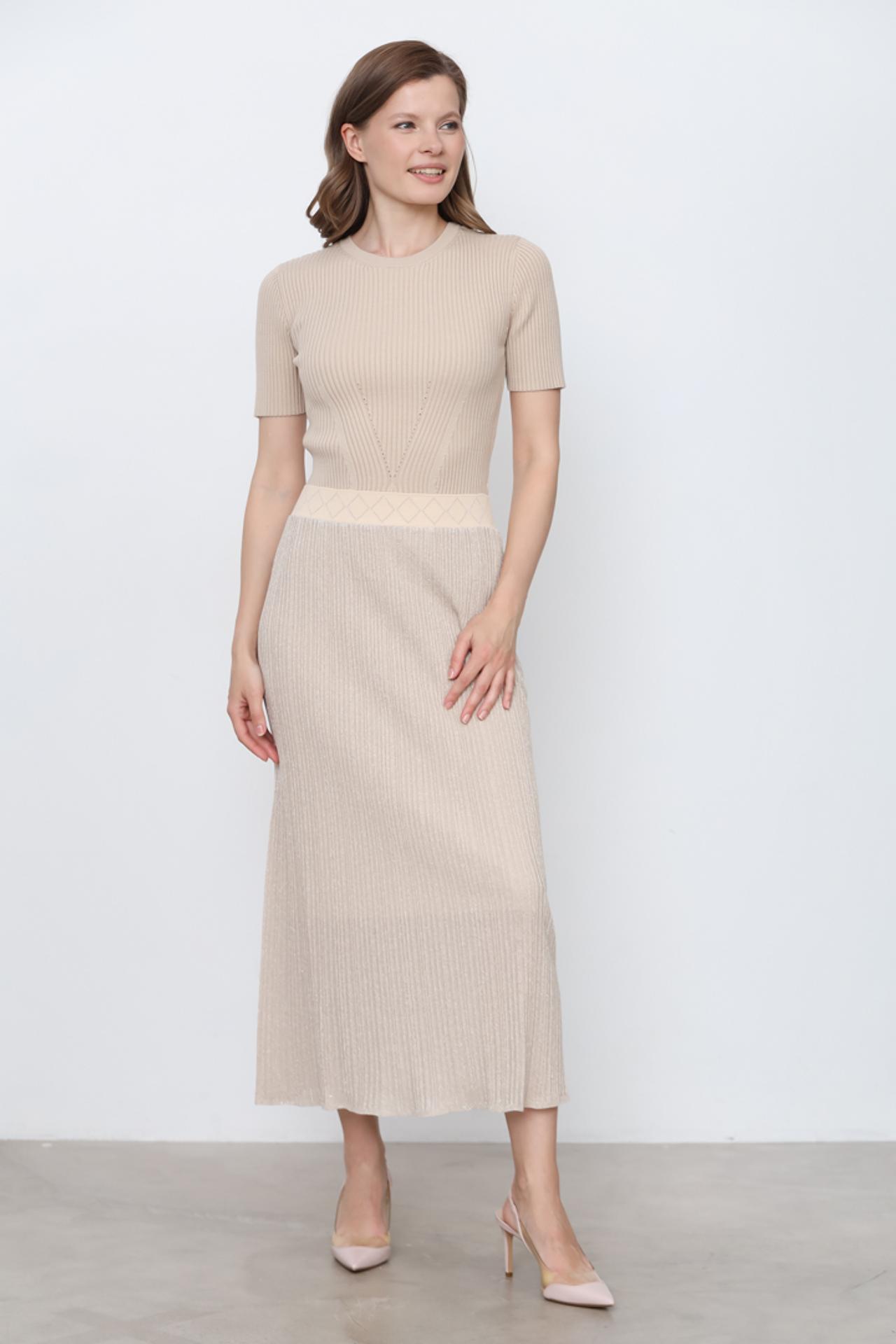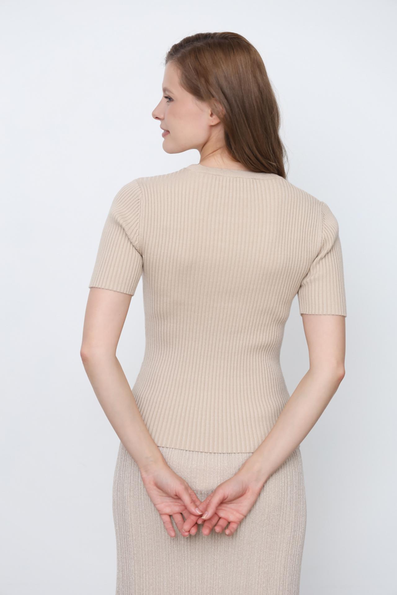 - Дизайн: Модель выполнена в рубчик, с короткими рукавами и круглой горловиной. Вертикальные линии визуально стройнят силуэт, а деликатный V-образный узор спереди добавляет изысканности.