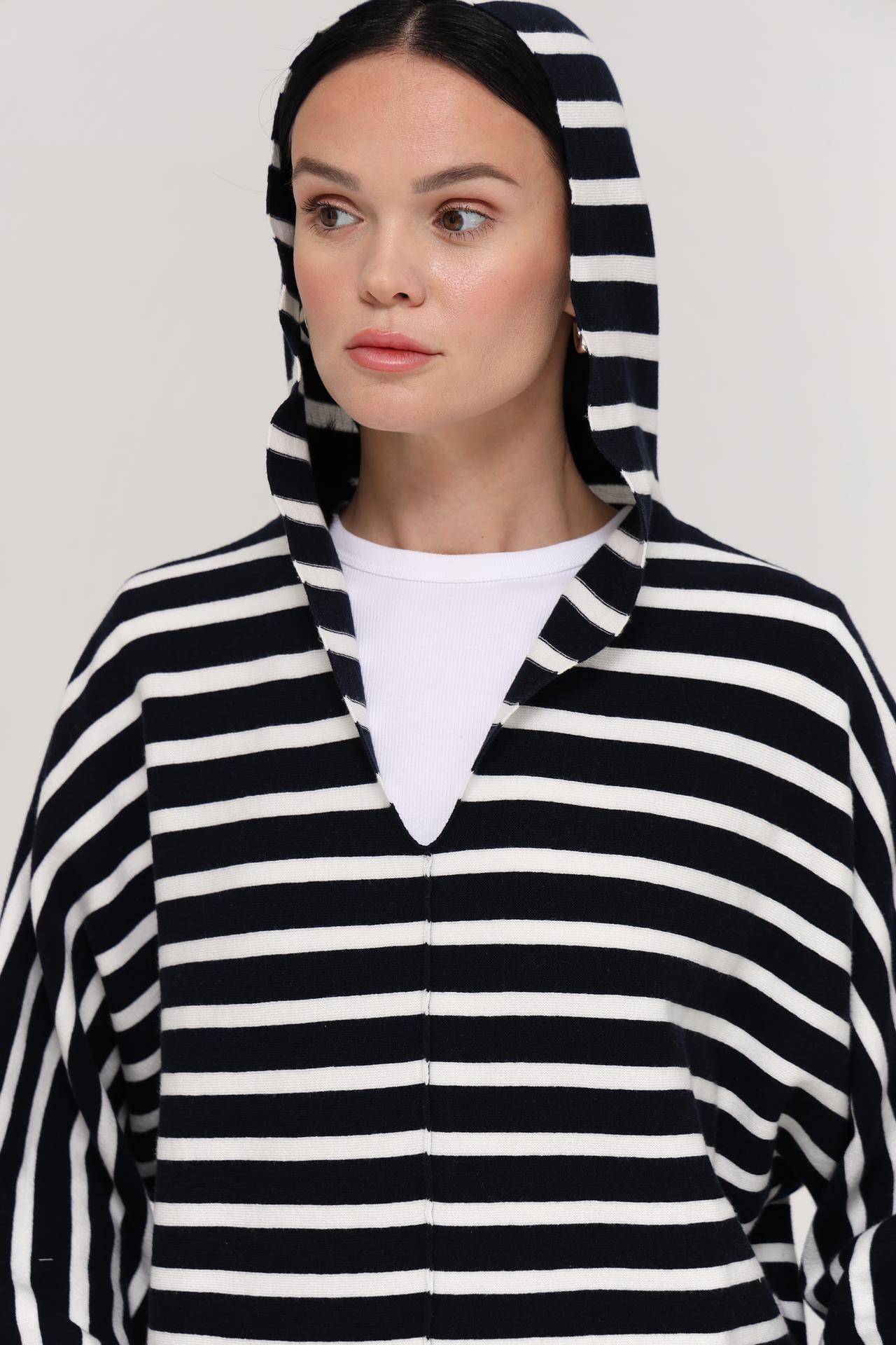 - Дизайн: Классическая полоска, V-образный вырез и капюшон создают актуальный и стильный вид. Крой оверсайз дарит свободу движений.