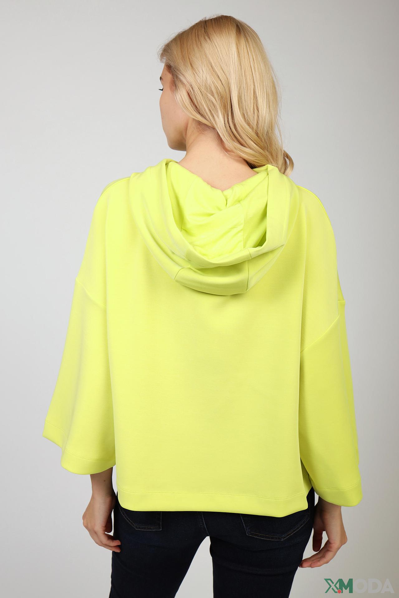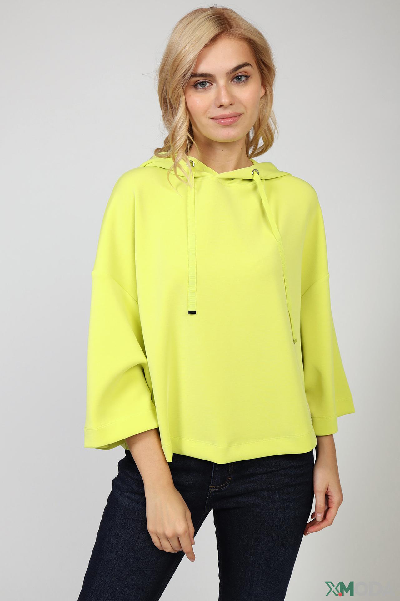 Пуловер женский желтого цвета от бренда Comma. Модель выполнена расклешённым покроем. Изделие дополнено округлым воротом, капюшоном с тесьмой, расклешенными рукавами 3/4 длины. Состав: 4% эластан, 48% полиэстер, 48% модал. Сочетать можно с различными деталями вашего гардероба.