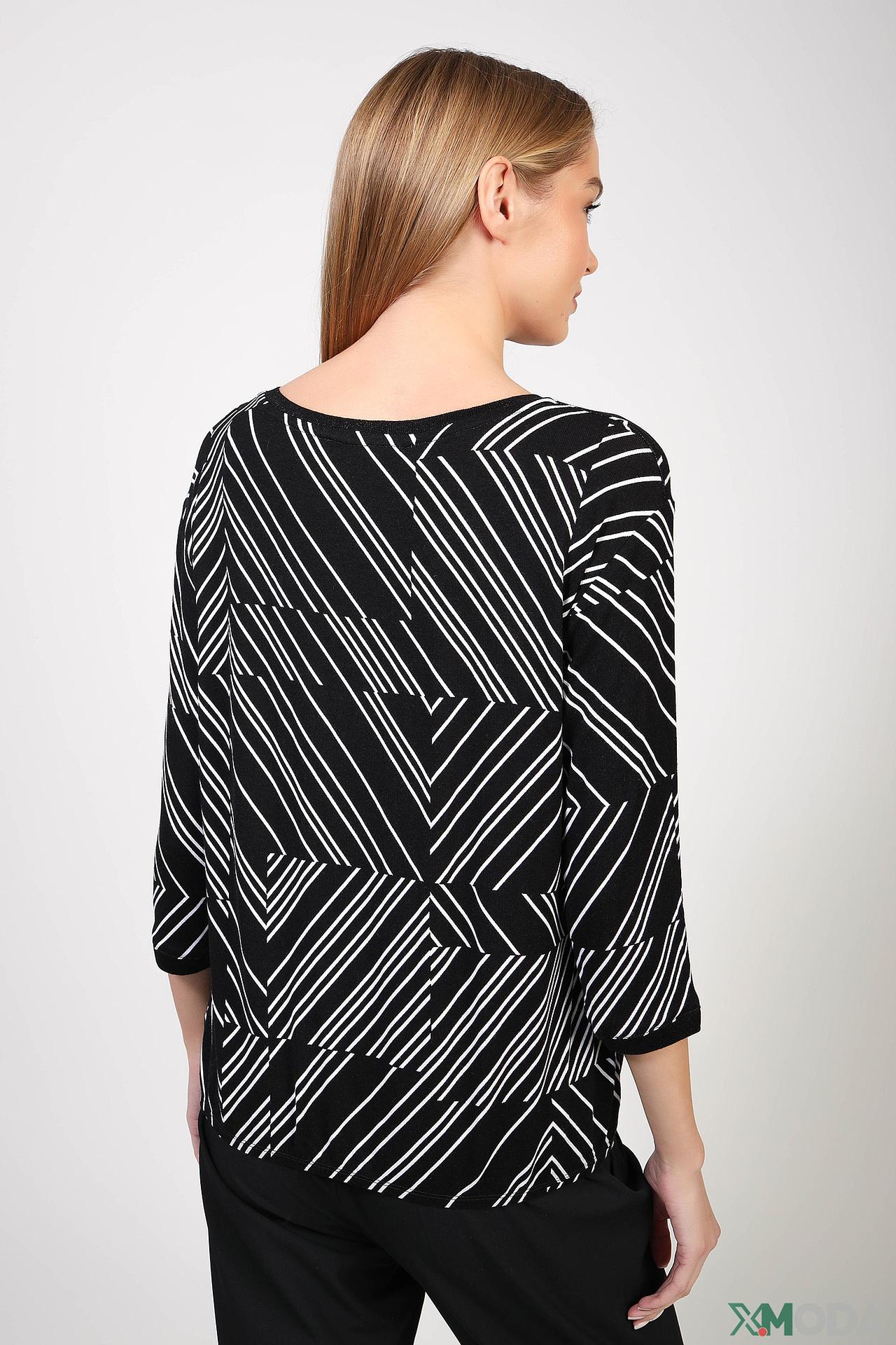 Модель имеет округлый вырез горловины и рукава длиной три четверти, что придает ей универсальность. Яркий абстрактный принт из контрастных линий создает динамичный и современный вид. Фронтальная часть украшена изысканным декором из страз и пайеток, добавляющим изделию неповторимый шарм и элегантность.