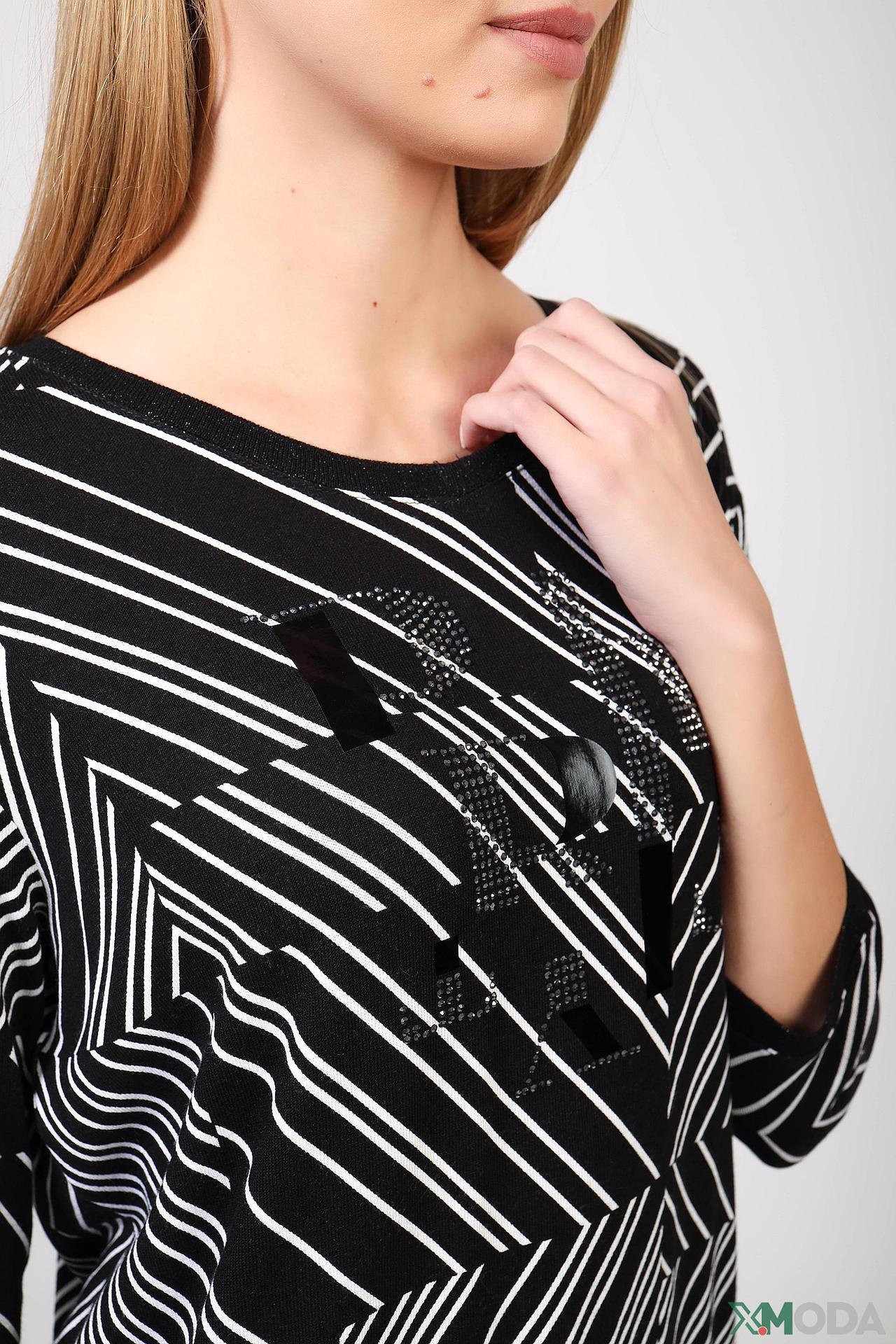 - Стильный дизайн: Контрастный чёрно-белый геометрический узор придает пуловеру современный и выразительный вид, делая его акцентным элементом любого образа. Декоративные элементы со стразами добавляют изящества.