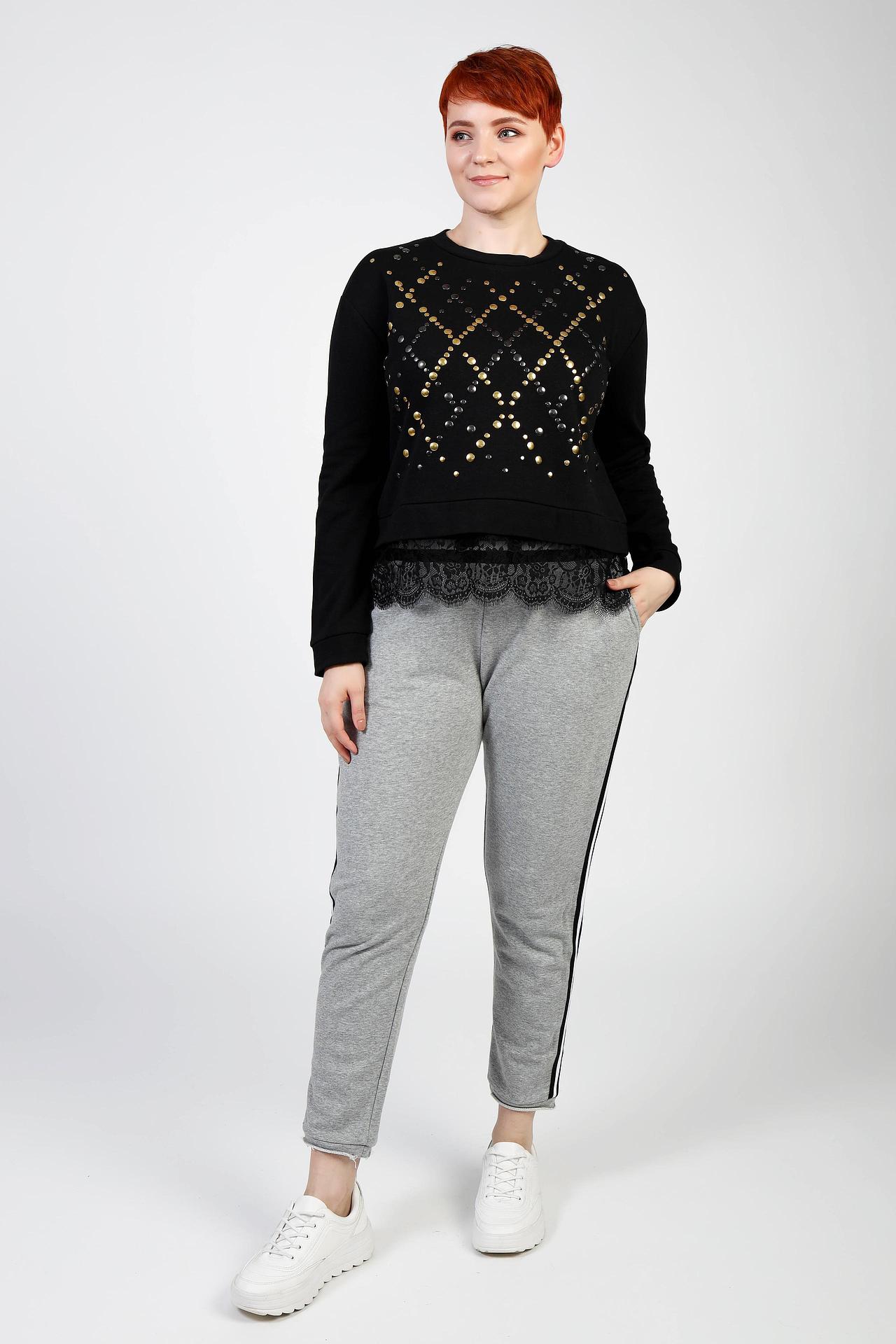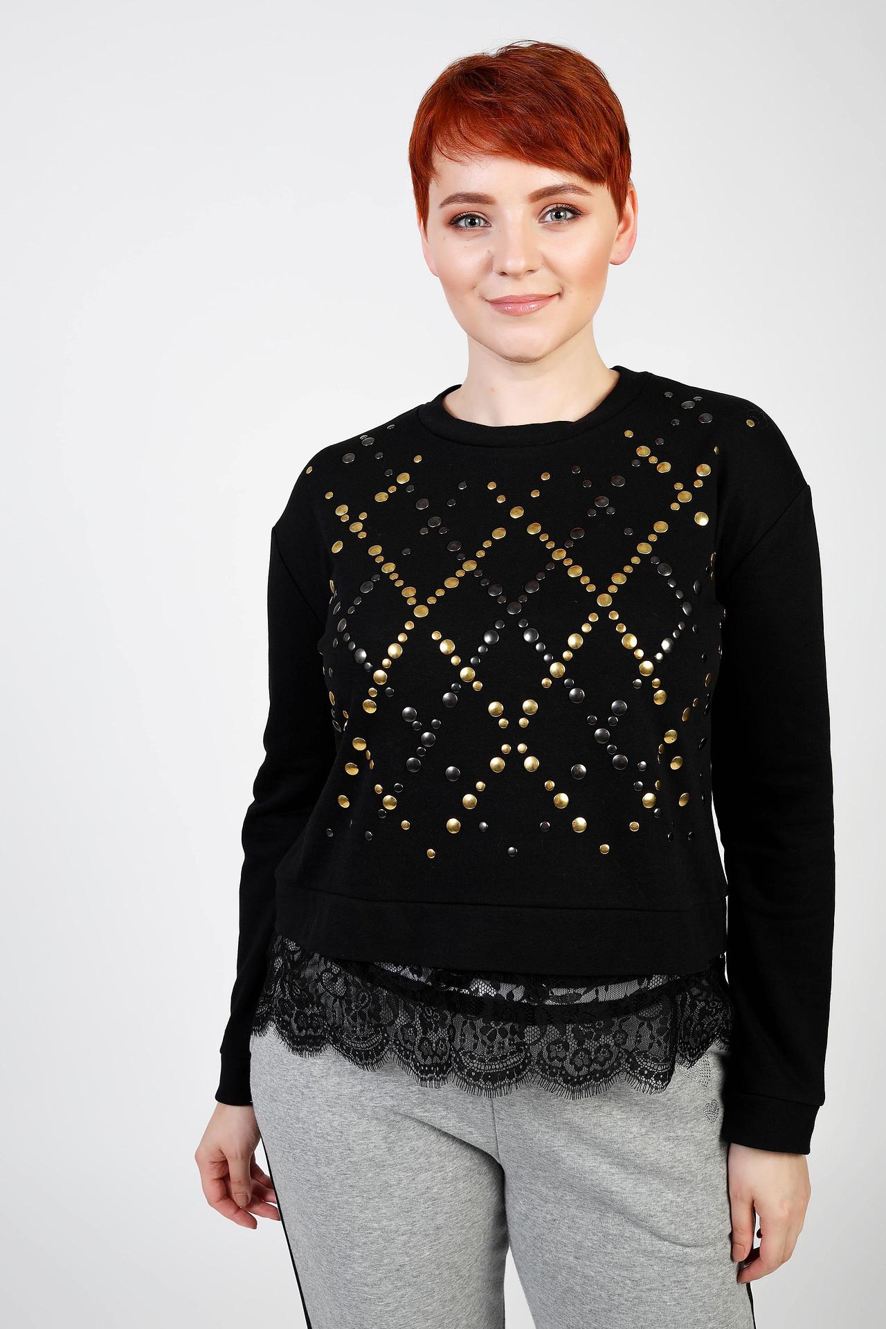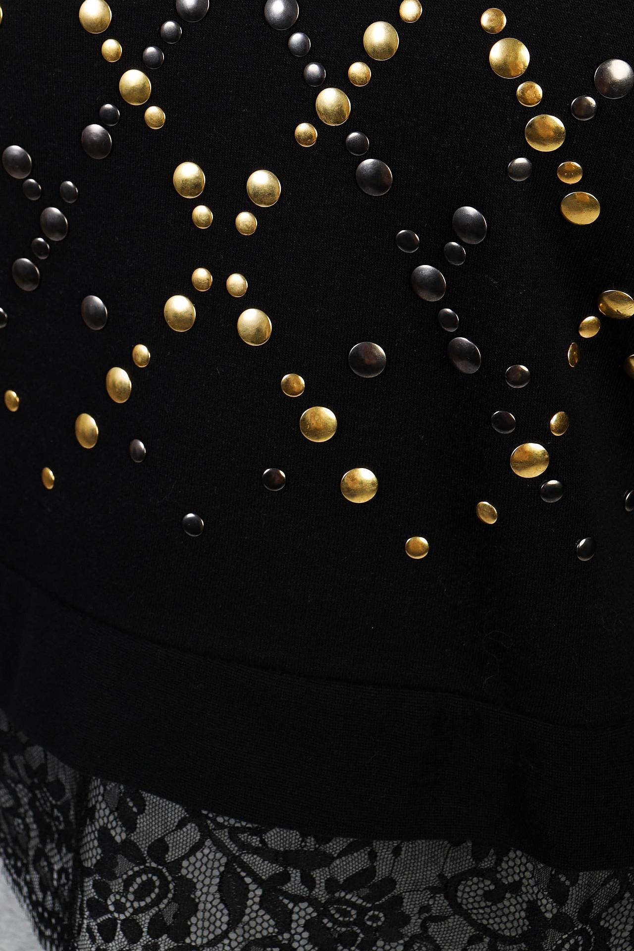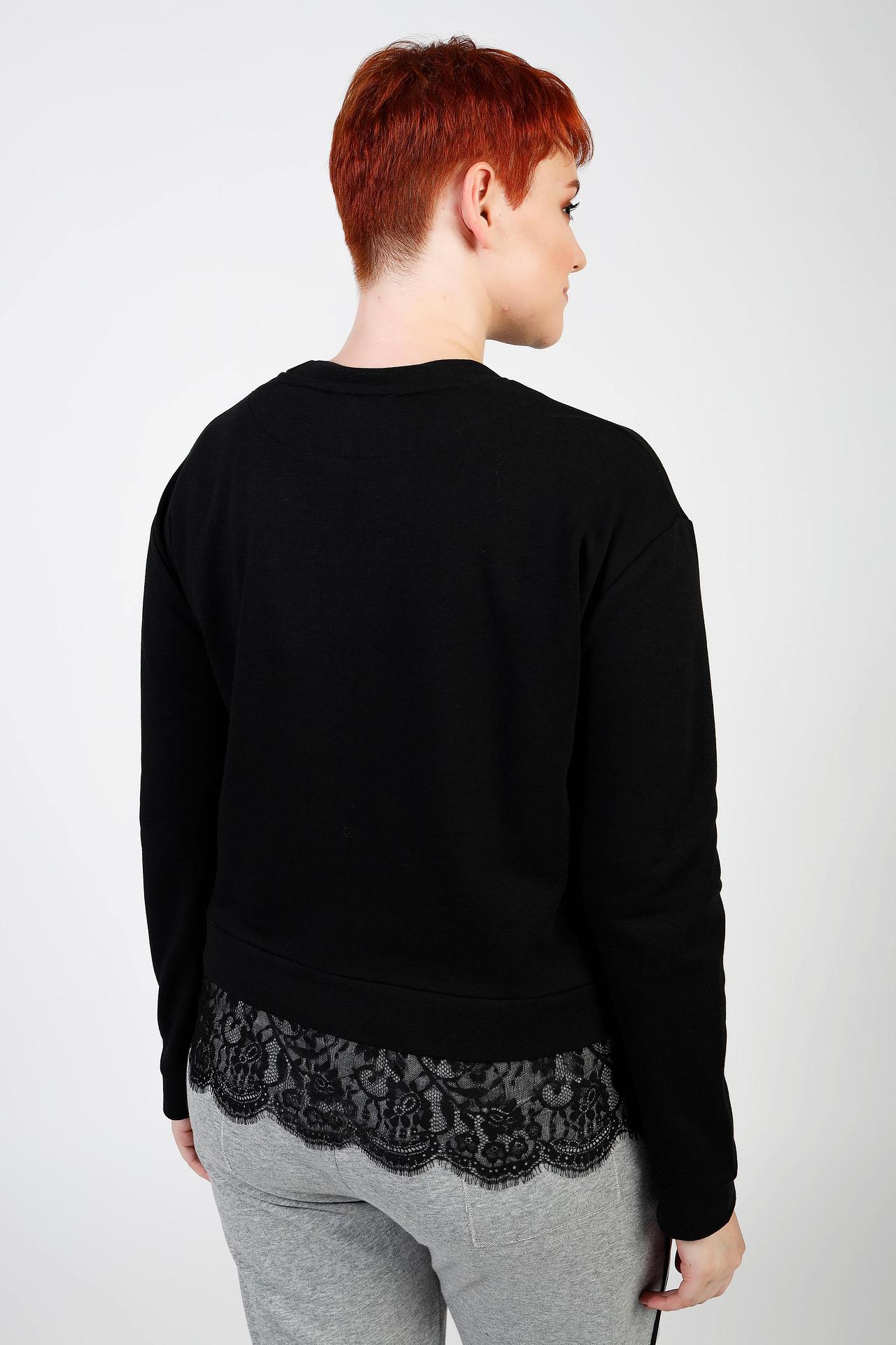 - Кружевная отделка: Нижняя часть пуловера дополнена изящным черным кружевом, создавая контраст и элегантность.