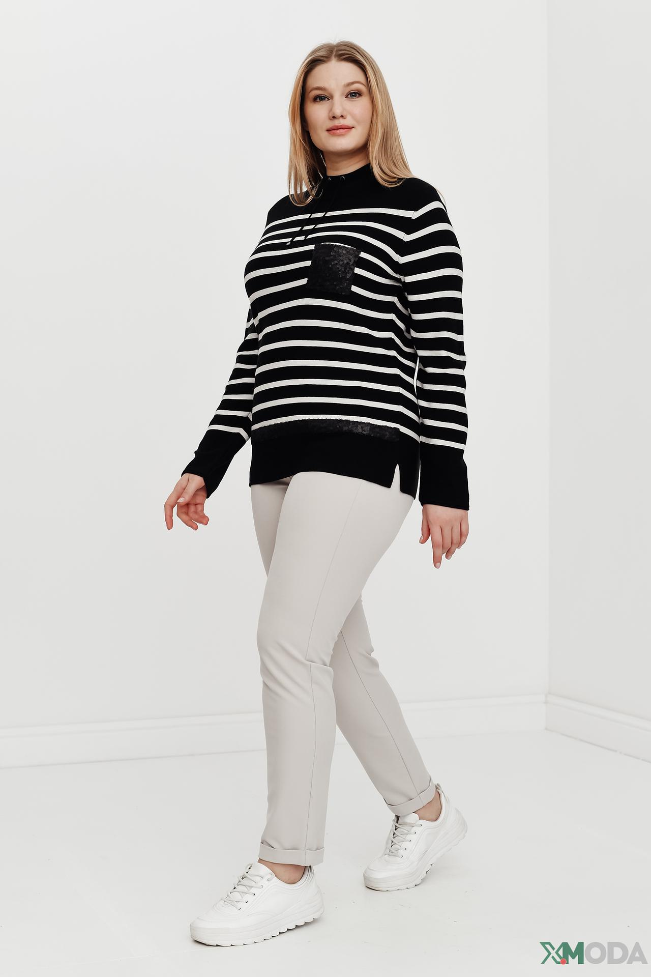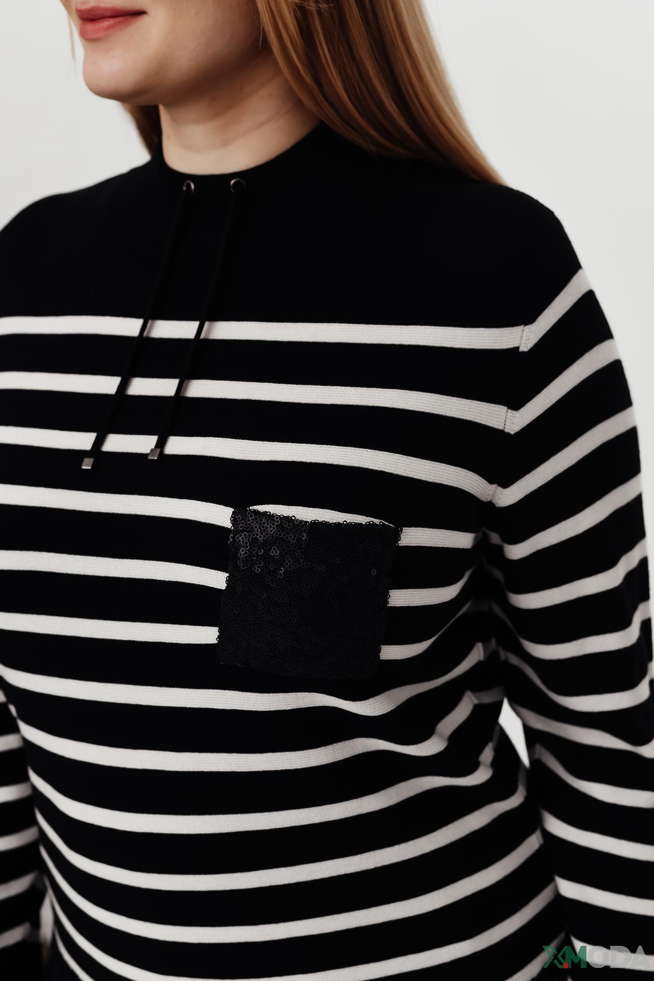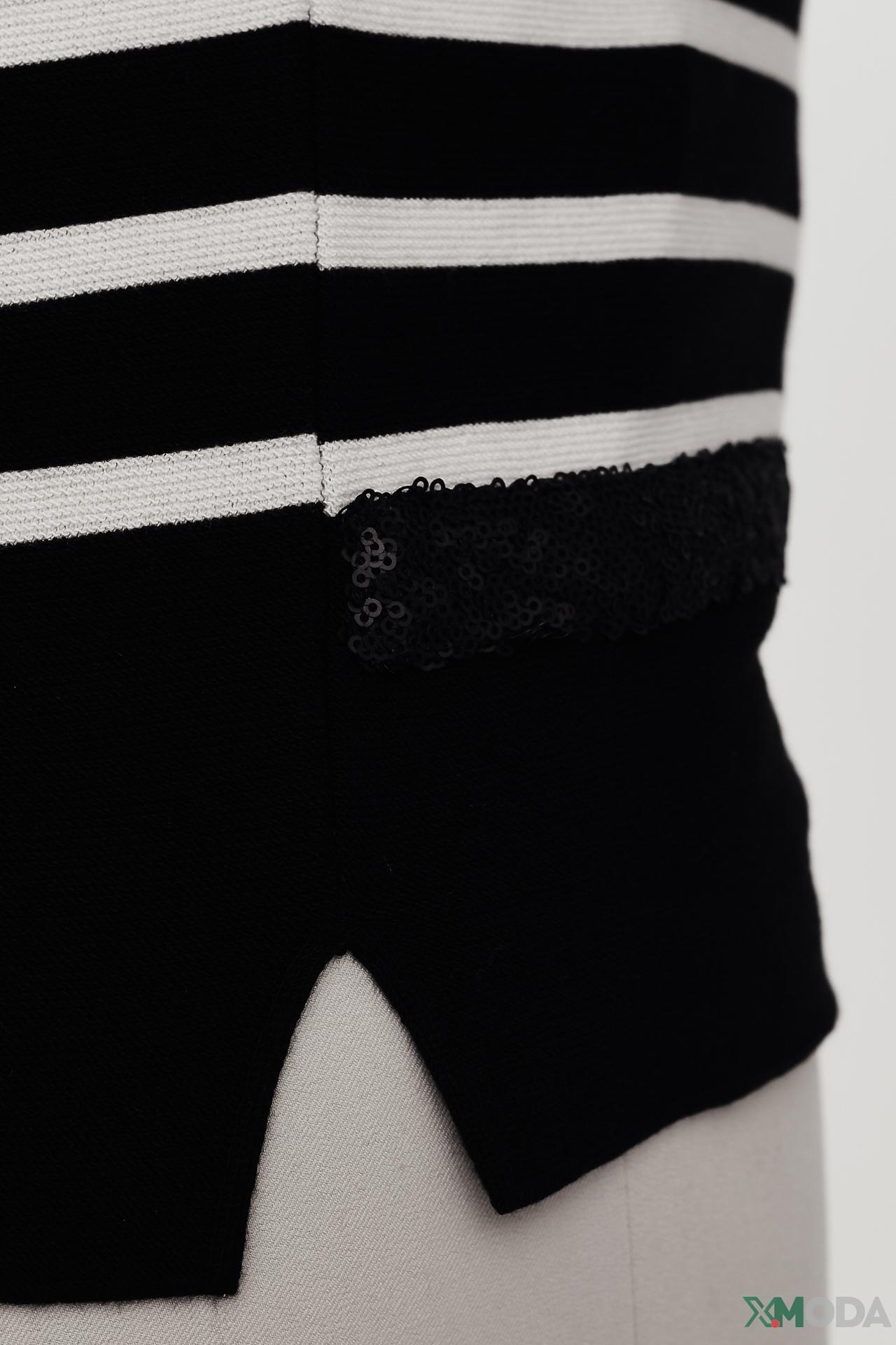 Пуловер декорирован накладным карманом спереди, украшенным блестящими пайетками, и контрастной планкой по низу изделия, также расшитой пайетками, что придает ему особый шарм и актуальность.