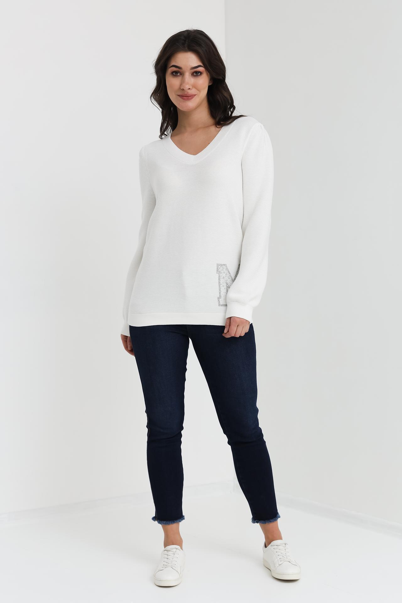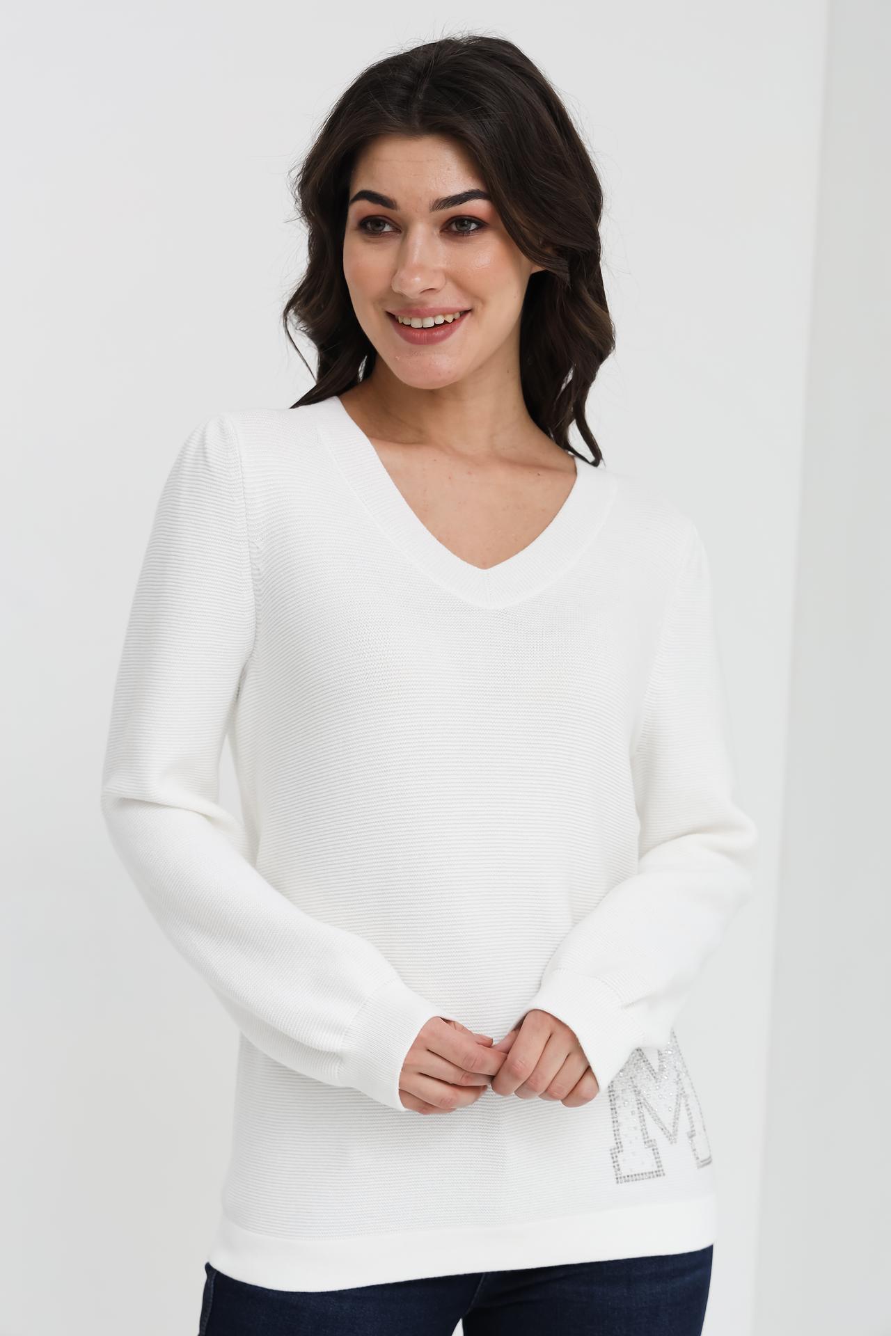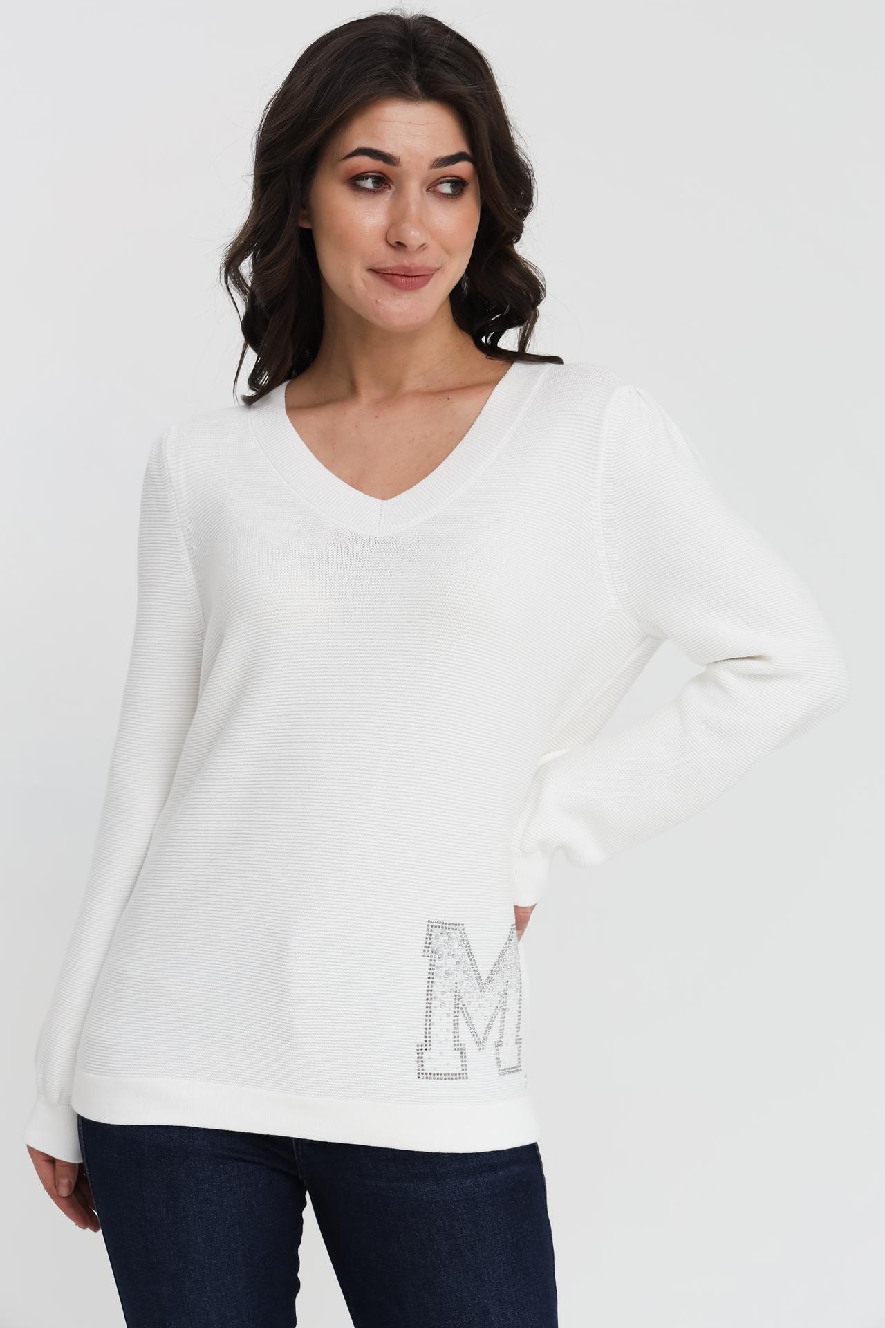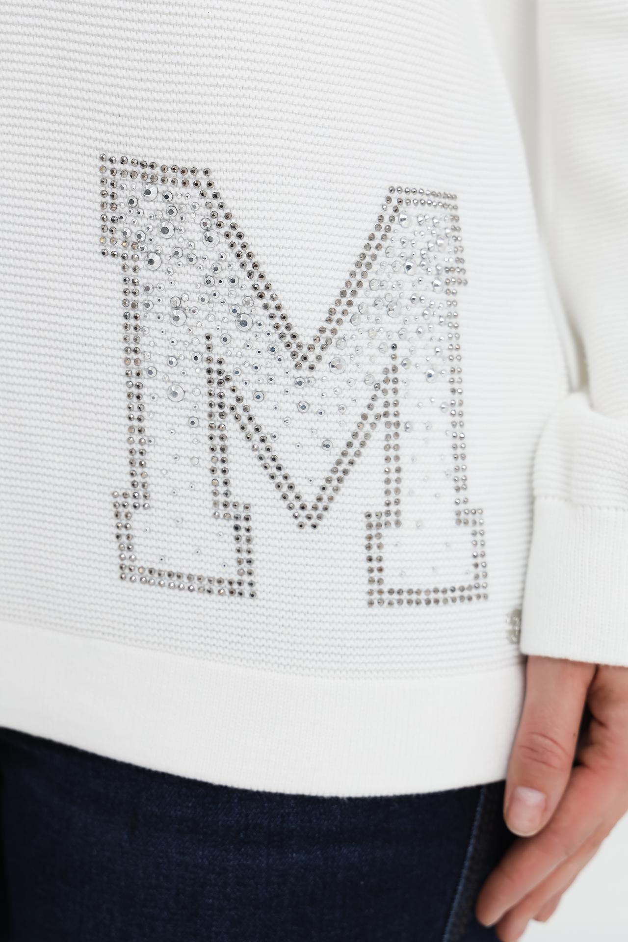 Белый цвет пуловера придает ему свежий и чистый вид, а декор в виде буквы «М» из страз добавляет изысканности и шарма. Классический дизайн и высокое качество материалов делают этот пуловер универсальным для любого случая.