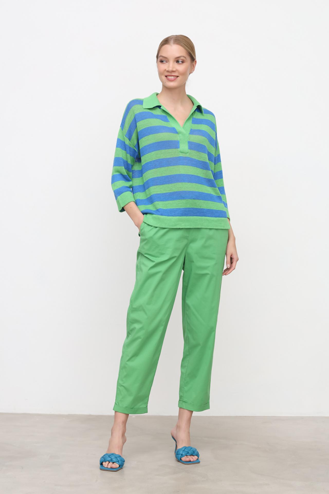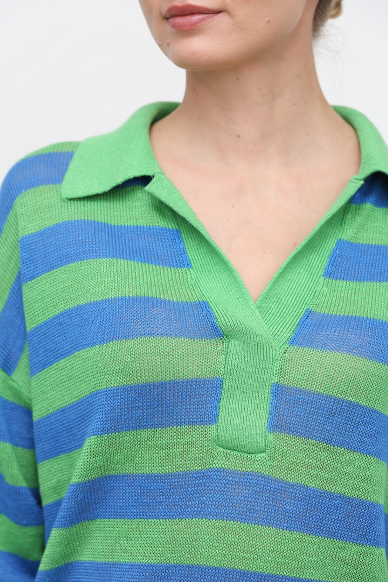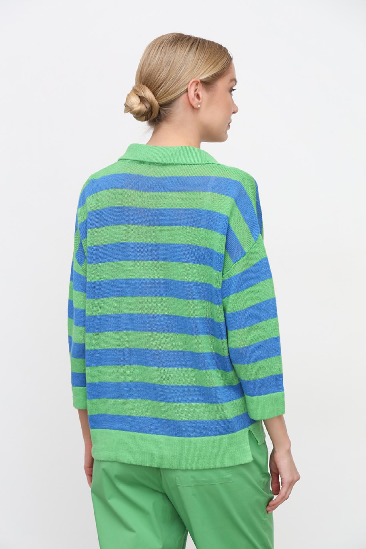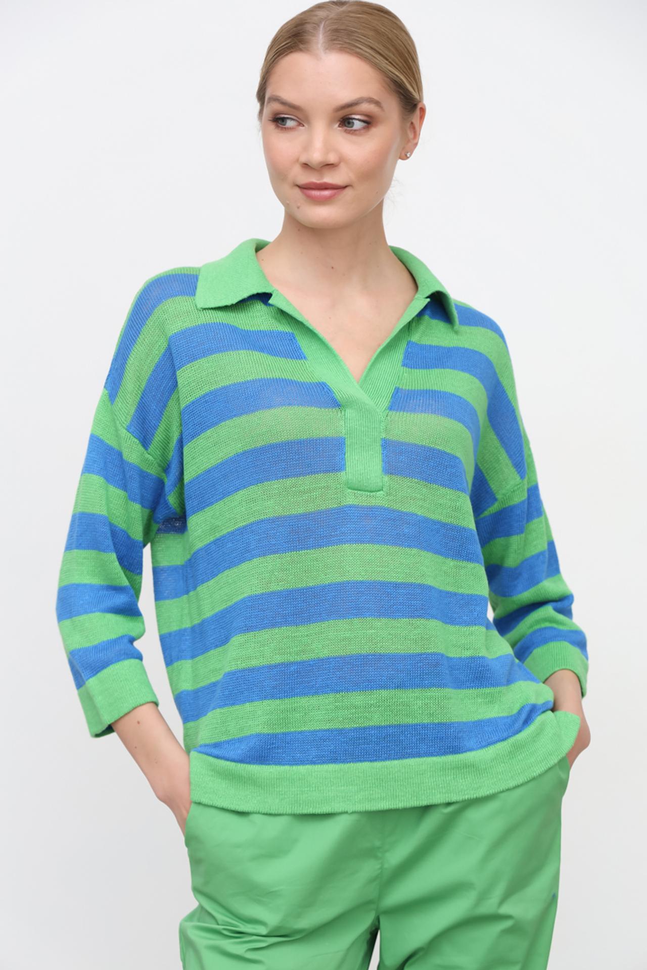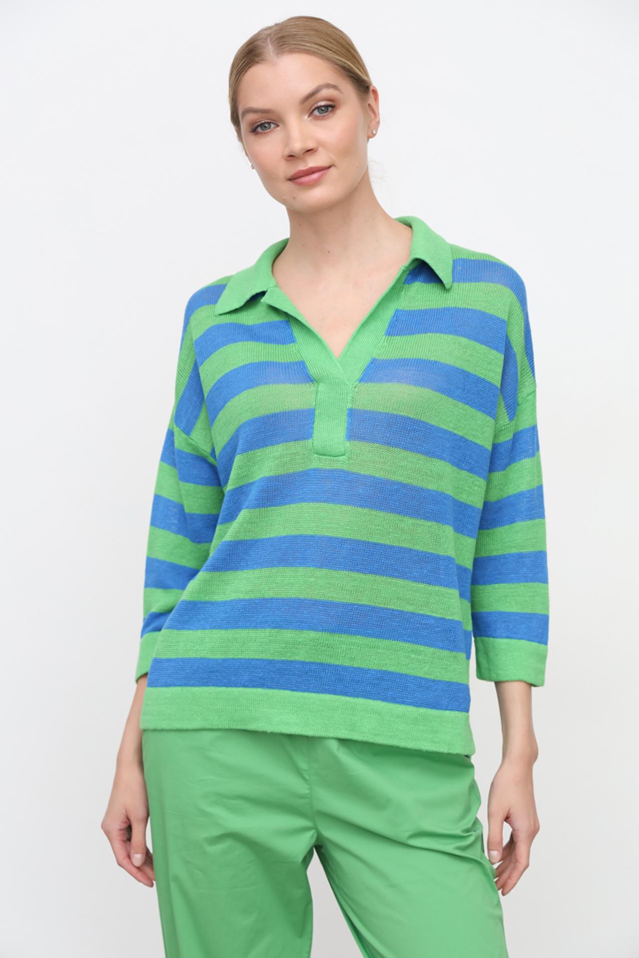 Элегантный полосатый пуловер сочетает в себе классический дизайн с современными элементами. Контрастные зелёные и синие полосы добавляют динамичности, а воротник поло и V-образный вырез создают непринуждённый, но стильный образ. Рукава длиной три четверти обеспечивают свободу движений.