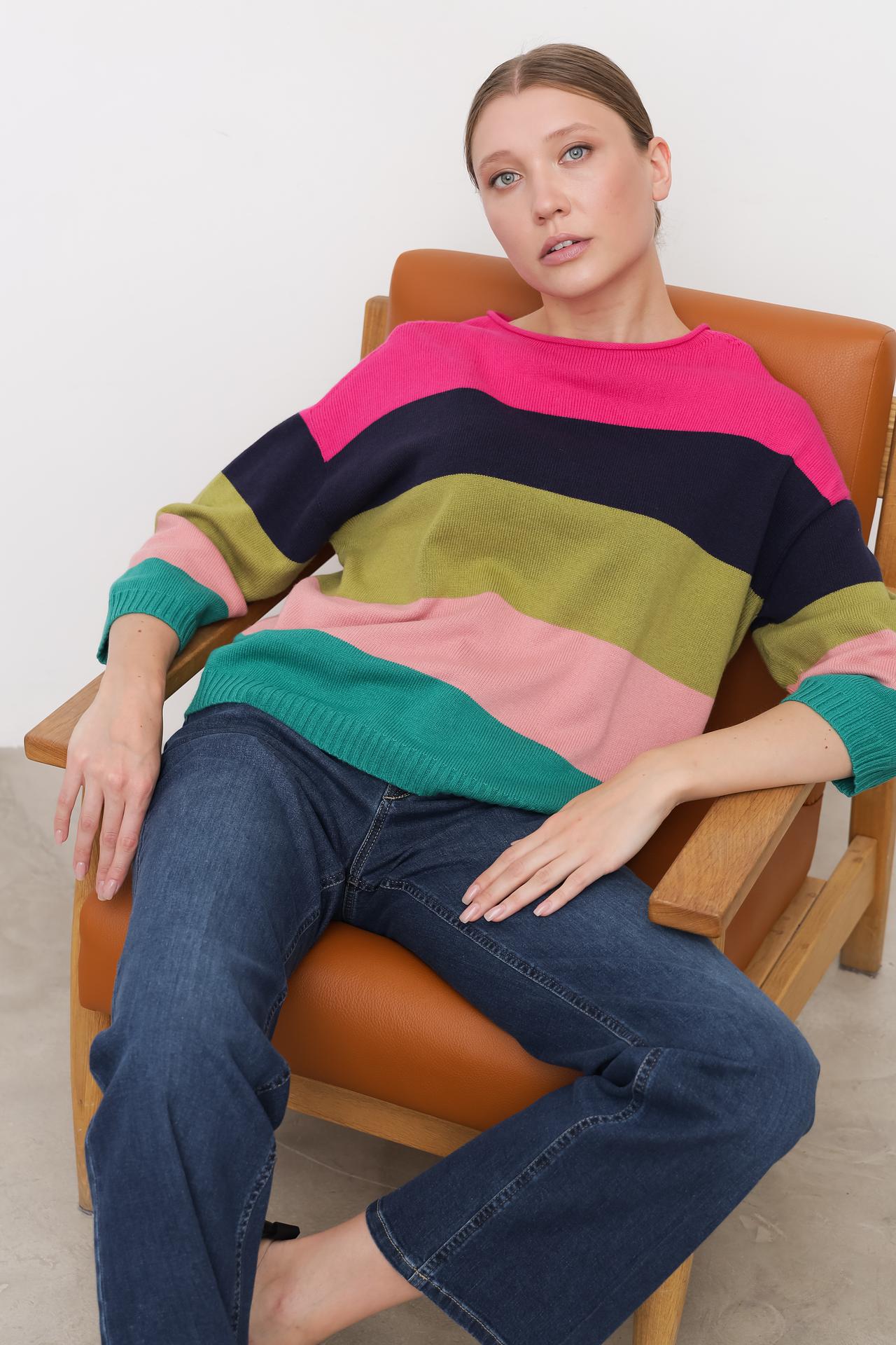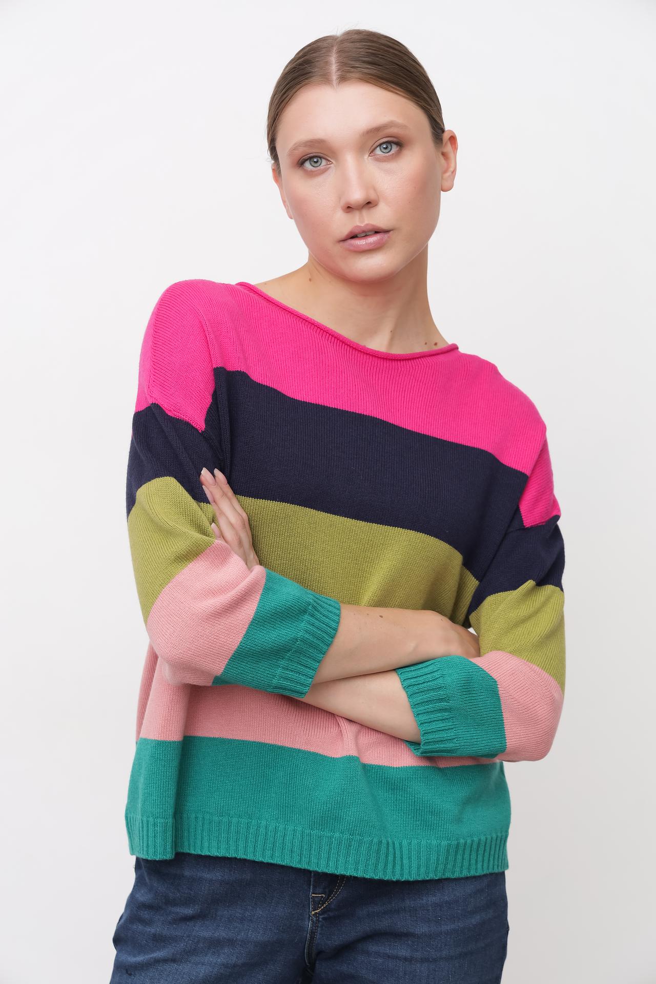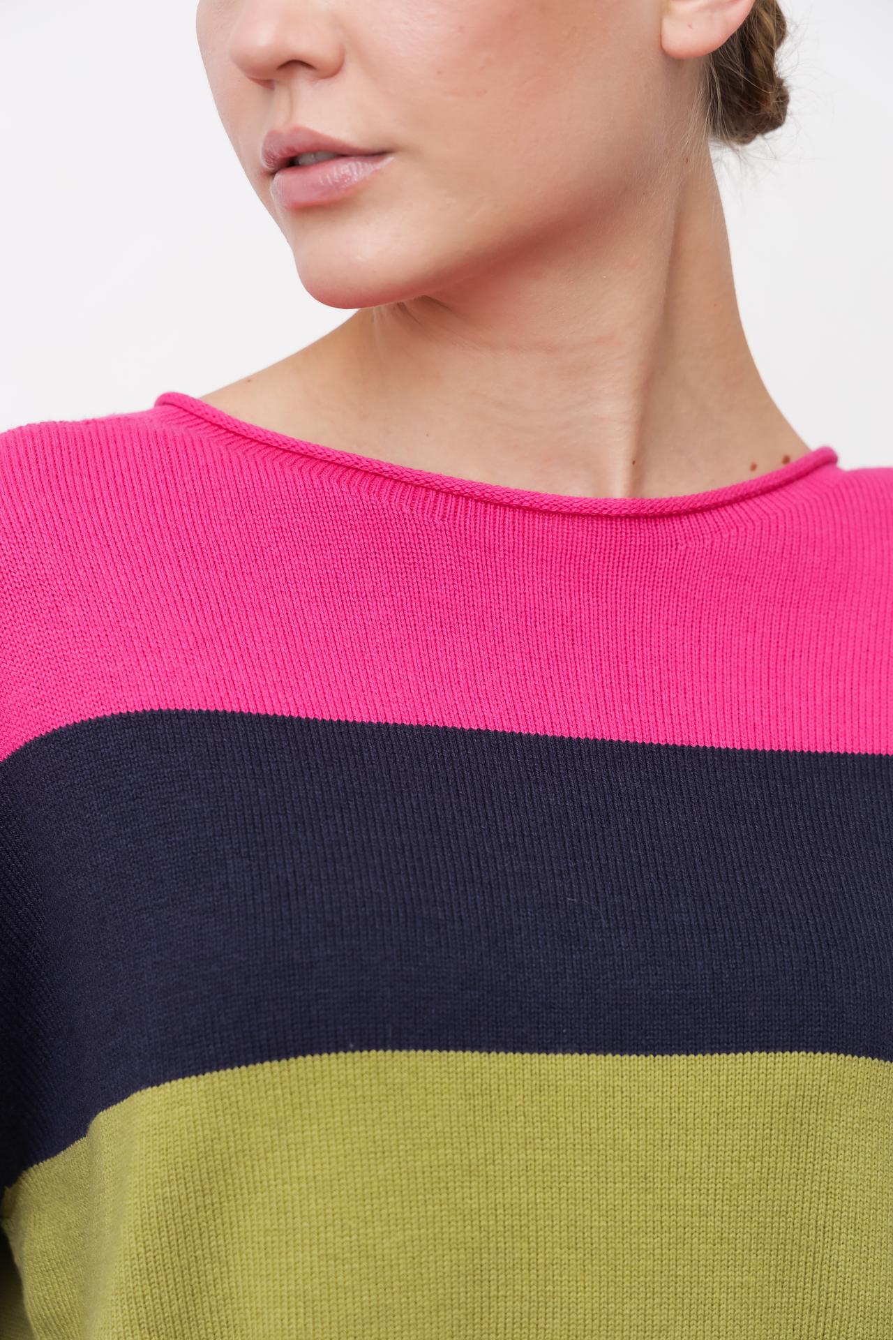 - Яркий полосатый дизайн: Контрастные горизонтальные полосы в оттенках фуксии, темно-синего, оливкового, нежно-розового и бирюзового создают динамичный и свежий вид. Этот модный акцент привнесет игривость и индивидуальность в ваш гардероб.