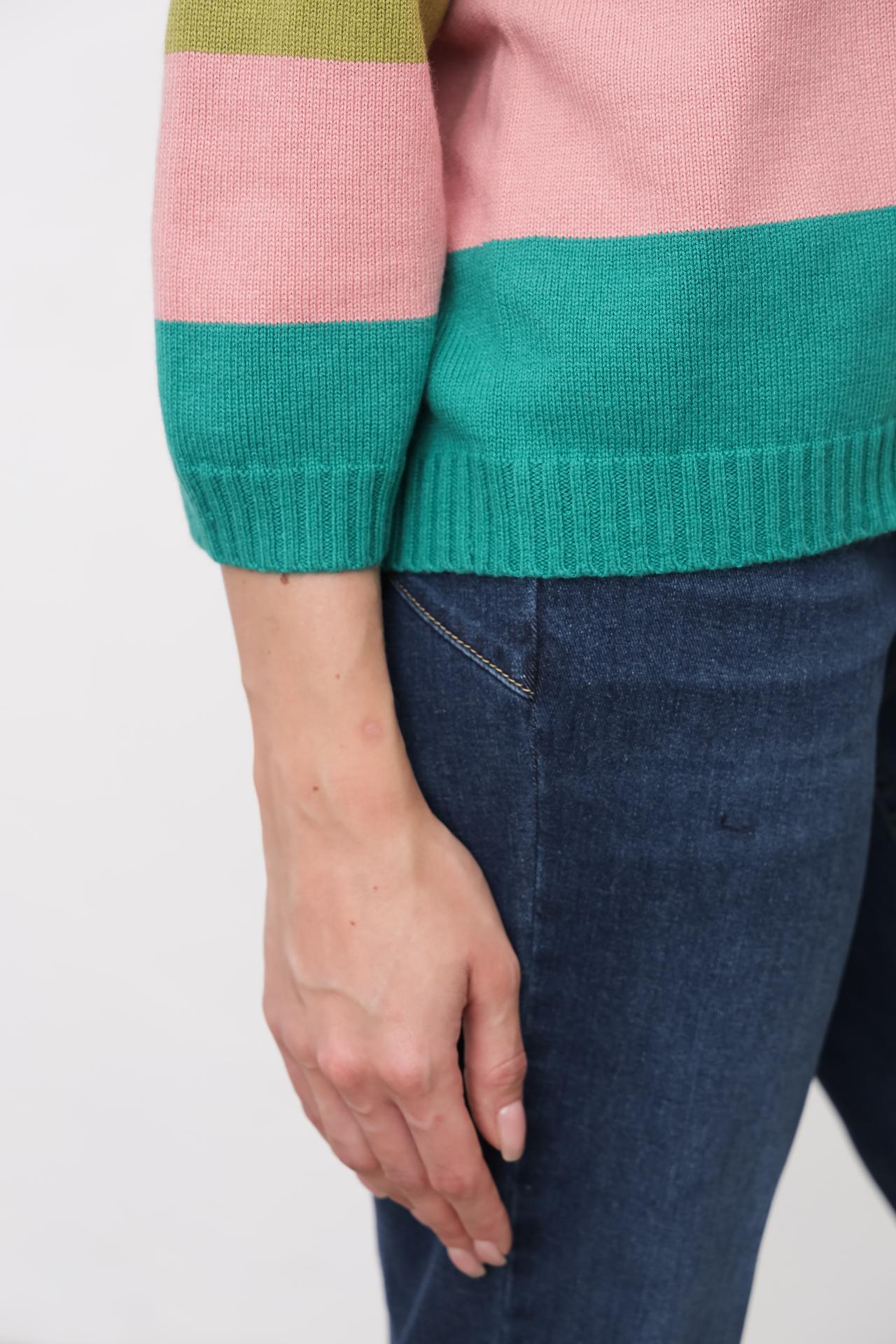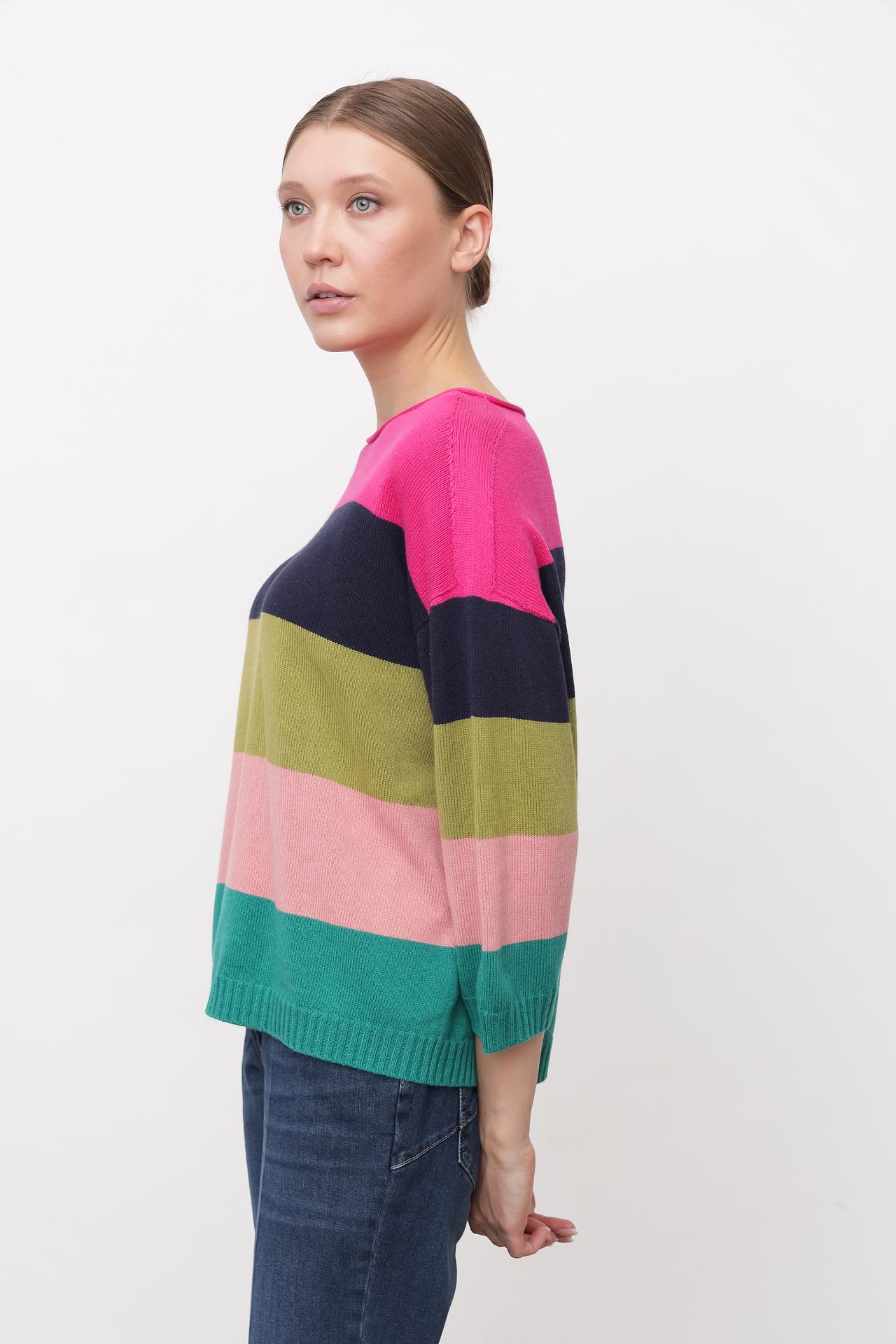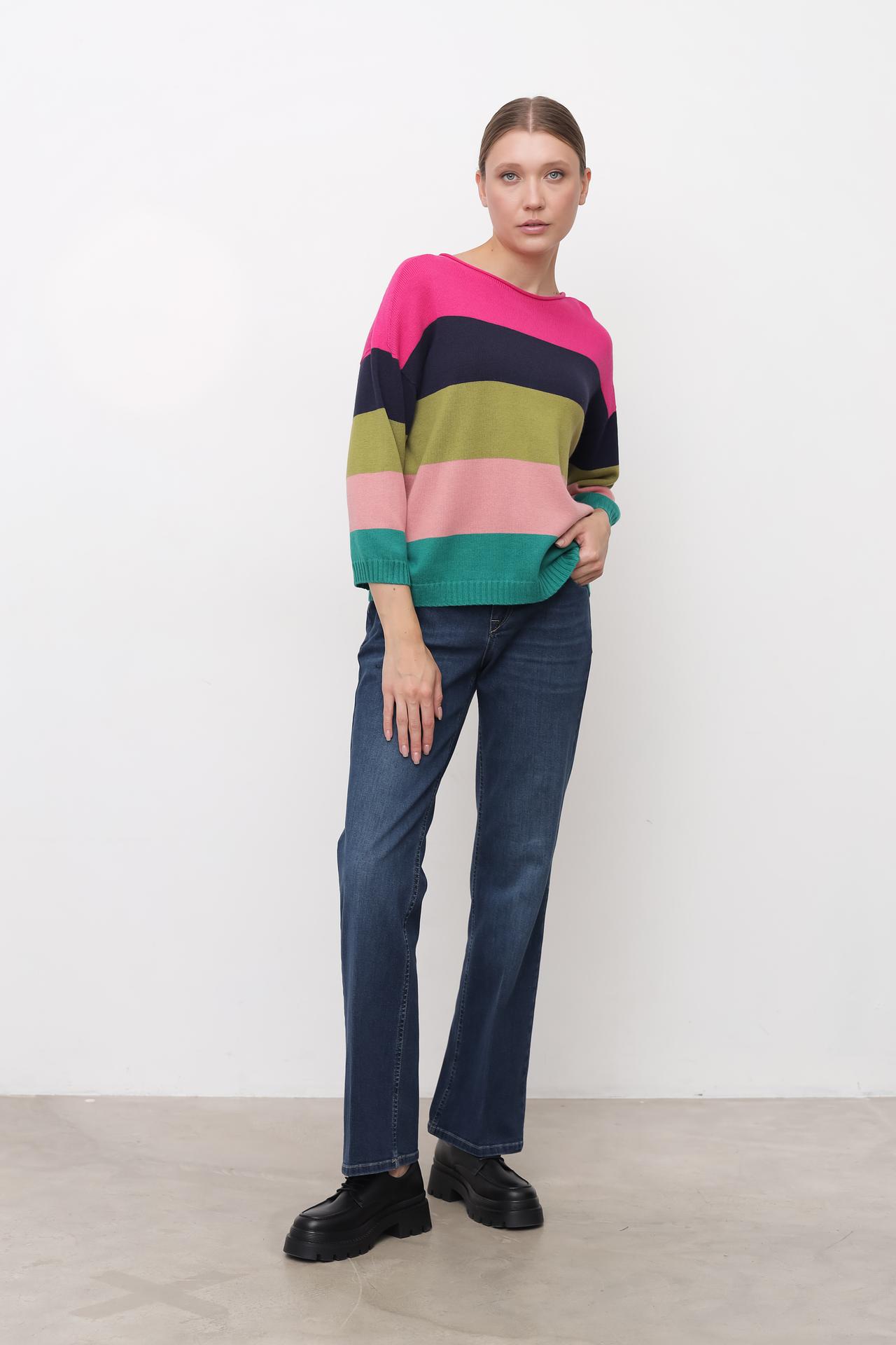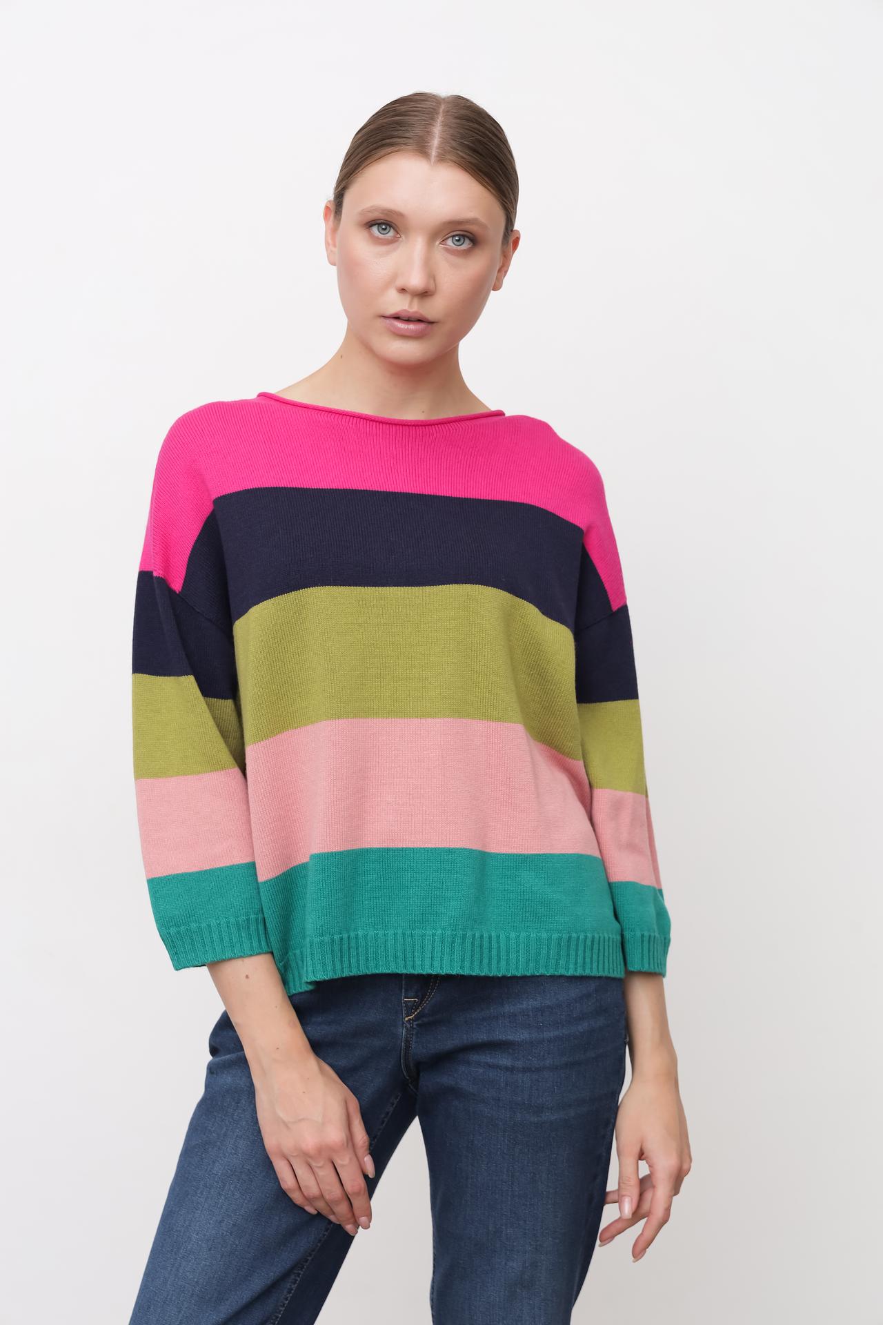 - Яркий полосатый дизайн: Контрастные горизонтальные полосы в оттенках фуксии, темно-синего, оливкового, нежно-розового и бирюзового создают динамичный и свежий вид. Этот модный акцент привнесет игривость и индивидуальность в ваш гардероб.