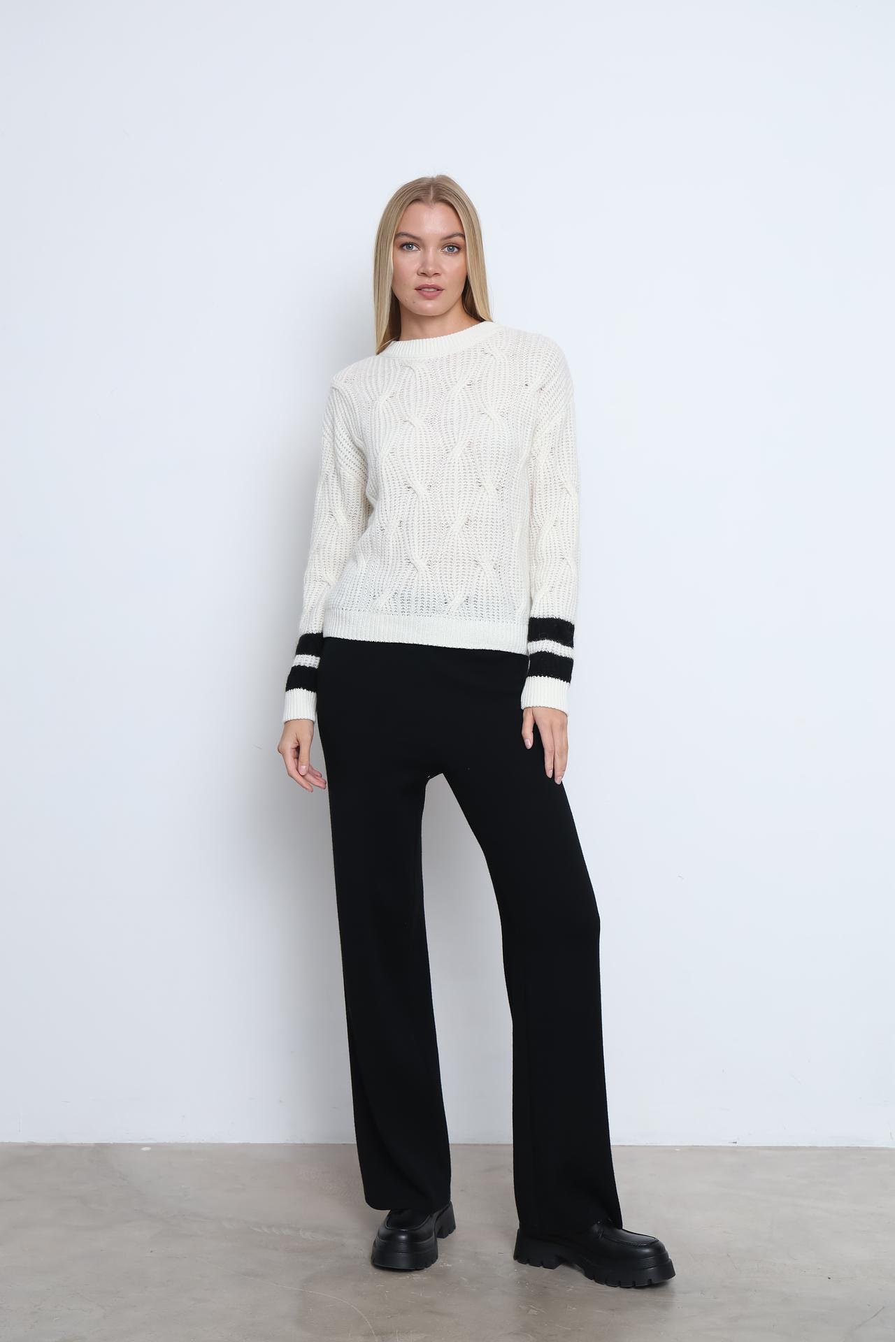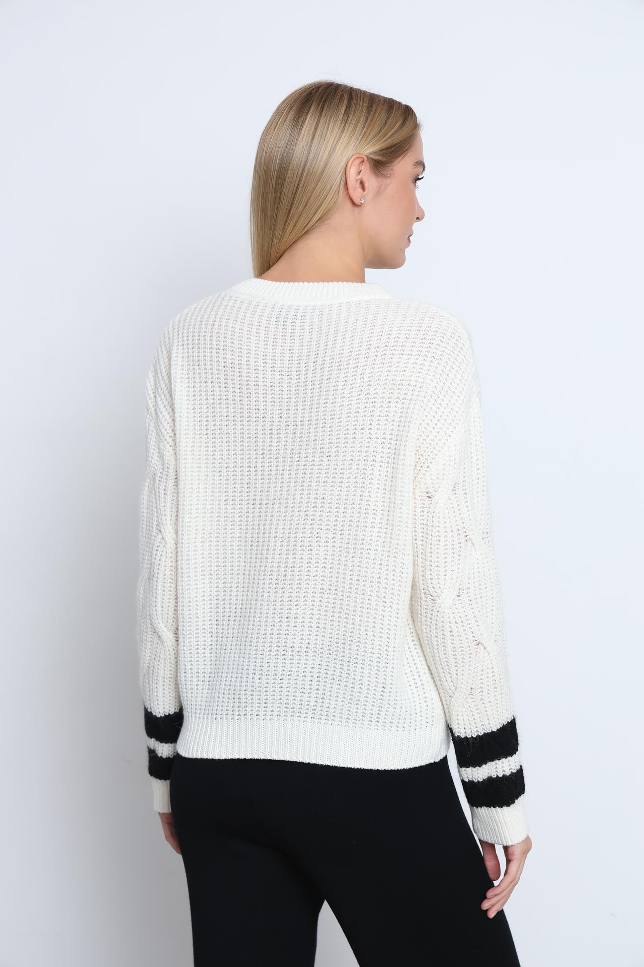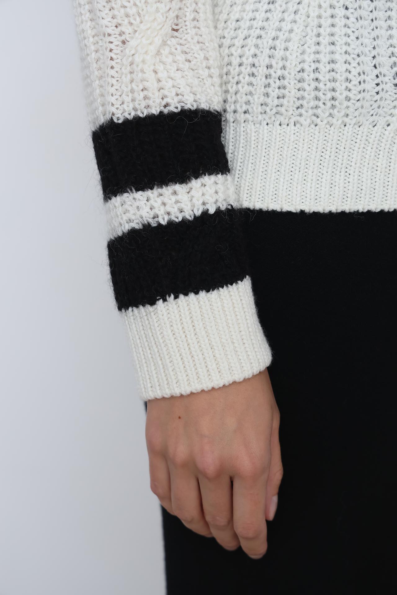 - Уникальный дизайн: Вязаный узор и полосы на рукавах придают пуловеру современный и запоминающийся вид.