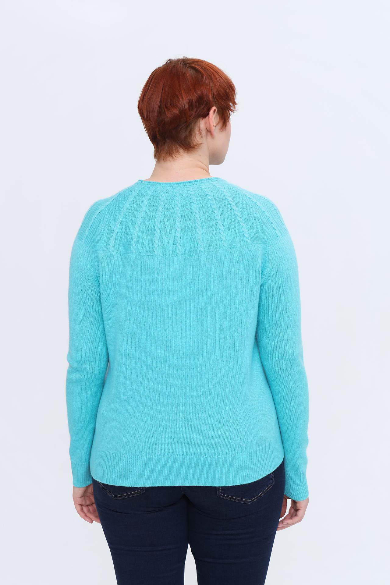 - Изысканный дизайн. Модель выполнена в нежном голубом цвете, дополнена оригинальным фактурным узором в области горловины и плеч, придающим пуловеру уникальный вид.