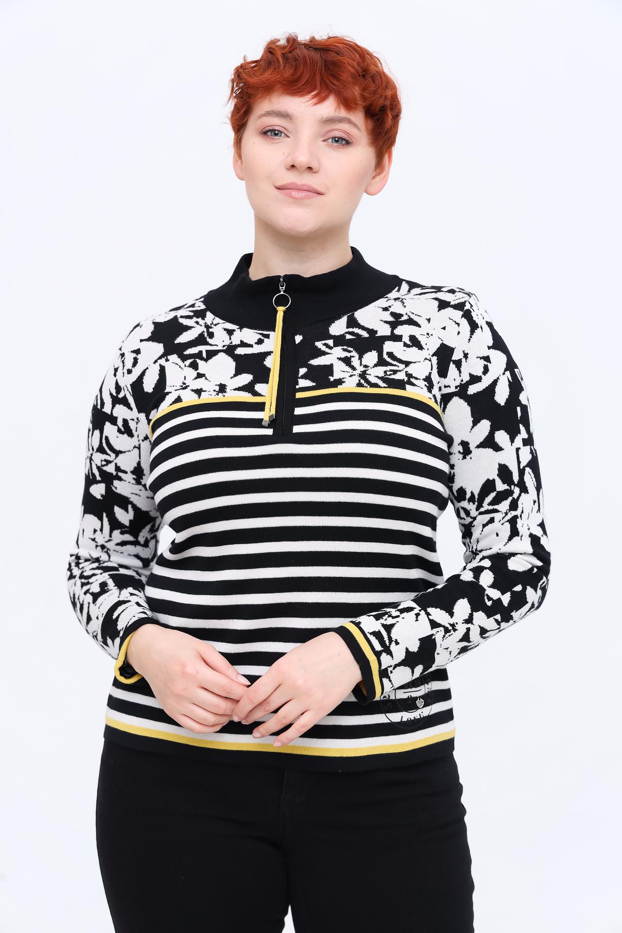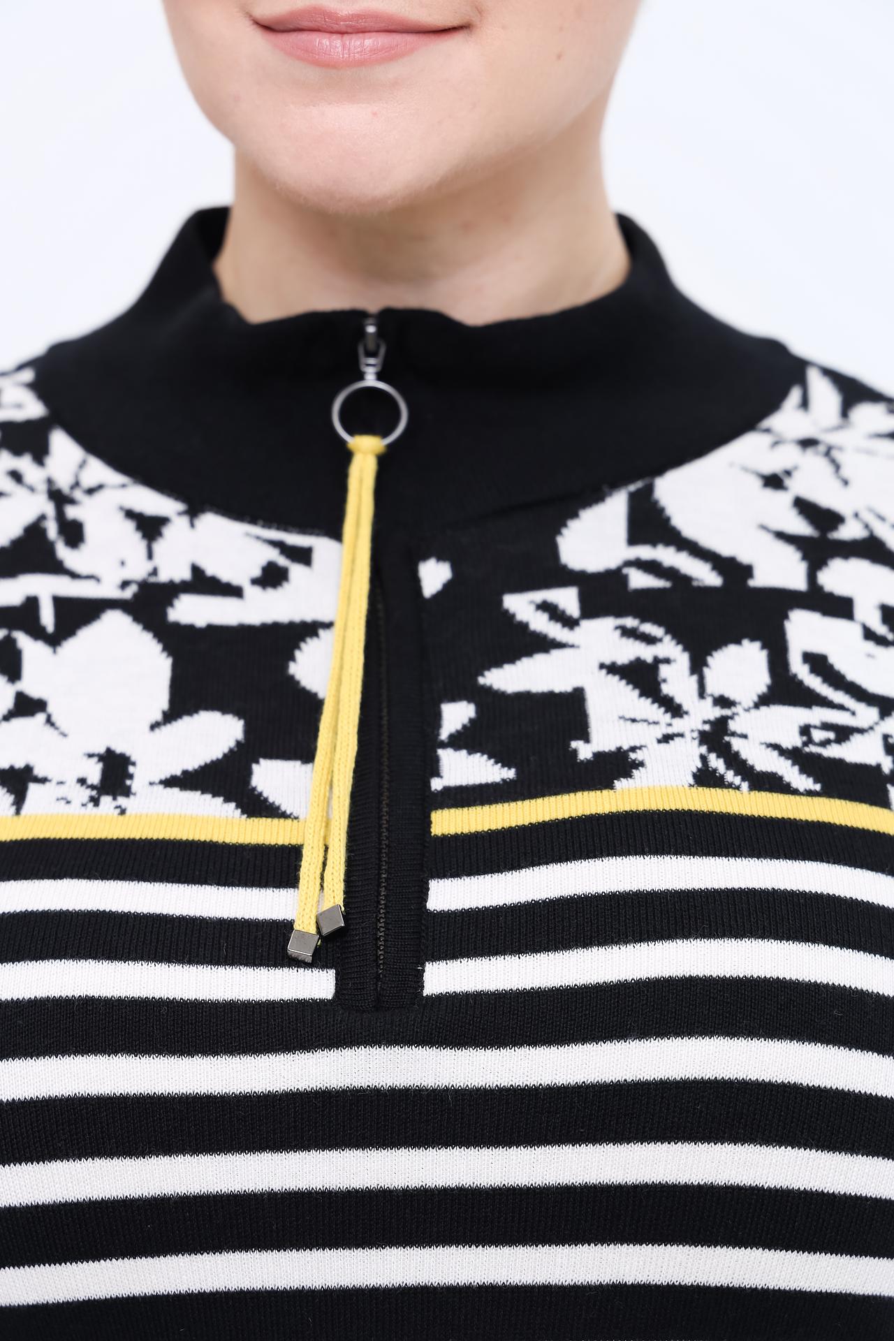 Дизайн пуловера приковывает взгляды: верхняя часть и рукава украшены контрастным чёрно-белым цветочным узором, а основная часть изделия дополнена горизонтальными чёрно-белыми полосками. Жёлтые акценты на молнии и по нижнему краю добавляют динамичности и свежести.