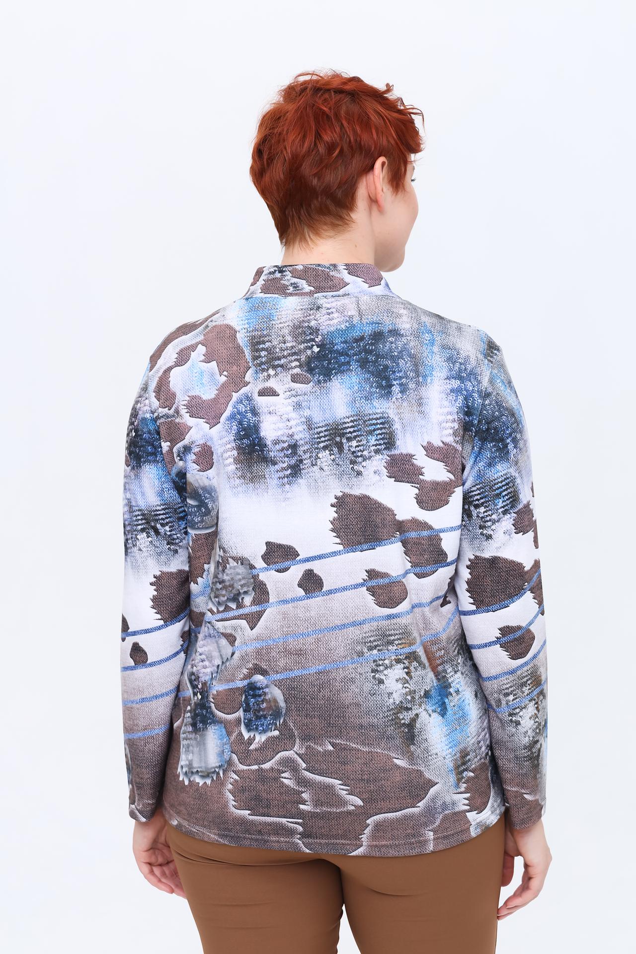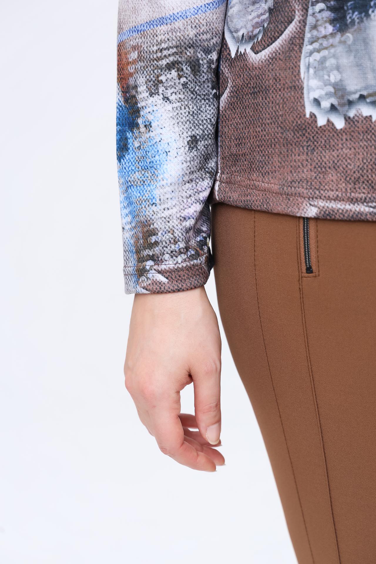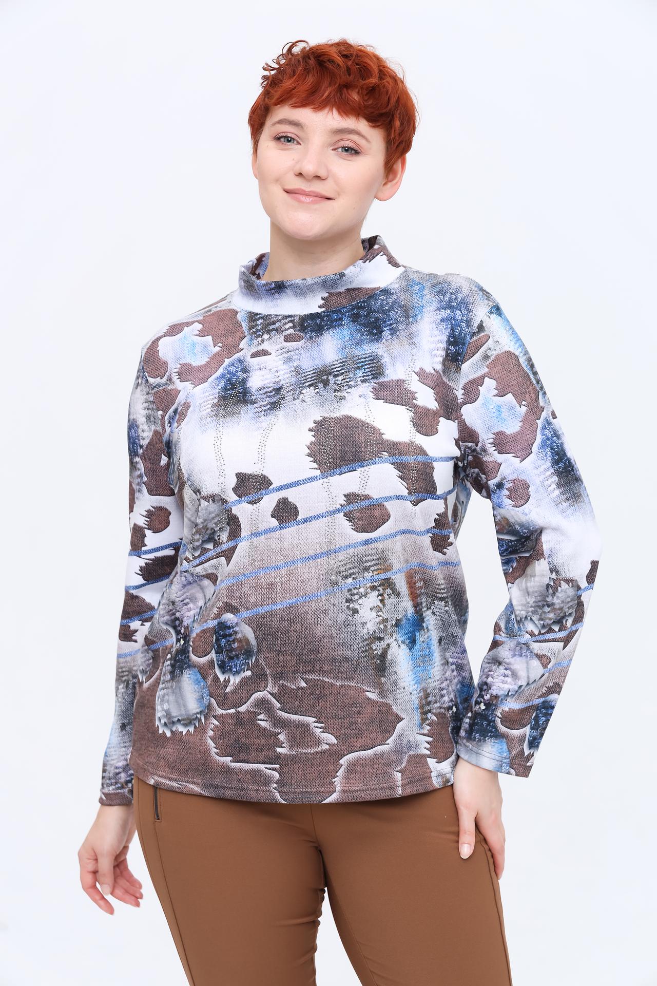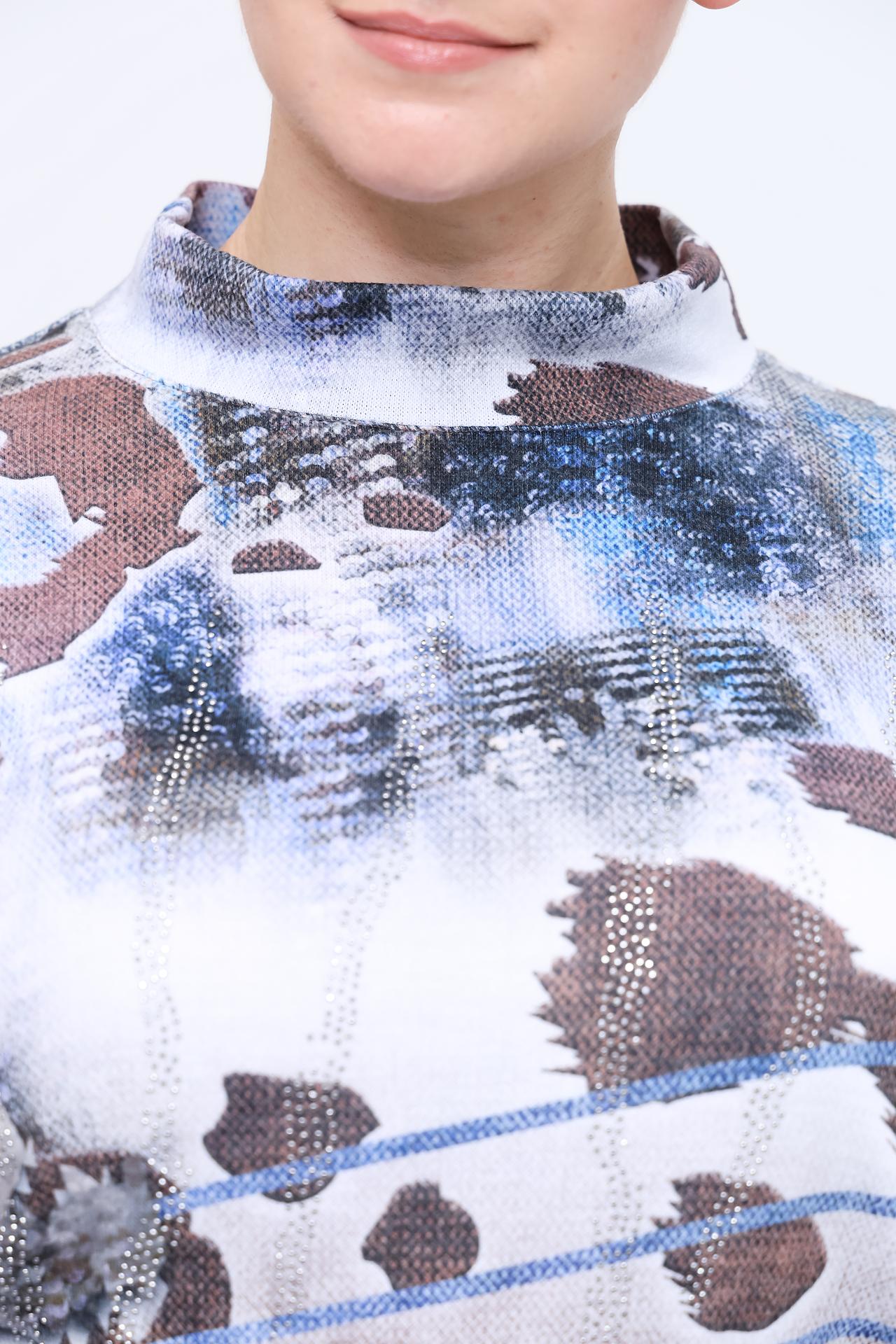 Элегантный женский пуловер Frank Walder – идеальное решение для создания стильного повседневного образа. Модель с высоким воротом и длинными рукавами выполнена из мягкого трикотажа, обеспечивающего комфорт в течение всего дня. Уникальный абстрактный принт в коричнево-синих тонах с белыми акцентами и сверкающим декором придает изделию особую выразительность и динамичность.