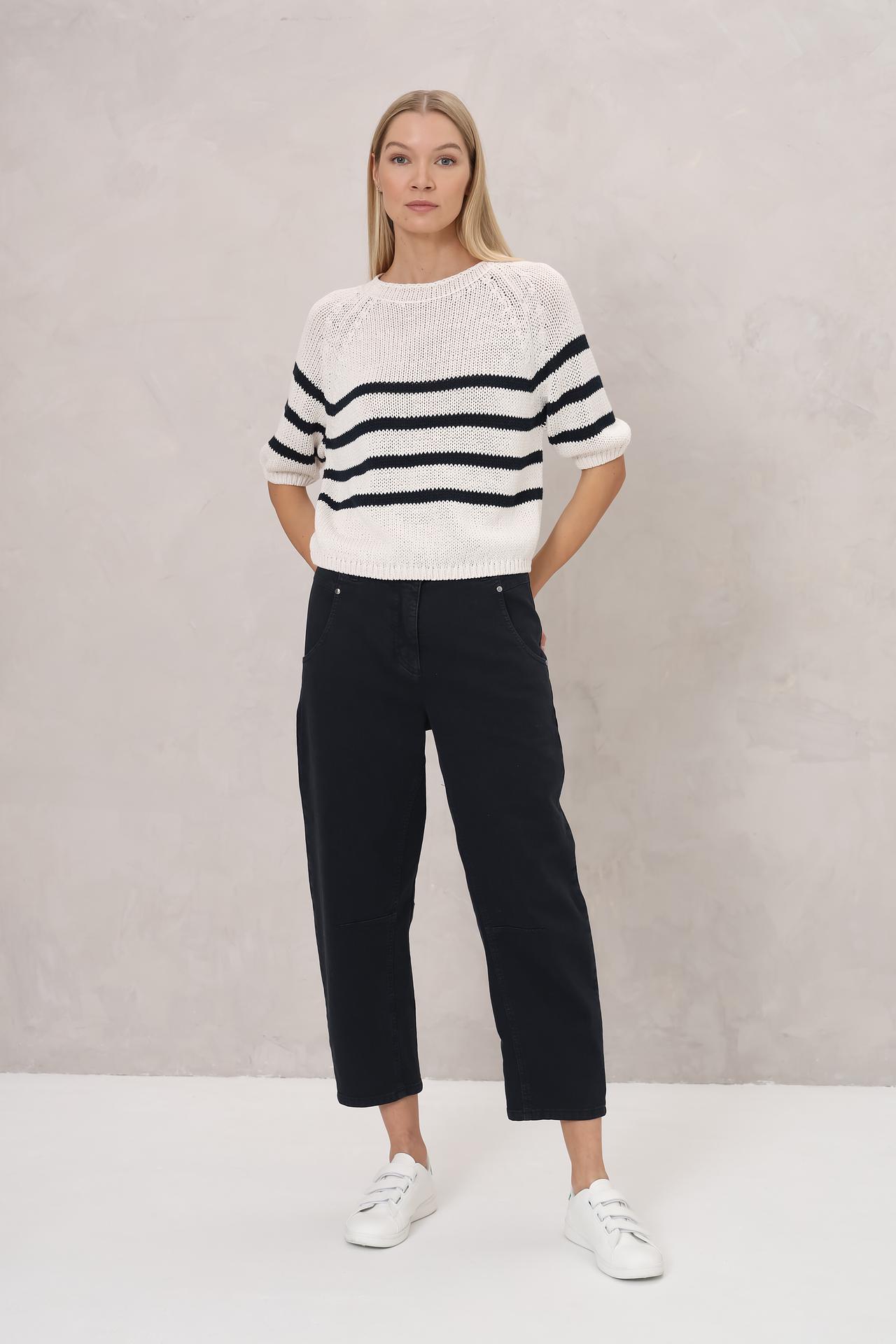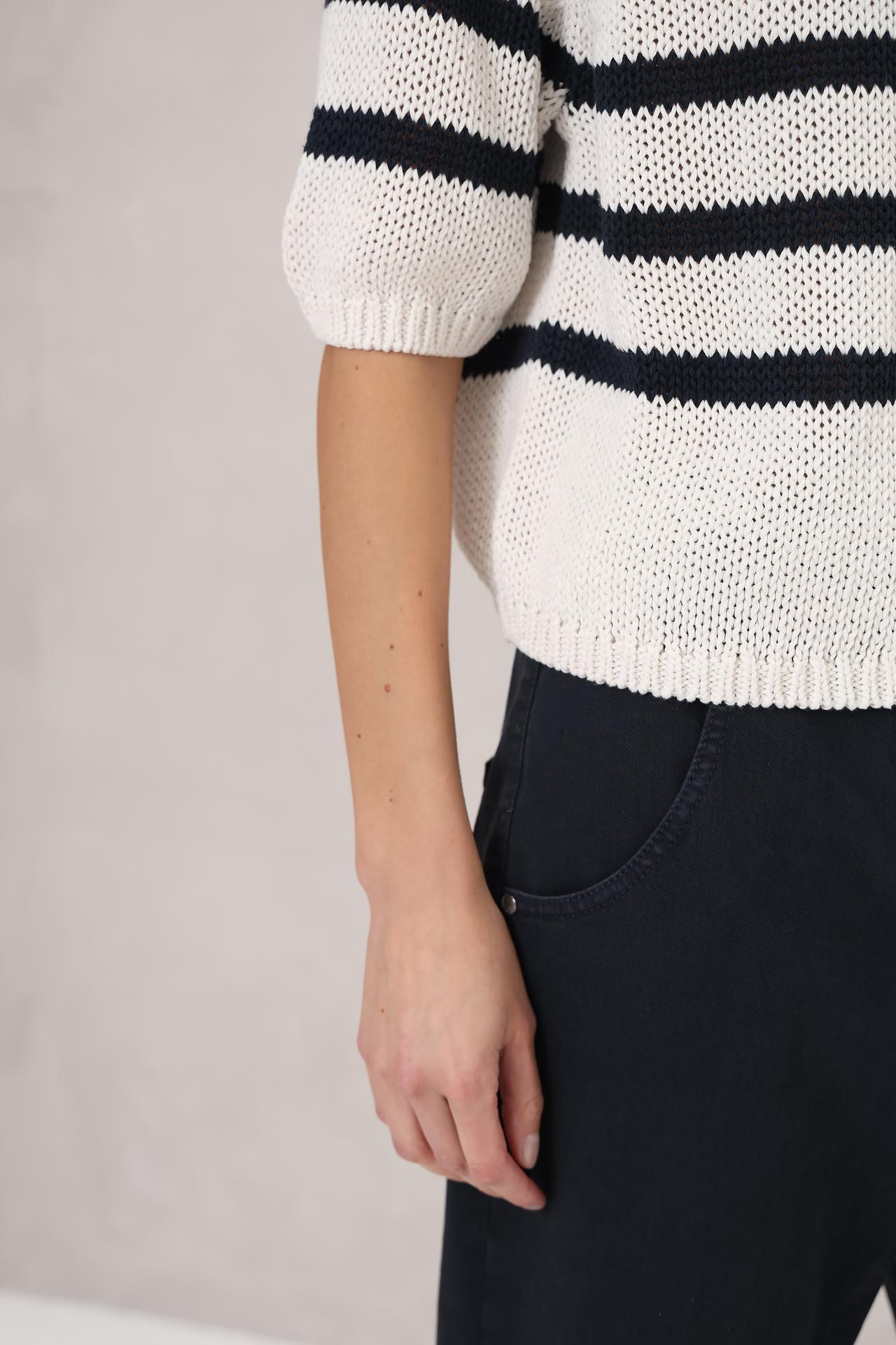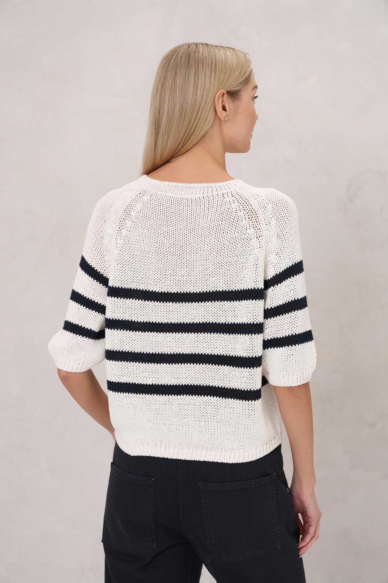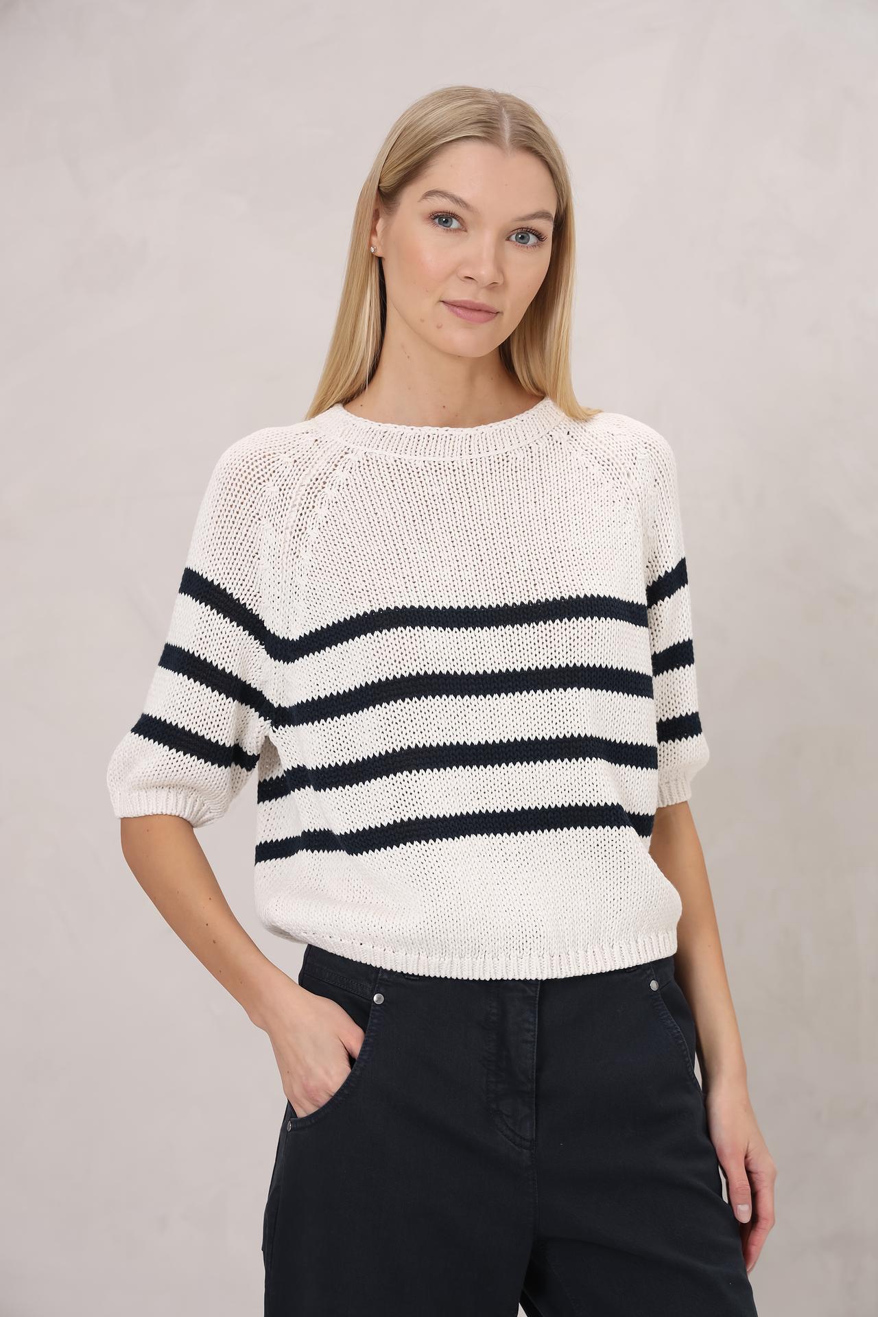 Элегантный женский пуловер от Luisa Cerano, выполненный из премиальной смесовой пряжи (27% полиамид, 33% хлопок, 40% лен). Этот вязаный джемпер с короткими рукавами и круглым вырезом горловины станет незаменимой частью вашего гардероба. Свободный крой обеспечивает комфорт и свободу движений, а стильный дизайн в полоску добавляет образу изысканности и актуальности.
