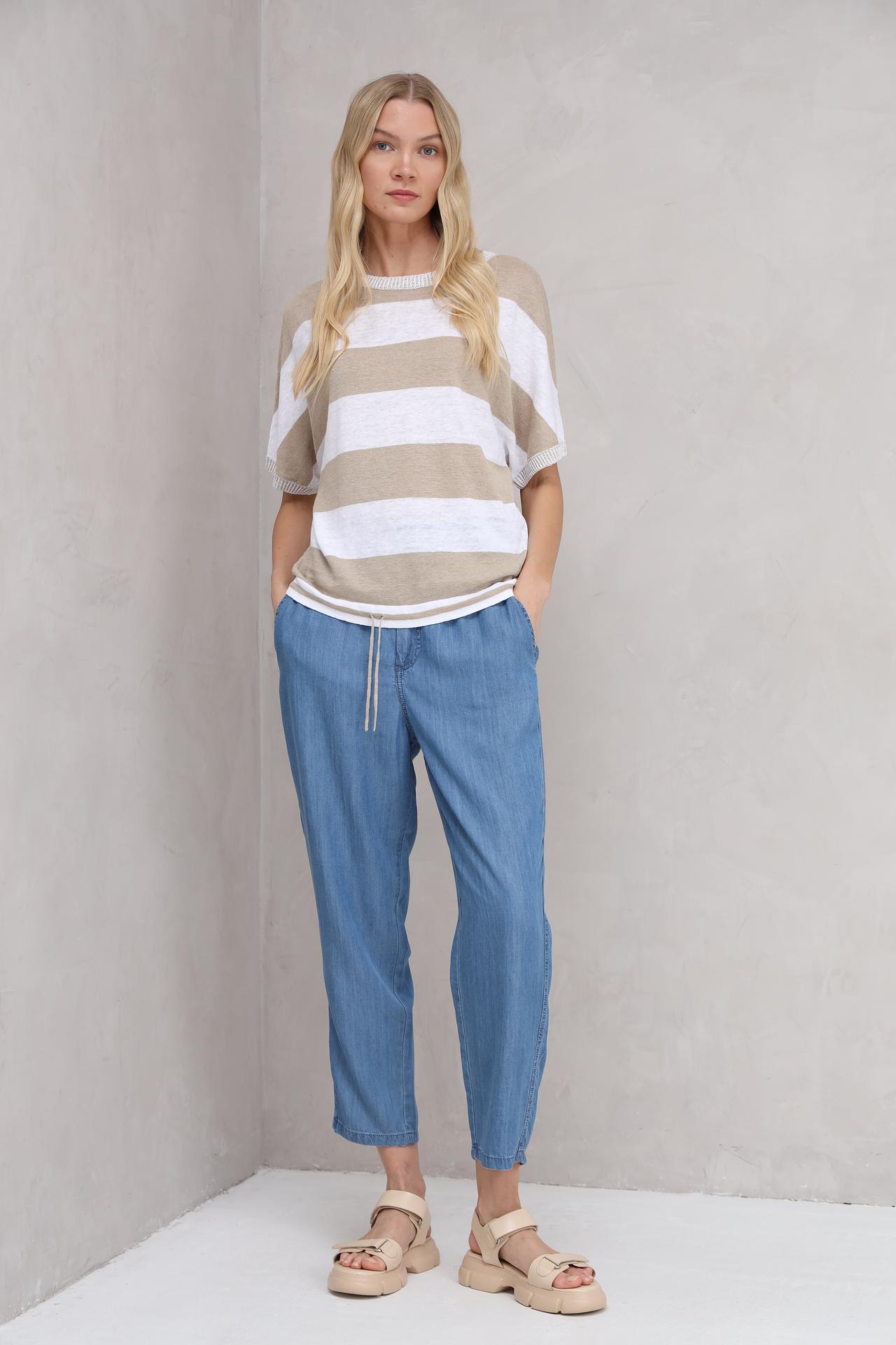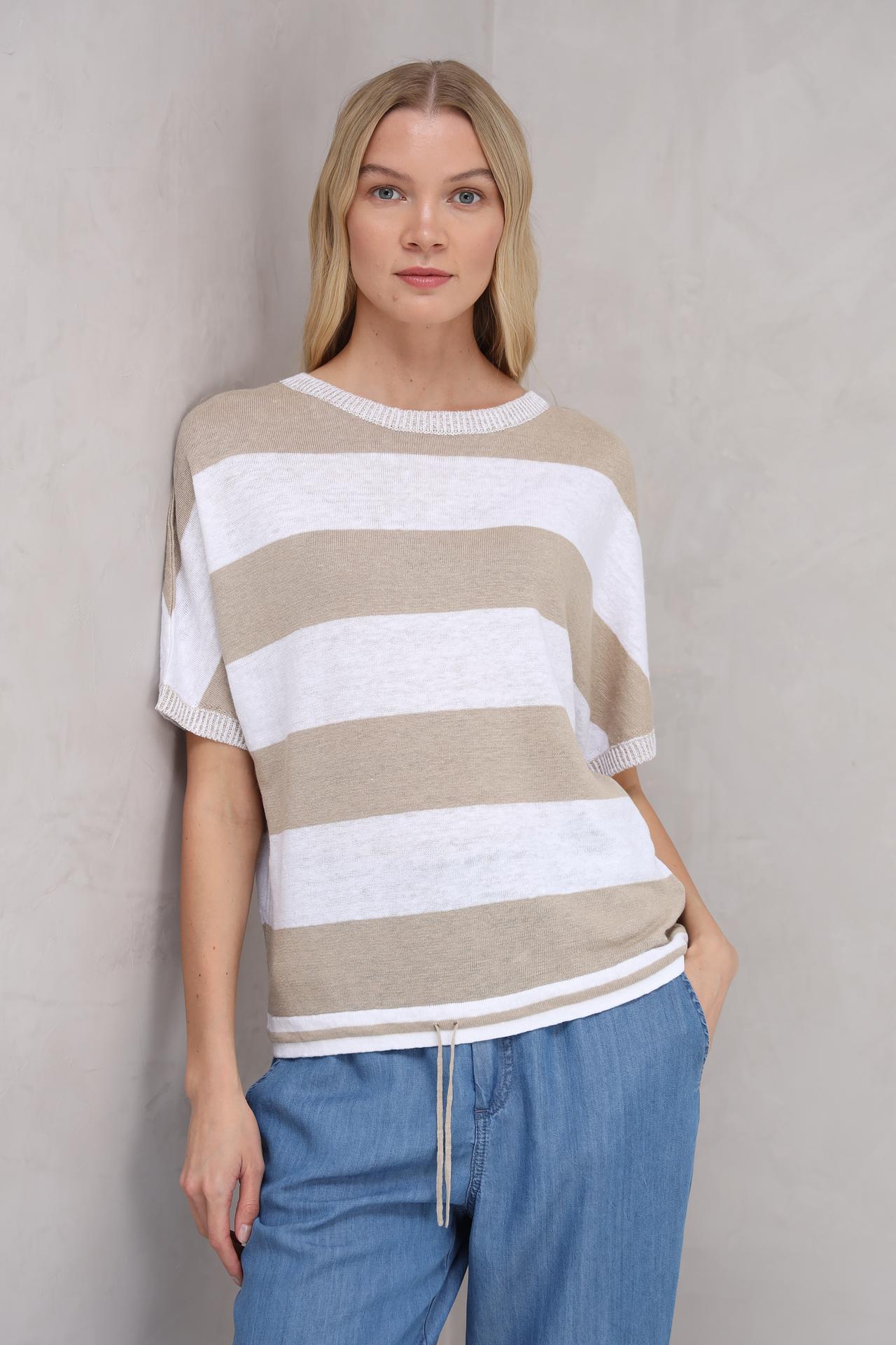 Элегантный женский пуловер от бренда Oui, выполненный из 100% натурального льна, станет незаменимой вещью в вашем гардеробе. Лёгкий и дышащий материал идеально подходит для тёплой погоды, обеспечивая комфорт в течение всего дня. Пуловер имеет прямой силуэт и короткие рукава, что делает его универсальным выбором для создания разнообразных образов. Горизонтальные полосы бежевого и белого цветов добавляют изысканности и делают этот пуловер актуальным для любого случая.