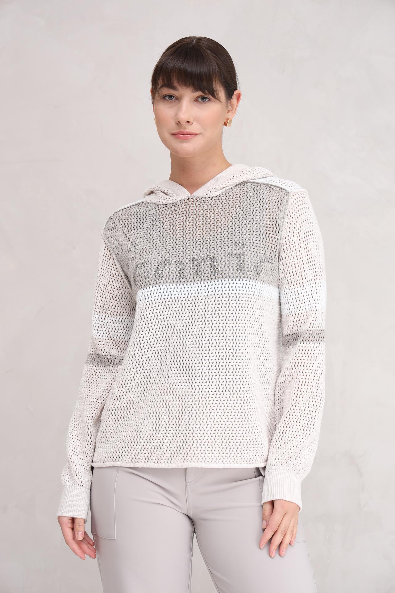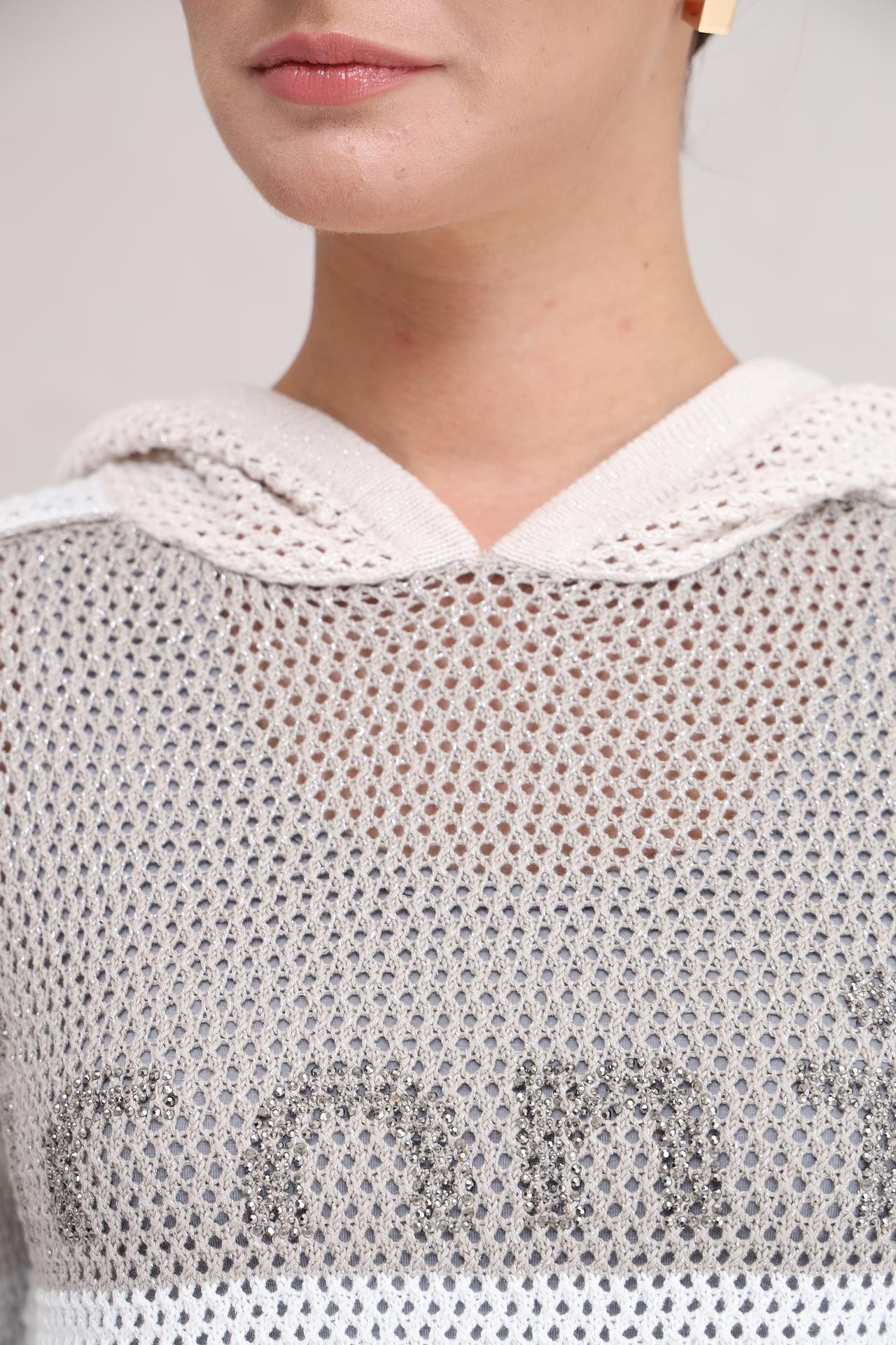 Дизайн пуловера сочетает в себе элегантность и современность. Белый цвет изделия с декоративными элементами из металлизированной нити делает его универсальным, подходящим для любого случая. Свободный крой обеспечивает свободу движений и комфорт в течение всего дня.