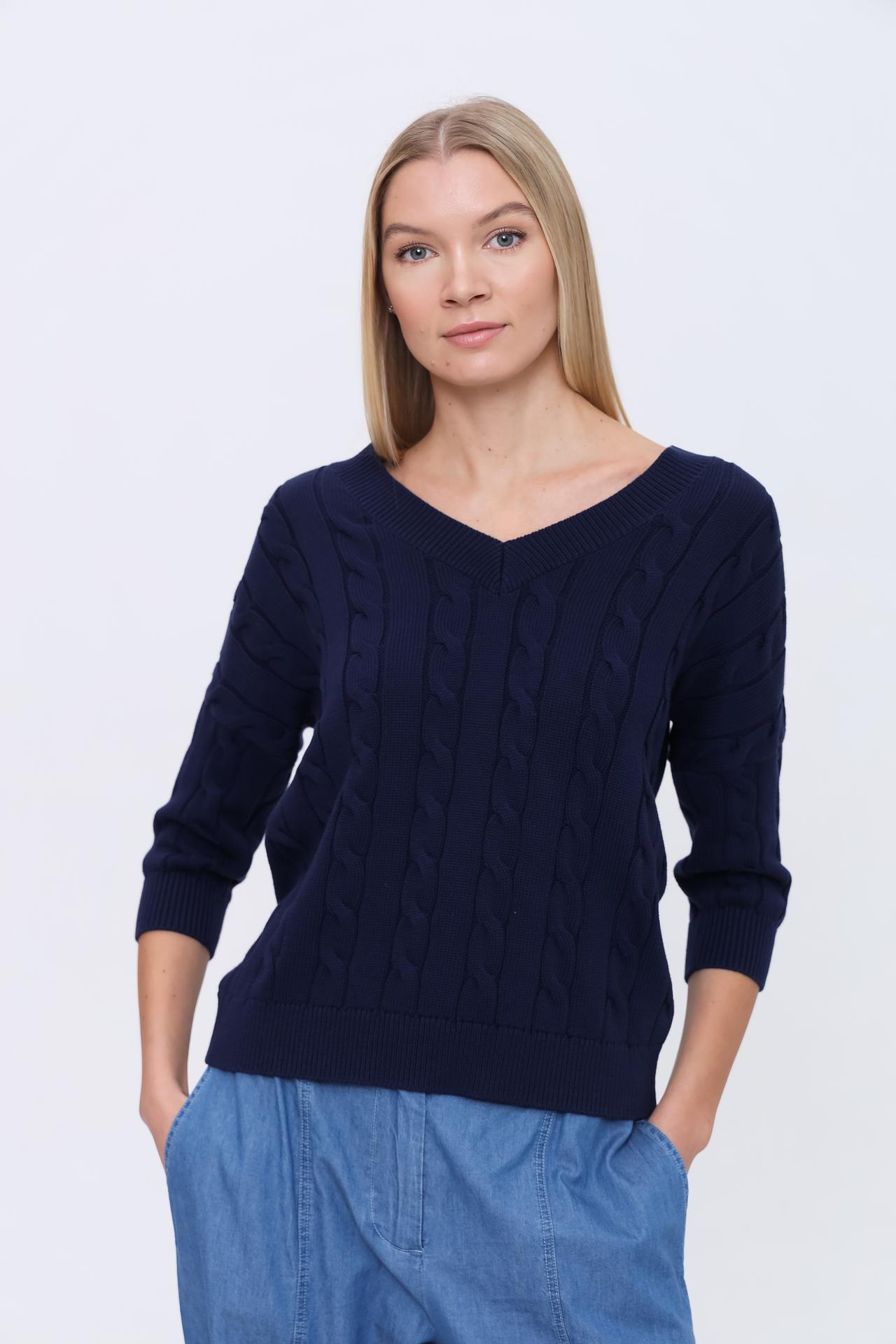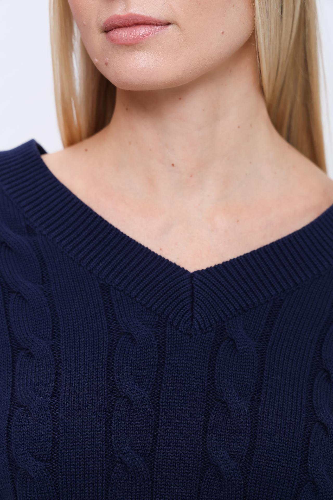 - Дизайн: Классический синий пуловер с глубоким V-образным вырезом и изящным узором "косы" по всей поверхности создает стильный и универсальный вид. Дизайн позволяет легко комбинировать его с различными элементами гардероба.