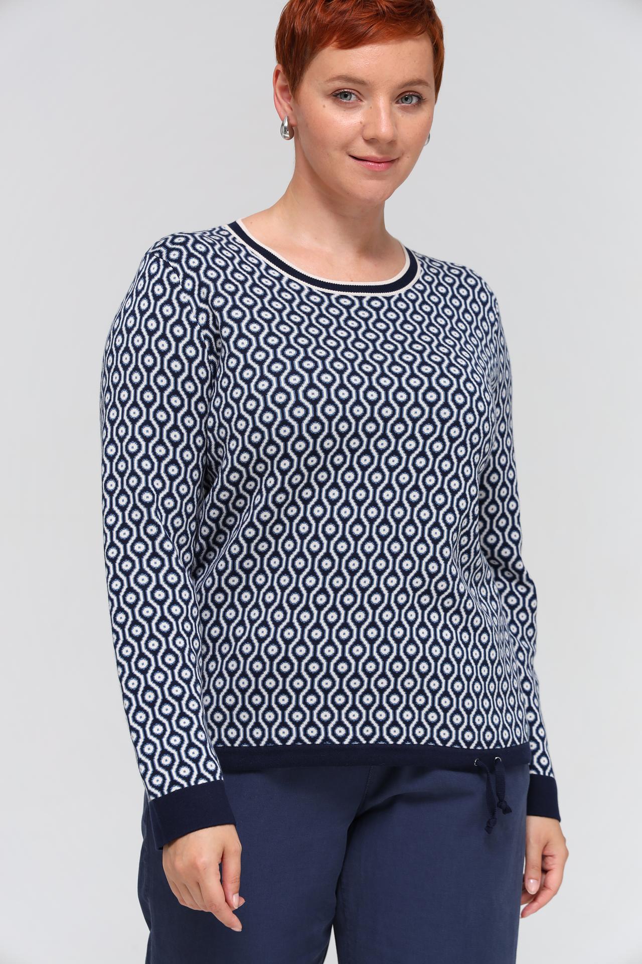 Стильный женский пуловер Olsen выполнен из высококачественного трикотажа, сочетающего натуральный хлопок и практичный акрил. Уютный джемпер с длинными рукавами и округлым вырезом горловины украшен оригинальным тёмно-синим с белым геометрическим узором, который придает модели динамичный и современный вид.
