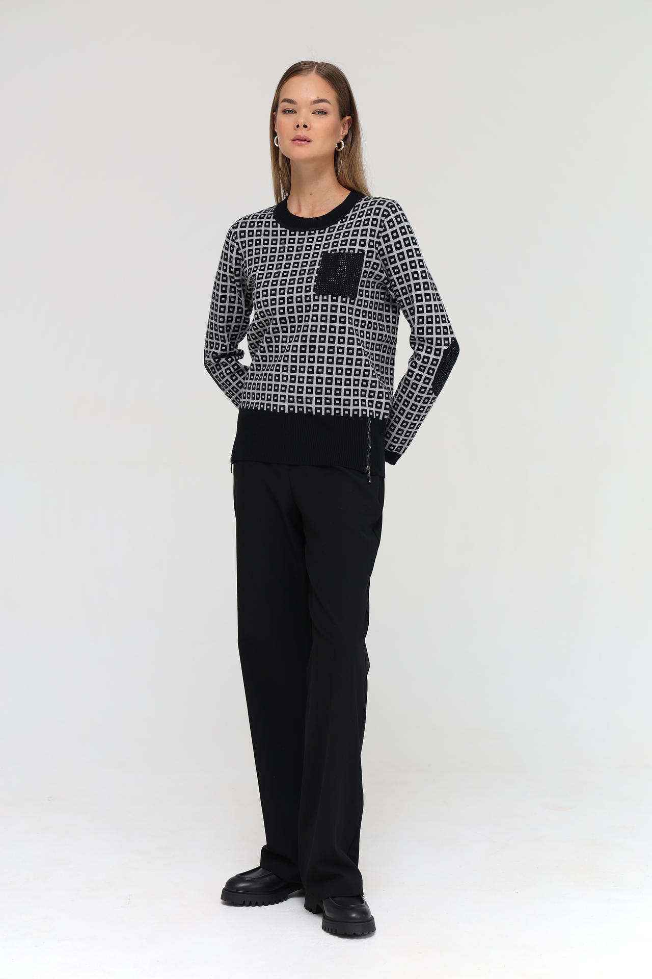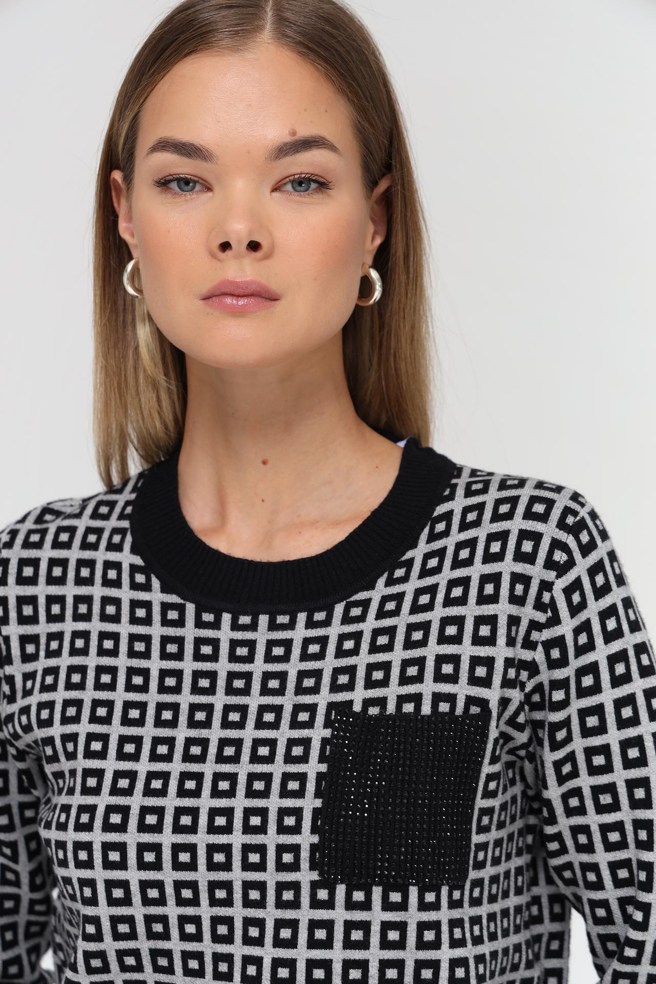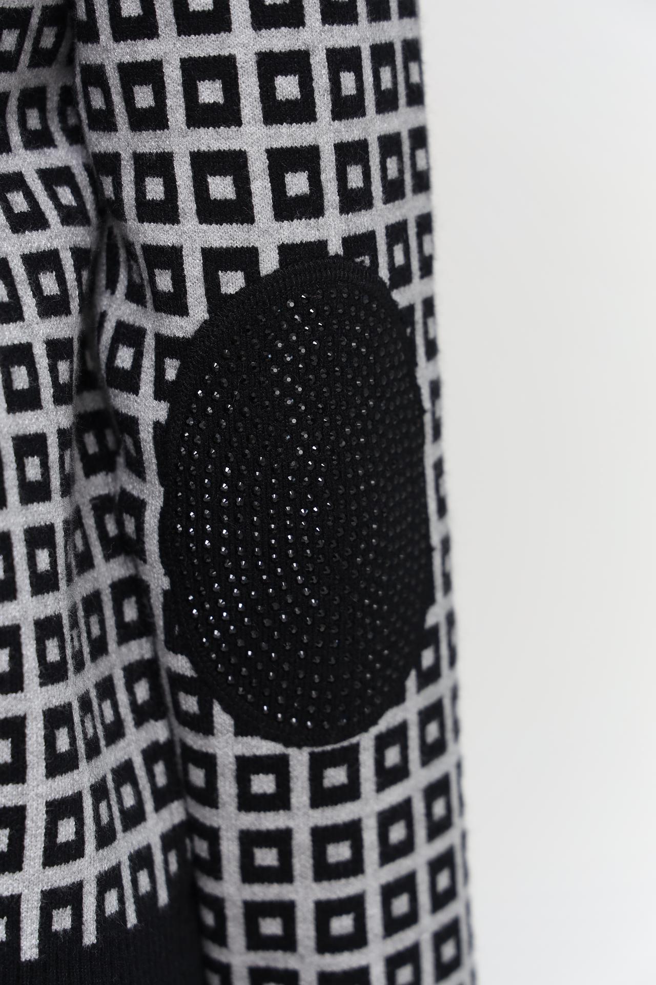 Модель выполнена в классическом дизайне с геометрическим принтом в виде ромбов, выполненным в сером и черном цветах. Акценты из страз на накладном кармане и на локтях добавляют изделию изысканности и привлекательности. Застежка-молния на спине обеспечивает удобство при надевании.