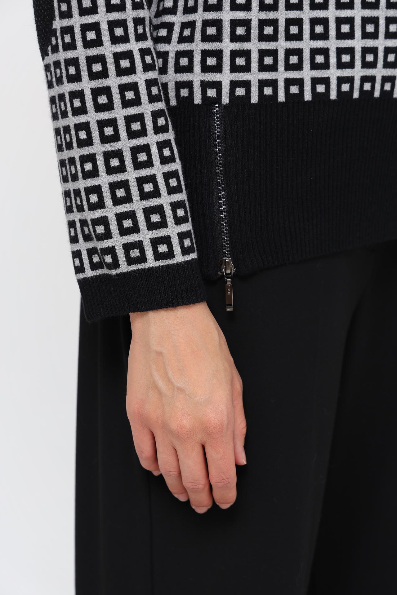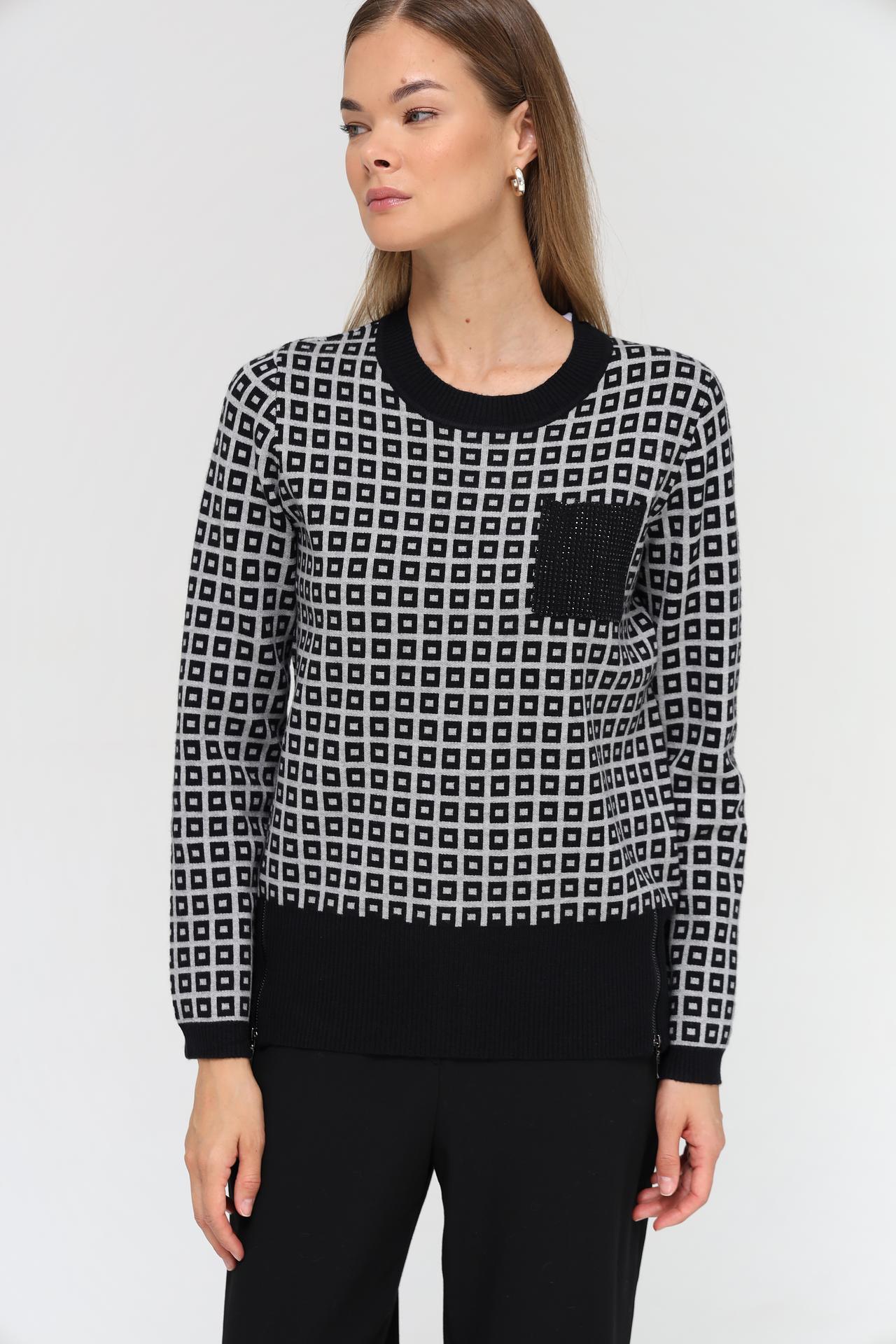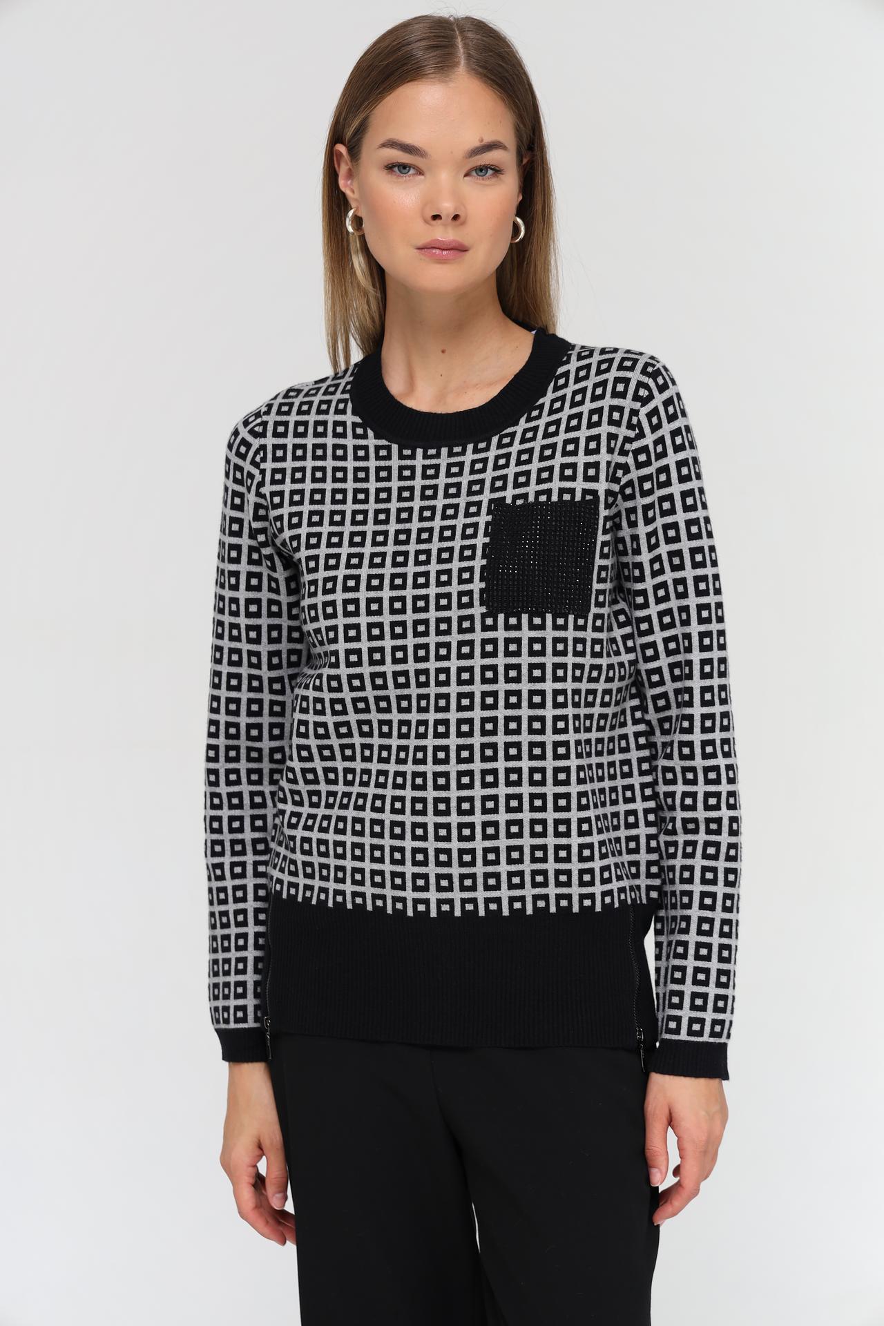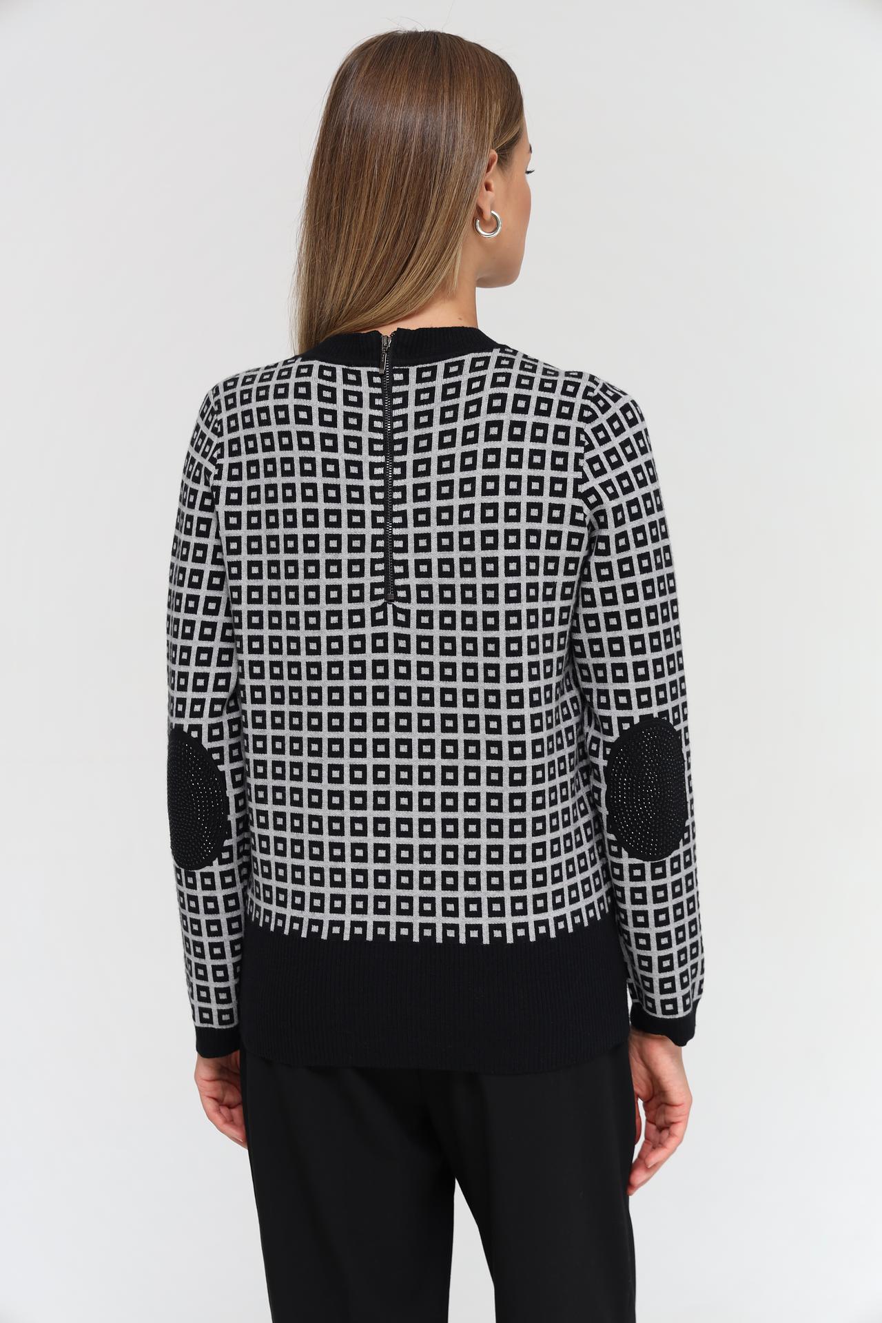 Модель выполнена в классическом дизайне с геометрическим принтом в виде ромбов, выполненным в сером и черном цветах. Акценты из страз на накладном кармане и на локтях добавляют изделию изысканности и привлекательности. Застежка-молния на спине обеспечивает удобство при надевании.