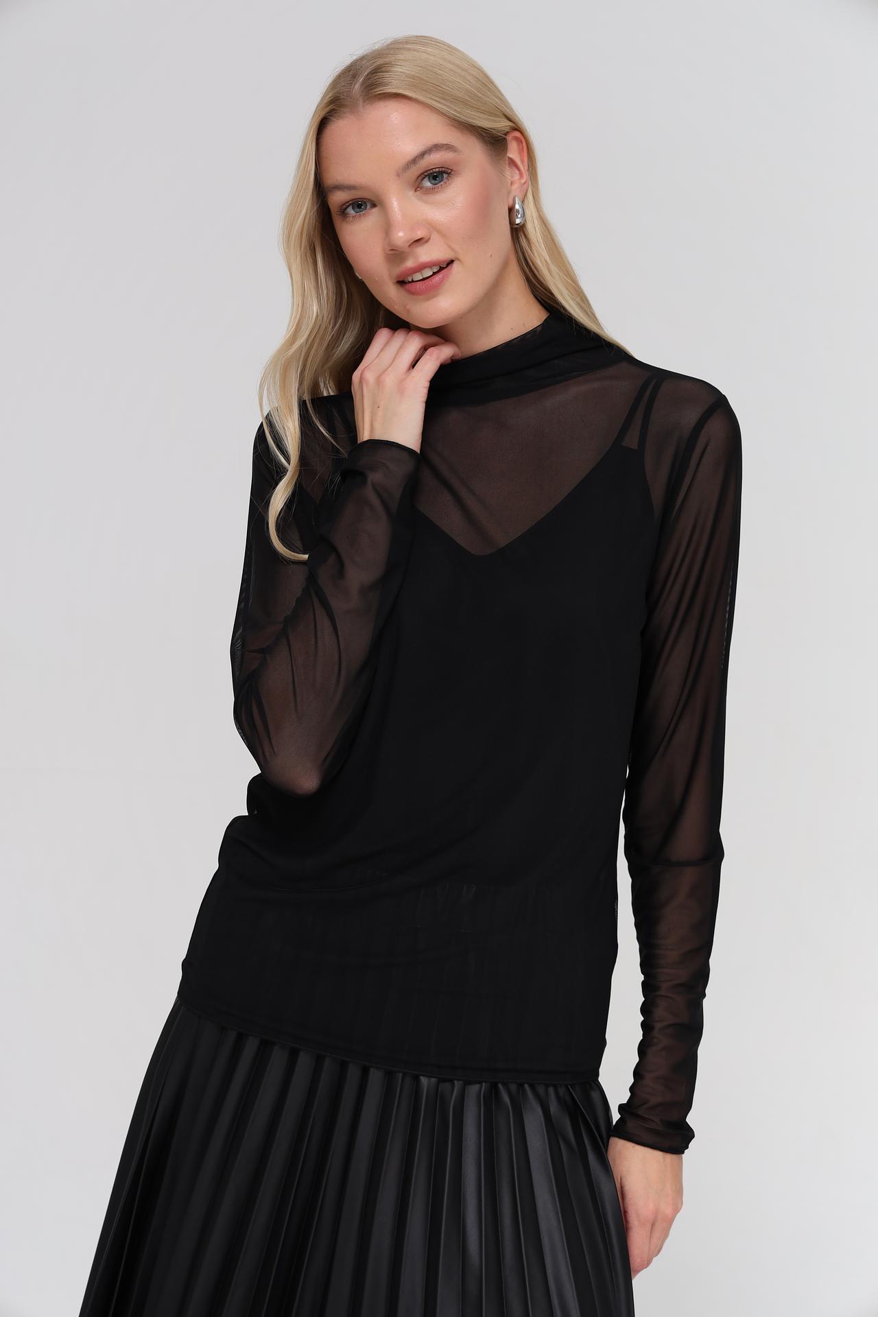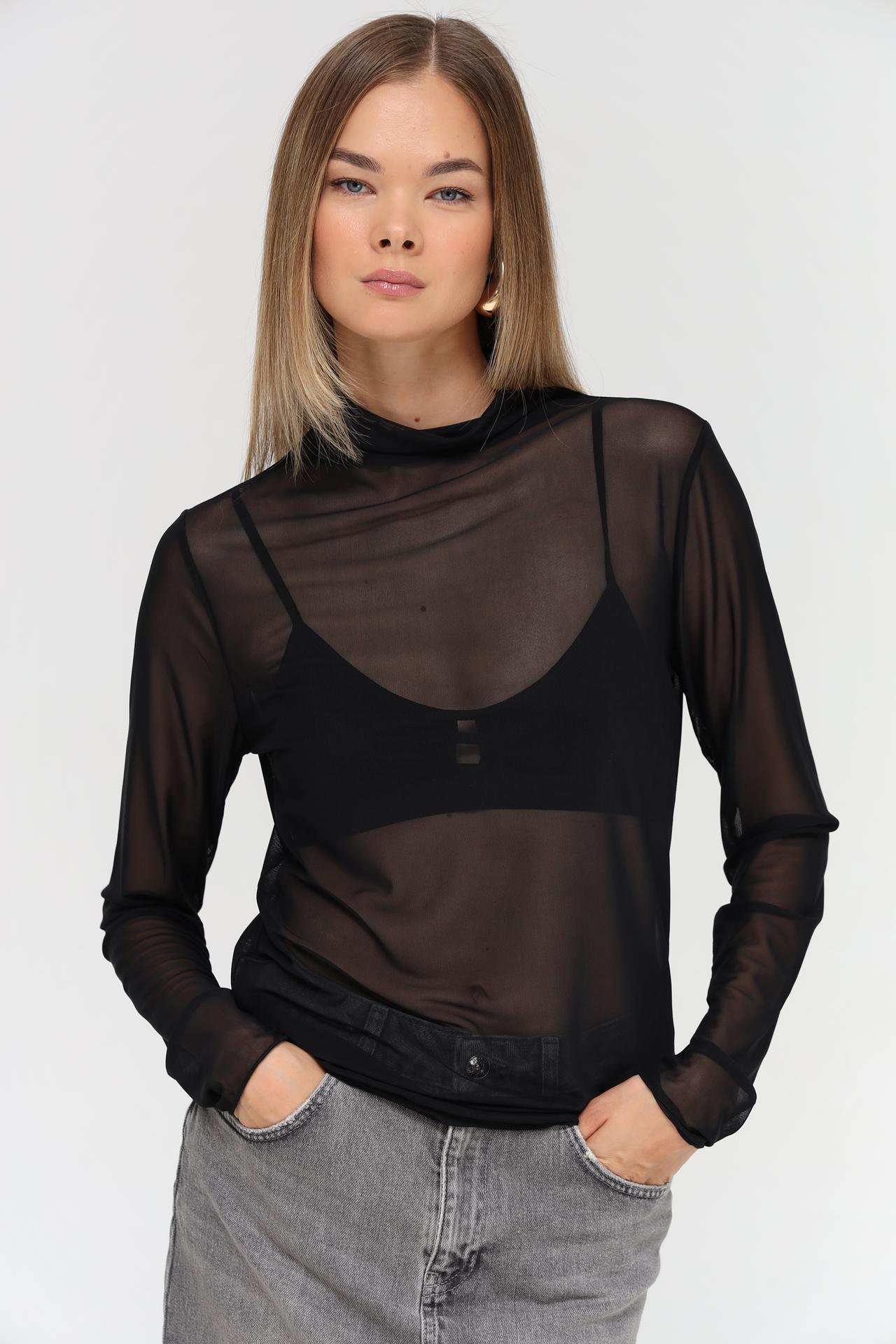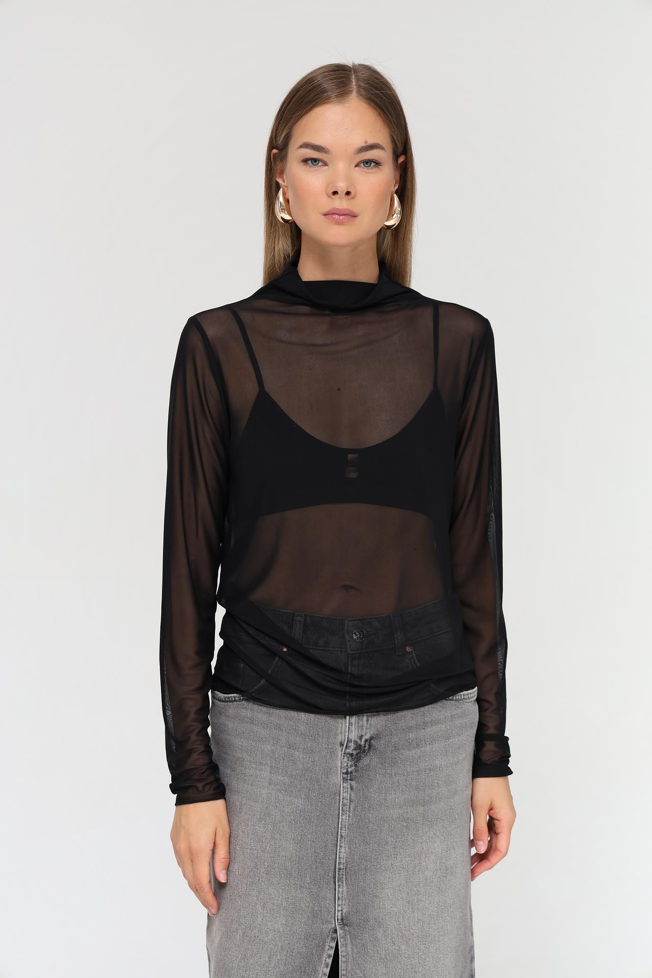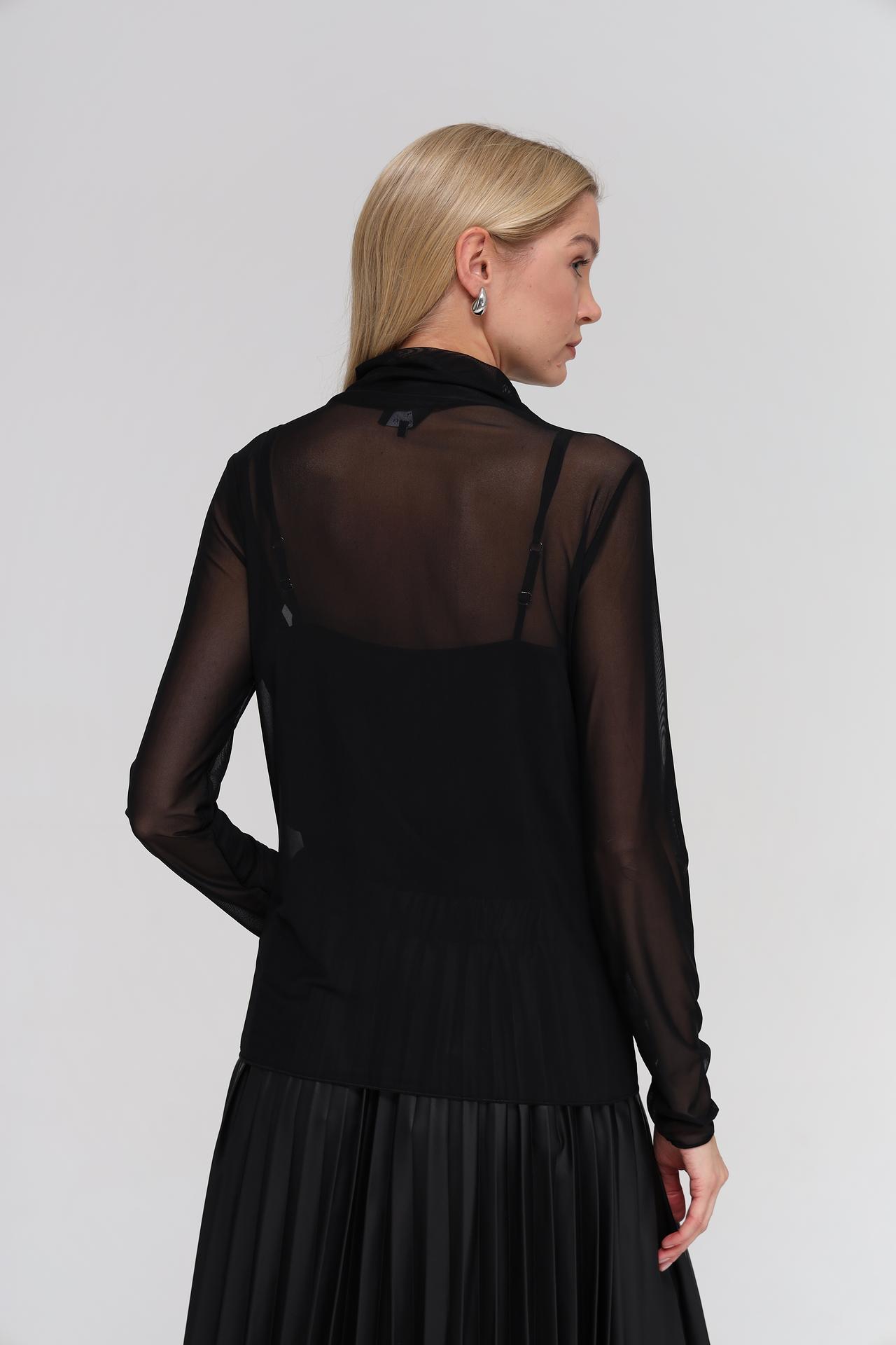 - Дизайн: Высокий воротник-гольф придает образу утонченность и элегантность. Прозрачная ткань добавляет пикантности и позволяет экспериментировать с нижним слоем одежды, создавая разнообразные стилистические решения.
