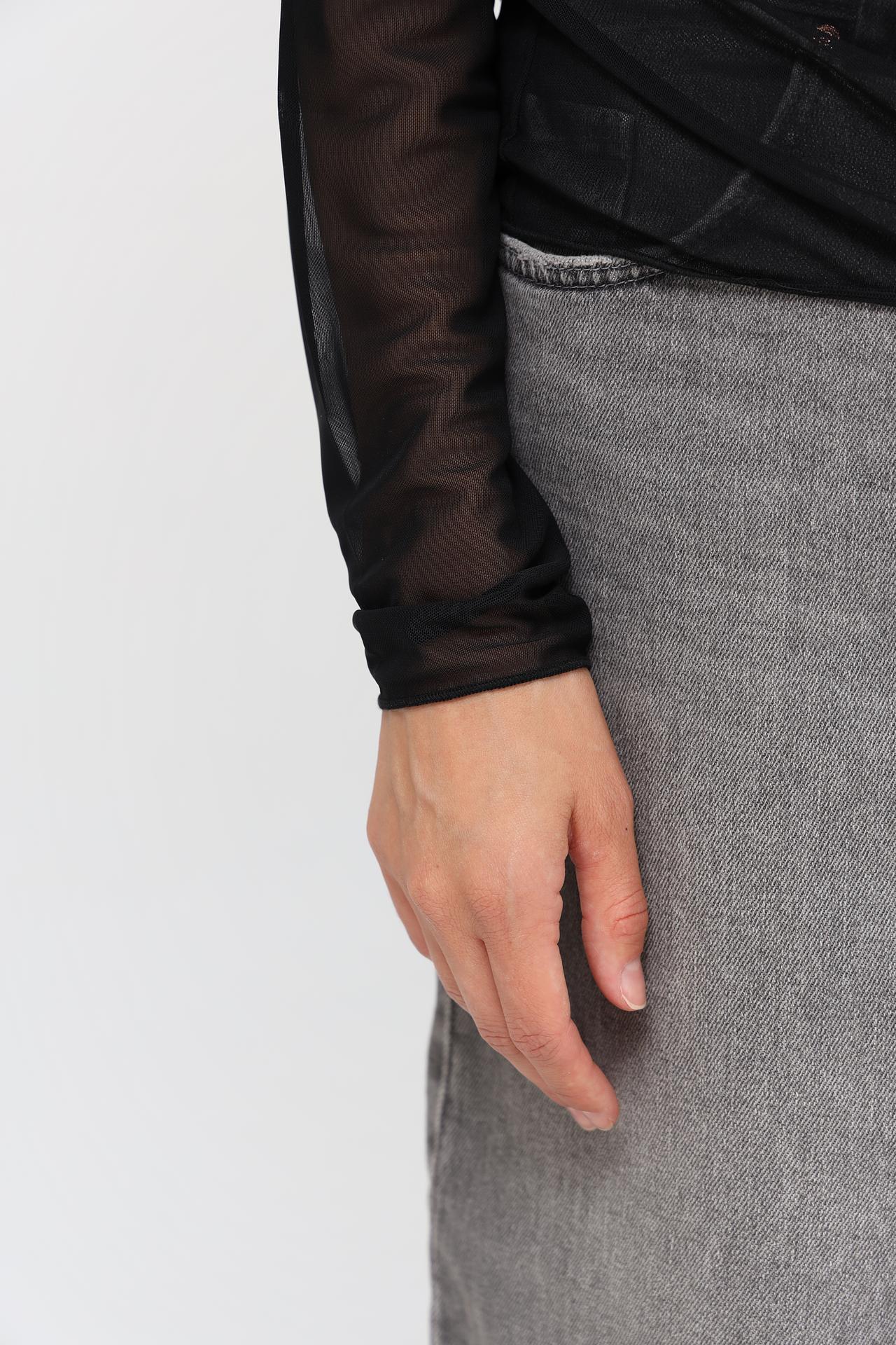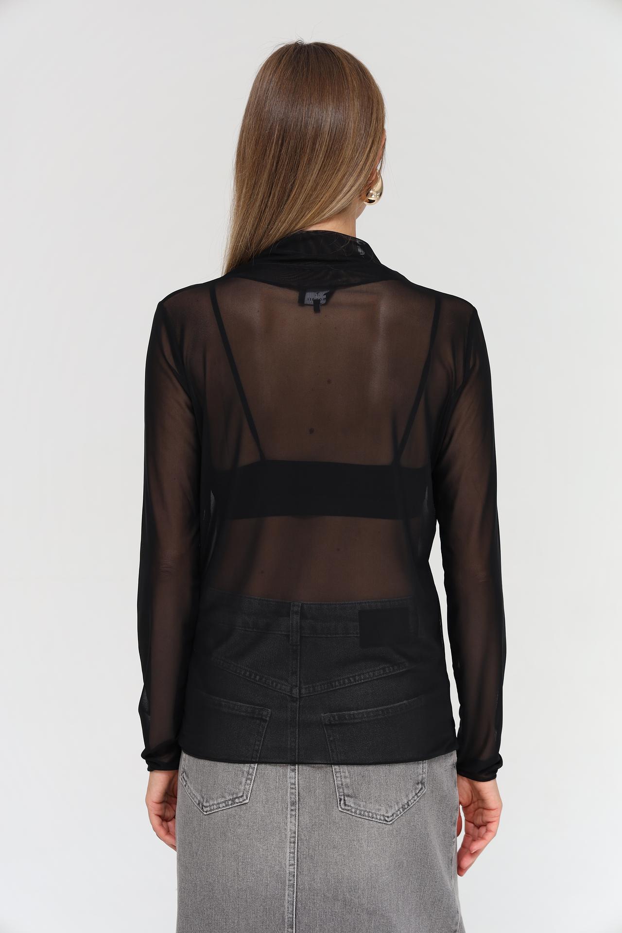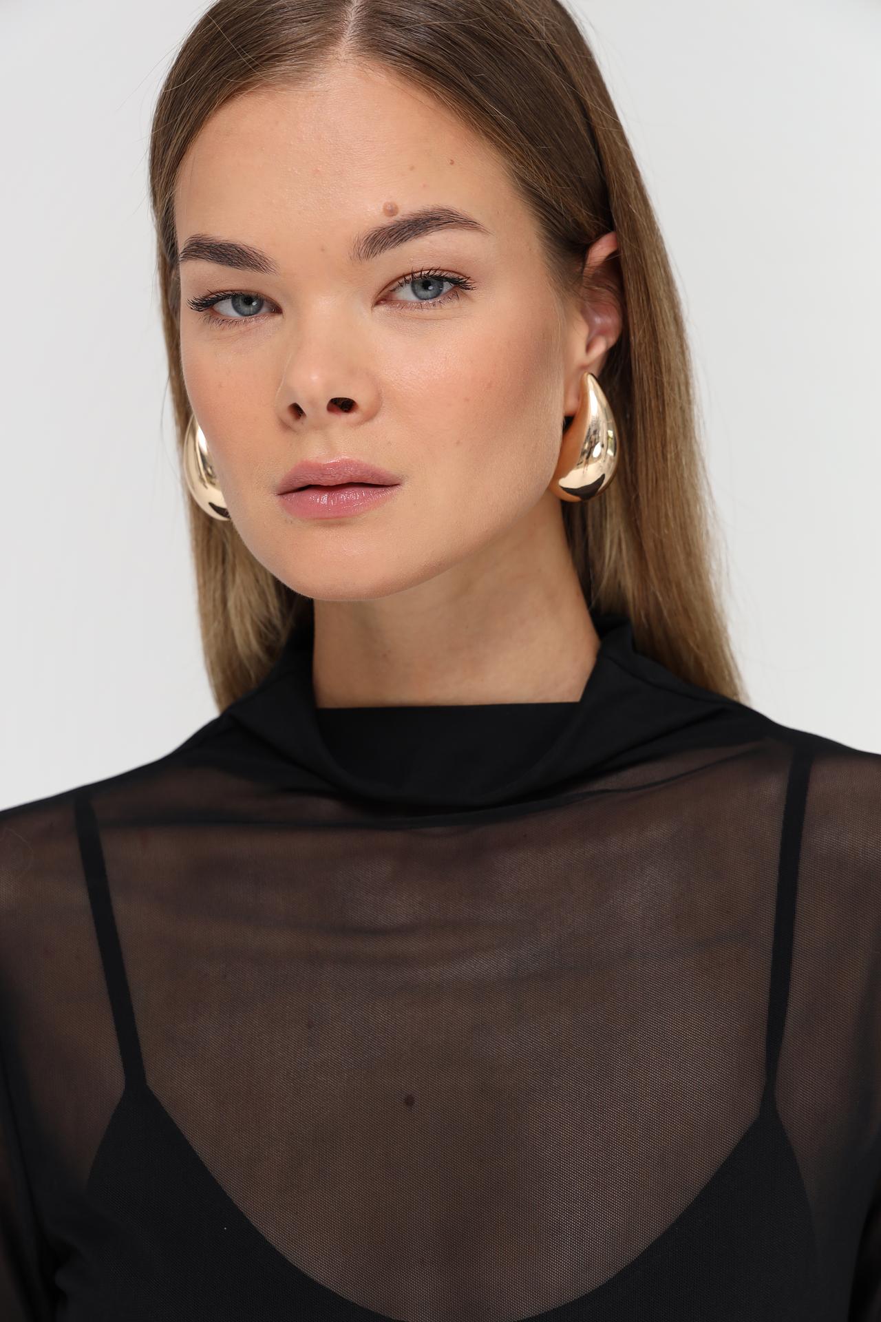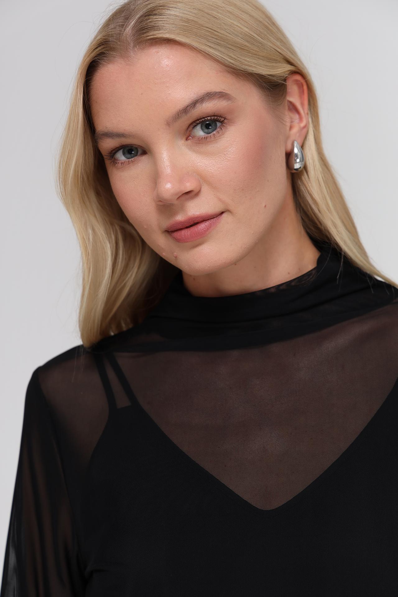 - Дизайн: Высокий воротник-гольф придает образу утонченность и элегантность. Прозрачная ткань добавляет пикантности и позволяет экспериментировать с нижним слоем одежды, создавая разнообразные стилистические решения.