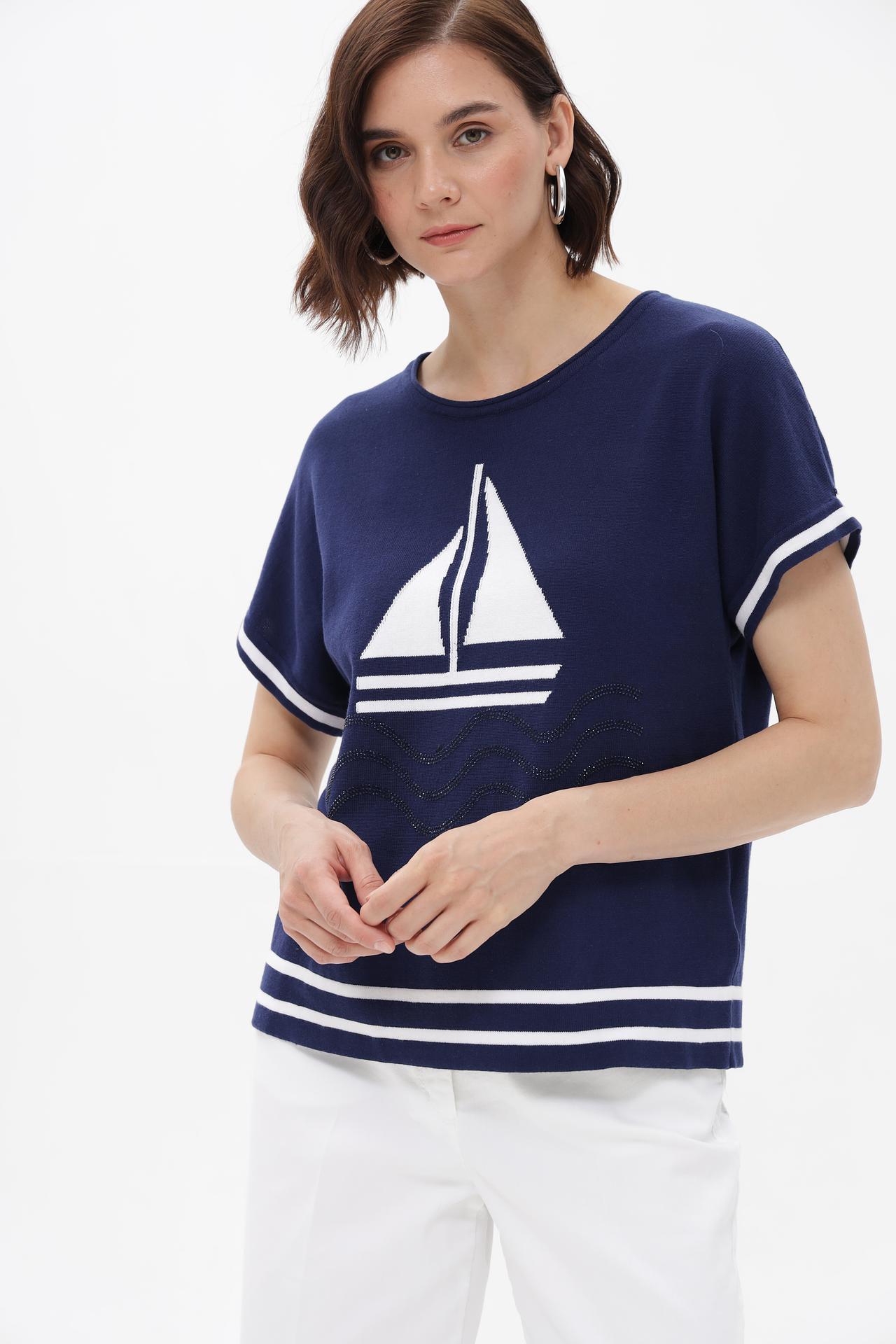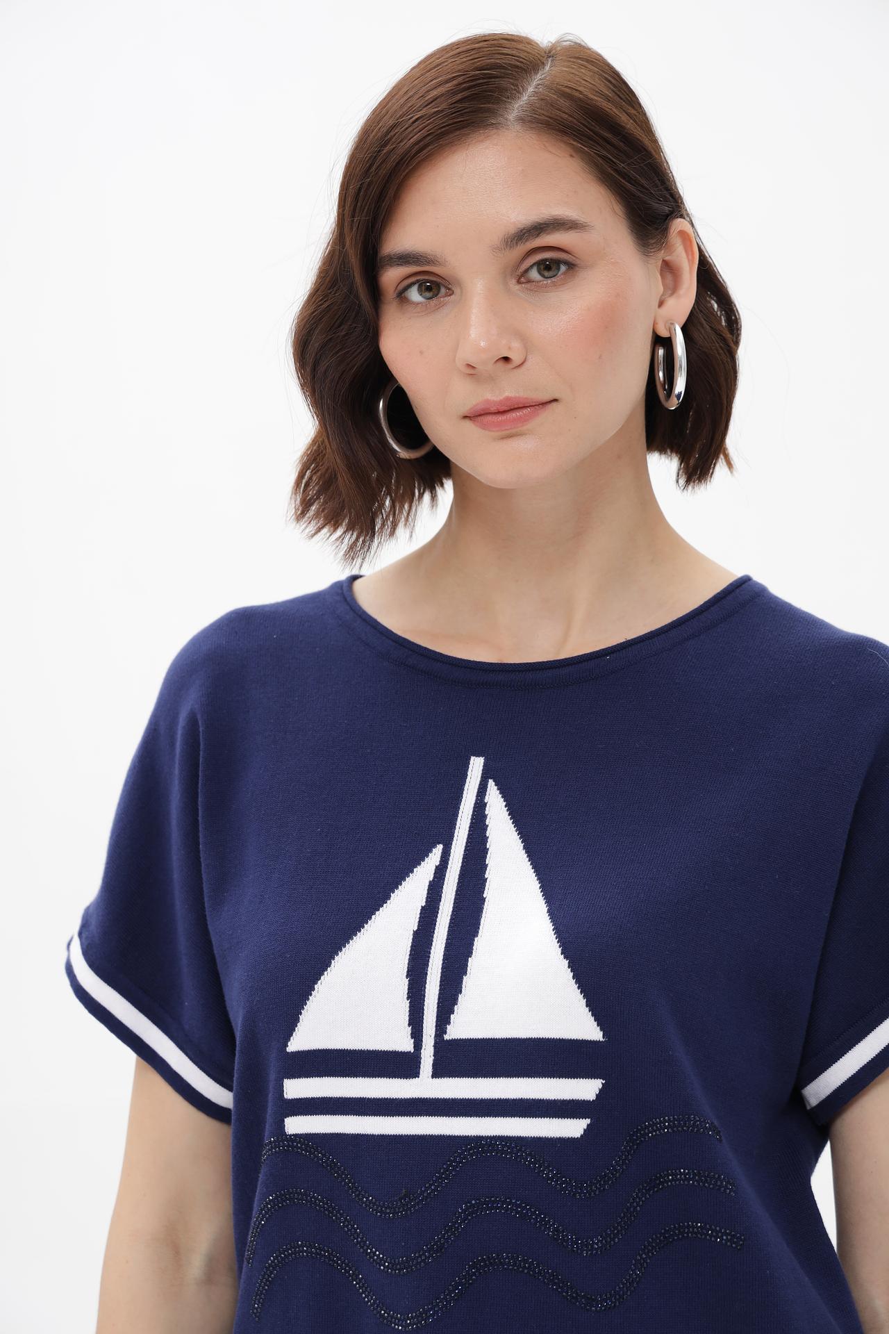 - Уникальный дизайн. Рисунок парусника и декоративные элементы выделяют этот пуловер среди других моделей.